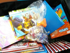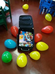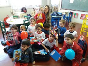 Repentinamente, enquanto as crianças lanchavam, apareceu uma mala misteriosa na sala. E, para a surpresa de todos, dentro dela havia doces, balões e os cadernos de tarefa dos alunos!