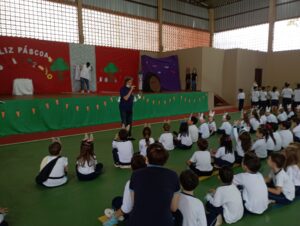 Conforme a letra de uma música cantada pelos alunos, “Páscoa é, antes de tudo, alegria em nossos corações”. Por isso, nesse dia 13 de abril de 2022, a quadra da Escola Nossa Senhora Aparecida tornou-se palco para uma grande festa marcada pela fala da Irmã Hilda e por belíssimas apresentações dos estudantes da Educação infantil e do Ensino Fundamental.