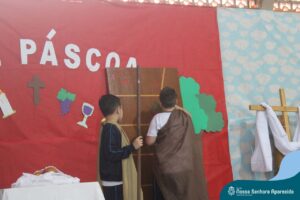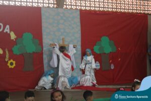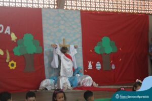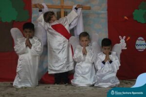 Com alegria e simplicidade, as turmas apresentaram os resultados de todas as reflexões sobre o tema promovidas pelas professoras e pelas Irmãs, durante toda a Quaresma. Os trajes dos diferentes personagens da Páscoa, os símbolos pascais, o cenário, as letras das músicas, os poemas, as dramatizações e até o cordel sensibilizaram a plateia para o verdadeiro sentido dessa data tão especial para todos os cristãos. Além disso, as apresentações revelaram o crescimento das crianças que mostraram terem compreendido as lições aprendidas.
