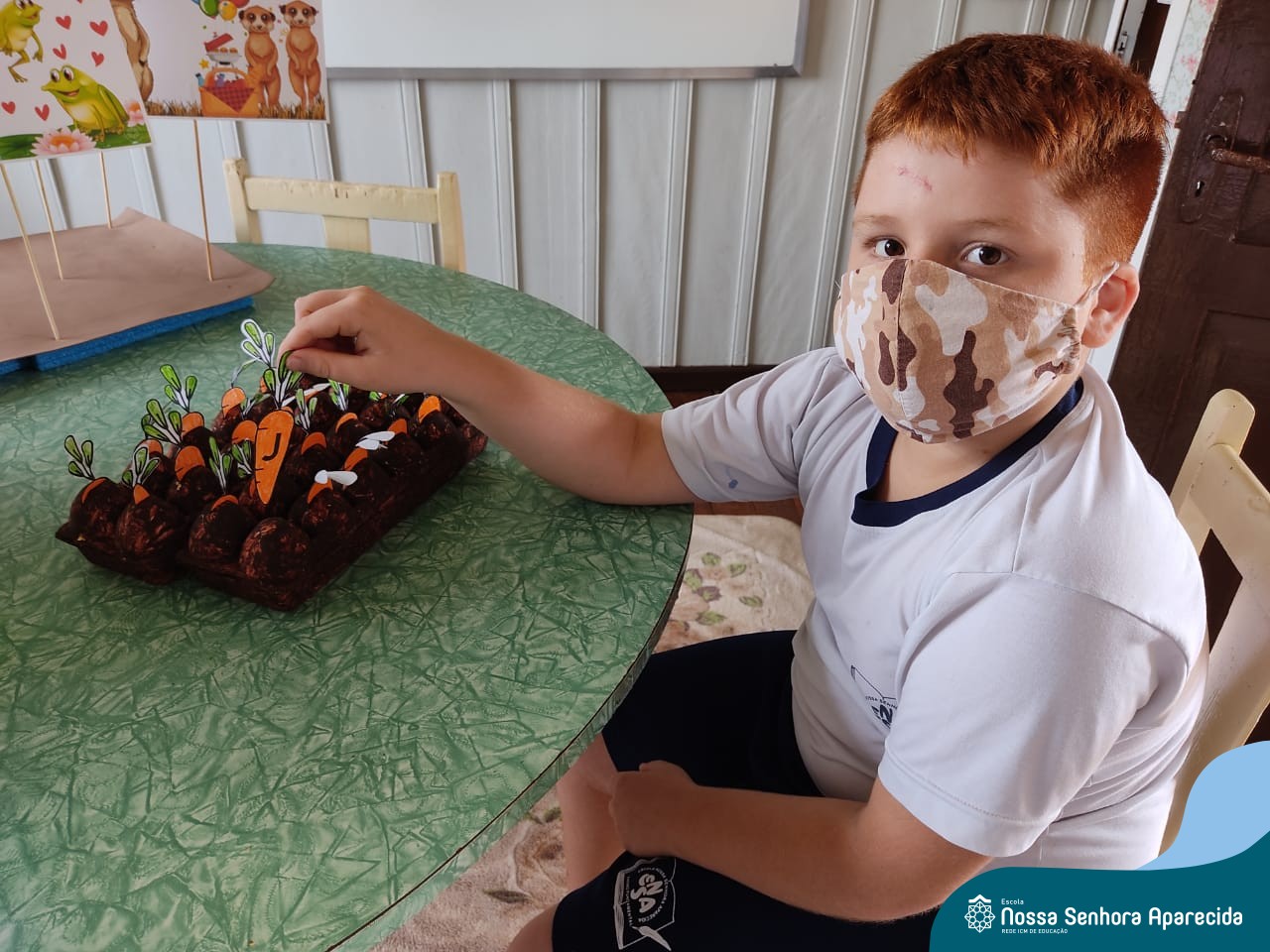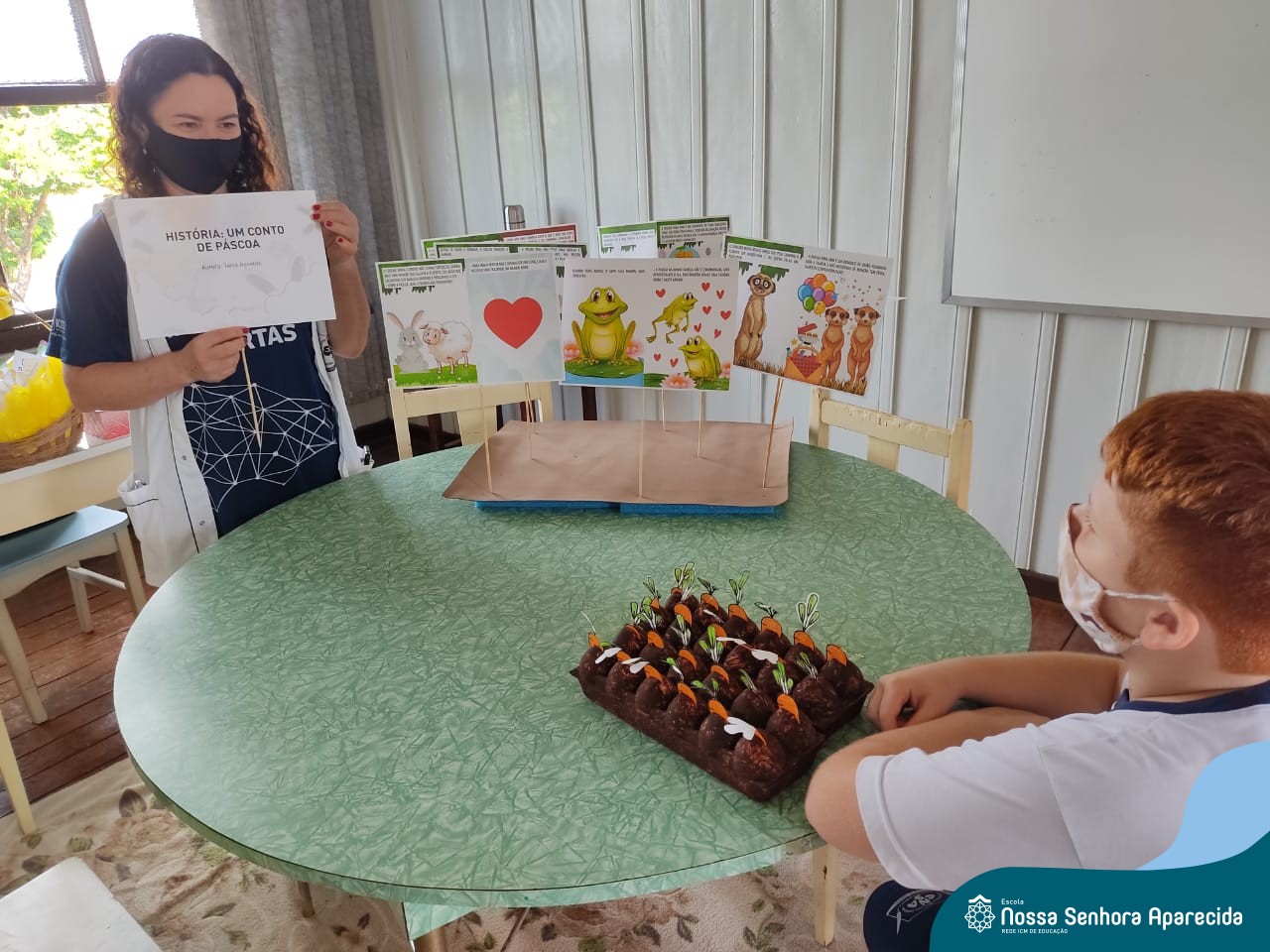 Na última semana, a partir do tema Páscoa, a professora implementou um projeto que conseguiu despertar grande interesse e engajamento dos alunos, mobilizando-os para momentos muito significativos de aprendizagem. O projeto começou com uma contação de uma história que enfatizava “o verdadeiro sentido da Páscoa”. A história despertou a curiosidade dos alunos e rendeu muitas conversas em sala de aula, nas quais os alunos puderam desenvolver a oralidade e a capacidade de expressão, ao apresentarem suas ideias e sentimentos e ao recontarem a narrativa, a partir da observação das ilustrações.