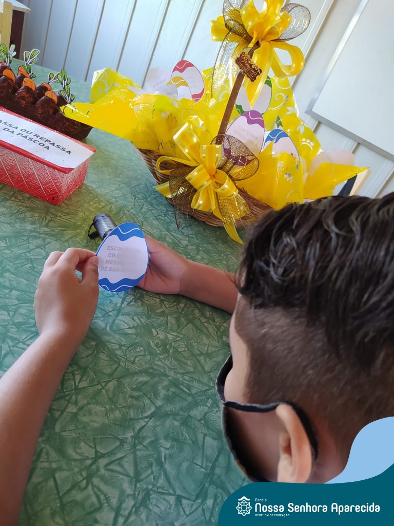 Depois, a professora propôs uma brincadeira que intitulou o “desafio dos ovos”, na qual o alunos deviam encontrar uma mensagem secreta escondida em ovinhos recheados que foram preparados dentro de uma cesta decorada. Para decifrar as mensagens-desafio que os ovinhos continham, as crianças deviam iluminá-las com uma lanterna, proporcionando muita emoção e prazer à atividade de leitura. Para cumprirem os desafios propostos nas mensagens secretas, as crianças tiveram de usar a magia e o raciocínio para a leitura e para a criação de movimentos, gestos, olhares, mímicas, em atividades dinâmicas e lúdicas.