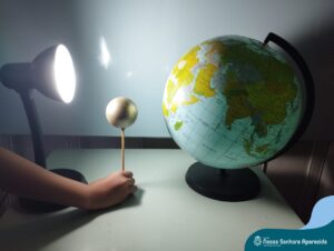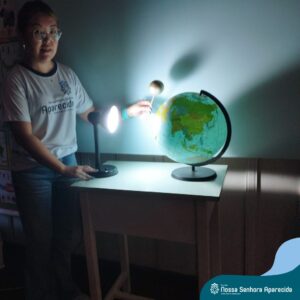 Para ampliar o conhecimento da turma, a professora trabalhou, também, os “Movimentos da Terra”. Com um globo terrestre e com uma lanterna, eles simularam os movimentos de rotação e translação e, assim, compreenderam a explicação científica para o fenômeno que, para eles, antes, era um mistério.