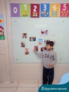 Fizeram, também, uma roda de conversa, em que cada criança pode apresentar sua família, por meio de fotos e pequenos relatos. Para isso, as professoras contara com o apoio dos pais que, com antecedência, providenciaram fotos da família para que os pequenos pudessem apresentar aos colegas. As fotografias das famílias foram expostas em sala de aula e cada criança pode produzir livremente o desenho da sua família. As turmas também construíram uma árvore genealógica e, para celebrar o momento, cada estudante produziu uma singela lembrança para sua família.