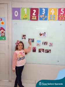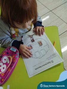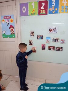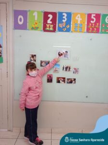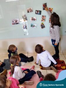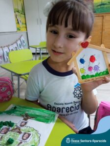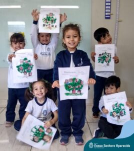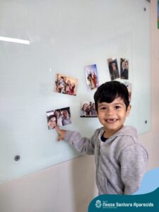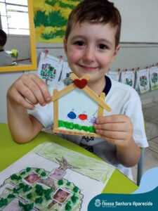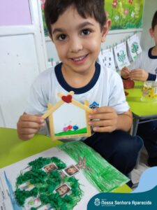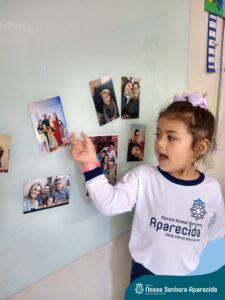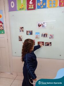 Fizeram, também, uma roda de conversa, em que cada criança pode apresentar sua família, por meio de fotos e pequenos relatos. Para isso, as professoras contara com o apoio dos pais que, com antecedência, providenciaram fotos da família para que os pequenos pudessem apresentar aos colegas. As fotografias das famílias foram expostas em sala de aula e cada criança pode produzir livremente o desenho da sua família. As turmas também construíram uma árvore genealógica e, para celebrar o momento, cada estudante produziu uma singela lembrança para sua família.