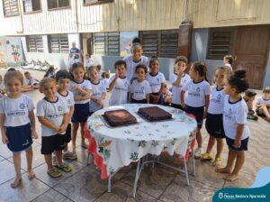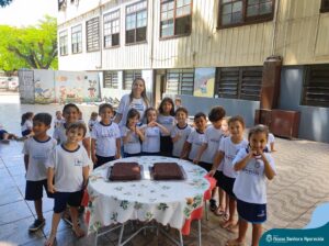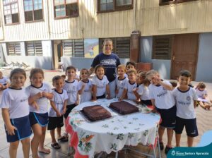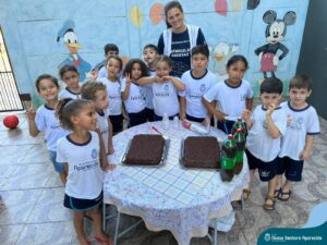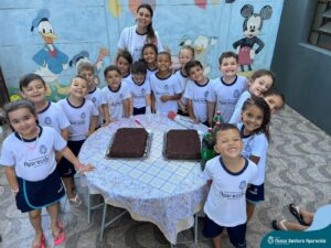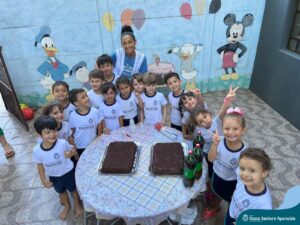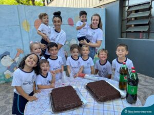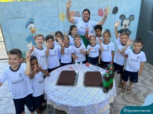 Para marcar a despedida dos alunos da Educação Infantil, as professoras Adriana Kihl, Amanda Almeida, Camila Zanutto, Eliete Trazzi, Juliana Moreira, Patrícia Santana, Rosiane Katachinski e Vanessa Ribeiro, prepararam muitas brincadeiras, bolo de chocolate e refrigerantes para animar o último dia de aula dos estudantes.