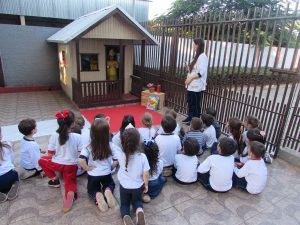 Para dar continuidade ao projeto “Cores”, iniciado no primeiro bimestre deste ano, a professora Camila de Oliveira mobilizou as crianças do Jardim I-B para encenar a música O Patinho Colorido.