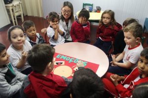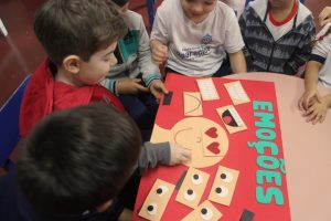 Para facilitar a comunicação sentimental de seus alunos em aula, a educadora Michella Sassaki criou o “painel das emoções”. Trata-se de uma brincadeira diária em que os pequenos escolhem partes do rosto, como olhos e boca, para montarem um painel com expressões faciais, sejam elas alegres, tristes, cômicas, etc.
