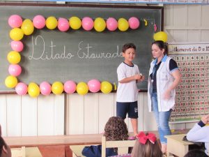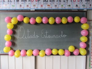 No caso dos alunos do 1o A, a professora Edina Zanuto optou utilizar a técnica do “ditado estourado” para a turma refletir a importância fonológica. A abordagem metodológica utilizada foi colocar dentro de variados  balões uma palavra. Cada criança escolheu um balão para estourá-lo e, em seguida, leu e escreveu no quadro para que os demais colegas copiarem.