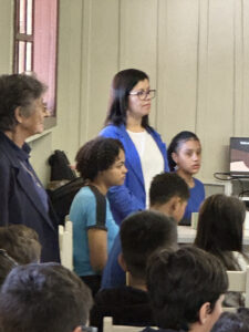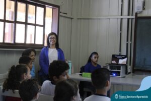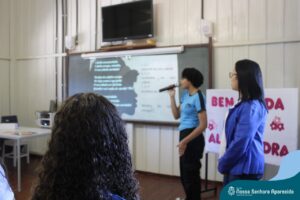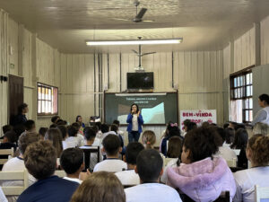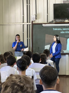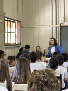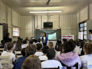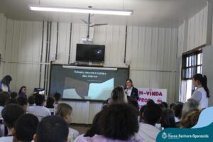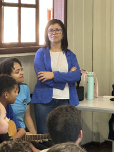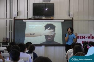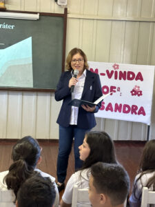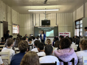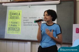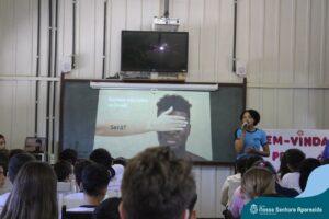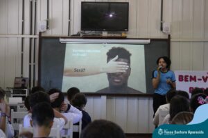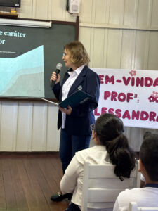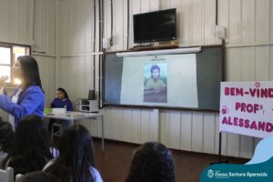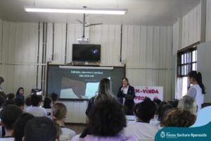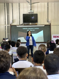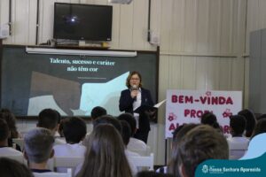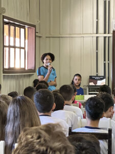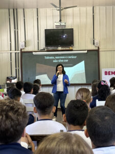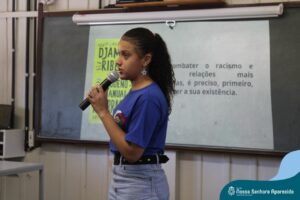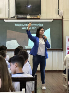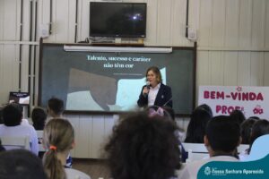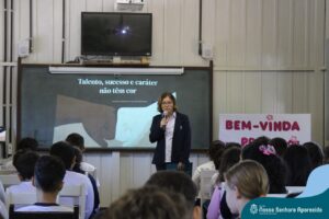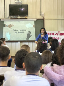 A professora convidada para esta palestra é Alessandra Beltramim, professora de Língua Portuguesa e Professora Formadora na Rede Estadual de Educação, que veio acompanhada de seus alunos do Colégio Estadual Dr. Antenor Pâmphilo dos Santos, Alan Alves, Emily dos Santos e Lauane Naiele, que compartilharam as experiências de discriminação que já vivenciaram sobretudo pela especificidade do cabelo encaracolado. Além de incentivar o respeito, a empatia e a valorização das pessoas pelo que elas são além das aparências, a palestra destacou a importância de se valorizar a herança cultural dos povos africanos e de se reconhecer a beleza negra como parte importante da identidade e da riqueza cultural do povo brasileiro. Para sensibilizá-los sobre o tema, os palestrantes ainda cantaram com os alunos a música “Menina do cabelo crespo”.
