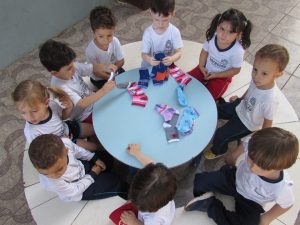 Com o objetivo de trabalhar a memória, o raciocínio lógico e a concentração, a professora Michella Sassaki desenvolveu com seus aluninhos do Jardim I A, o Jogo da Memória com meias.
