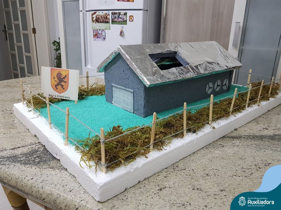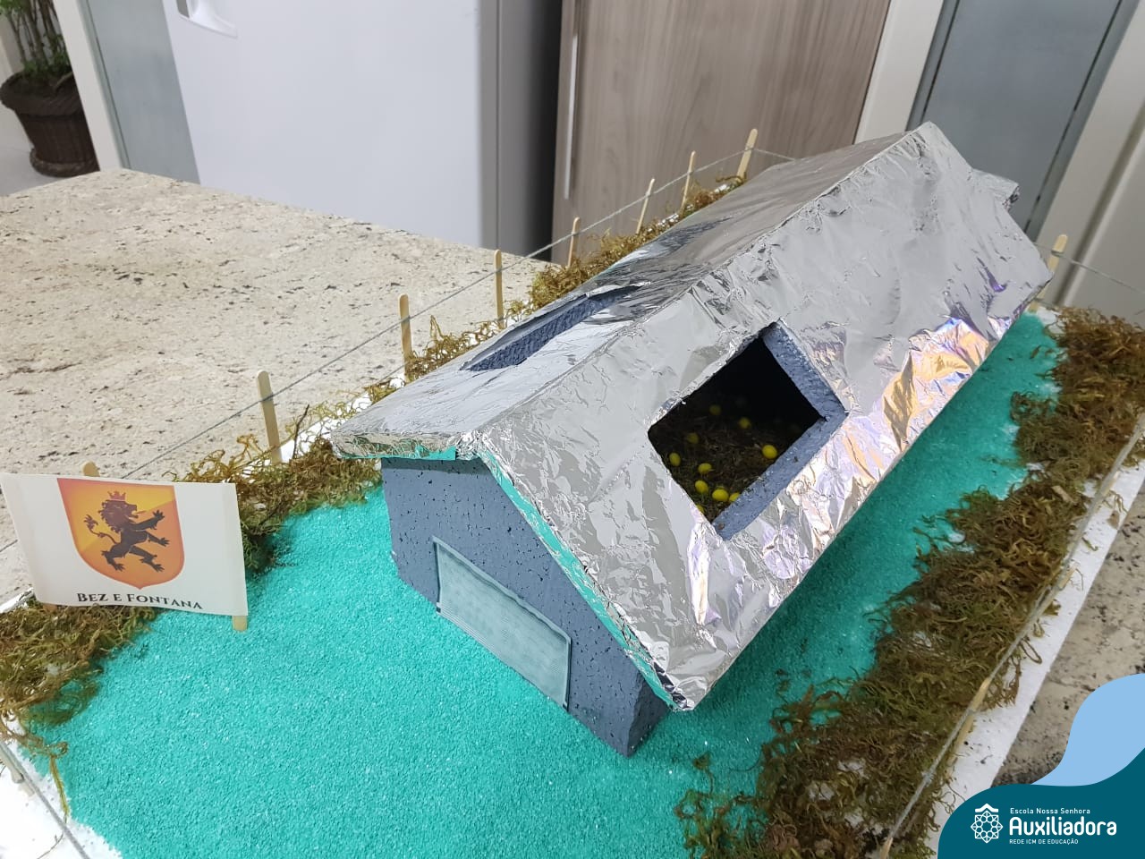 ā “Eu comecei cortando o isopor nos formatos das paredes e do telhado, após isso, cortei o telhado para demonstrar o que tem dentro do aviĆ”rio, pintei as paredes de cinza e enrolei o telhado com papel alumĆnio, esperei secar e colei as paredes no isopor, coloquei um musgo para representar a cama do aviĆ”rio, coloquei massinha de modelar amarela para representar os pintinhos e colei o telhado.