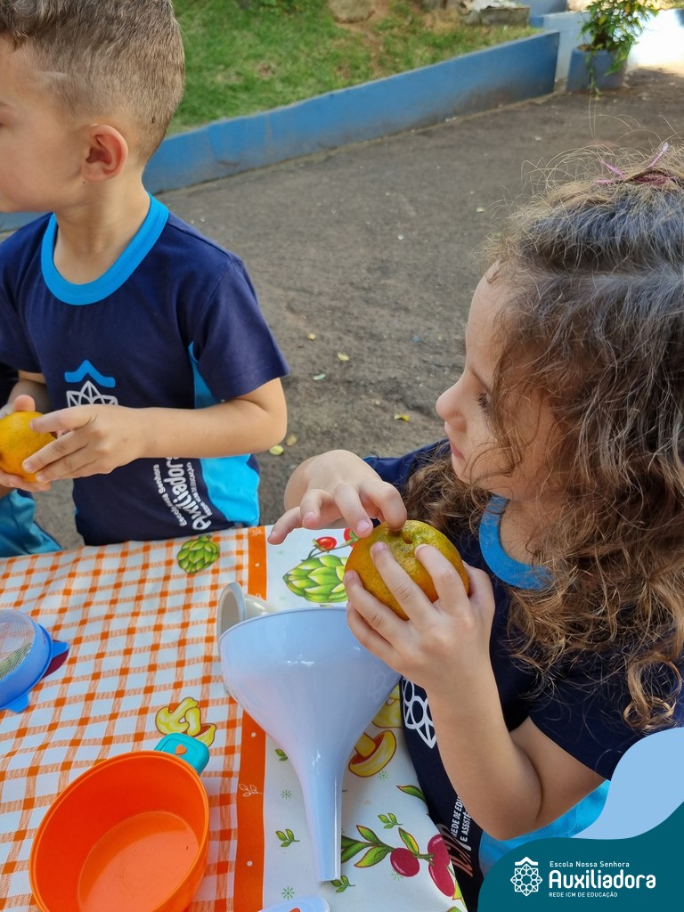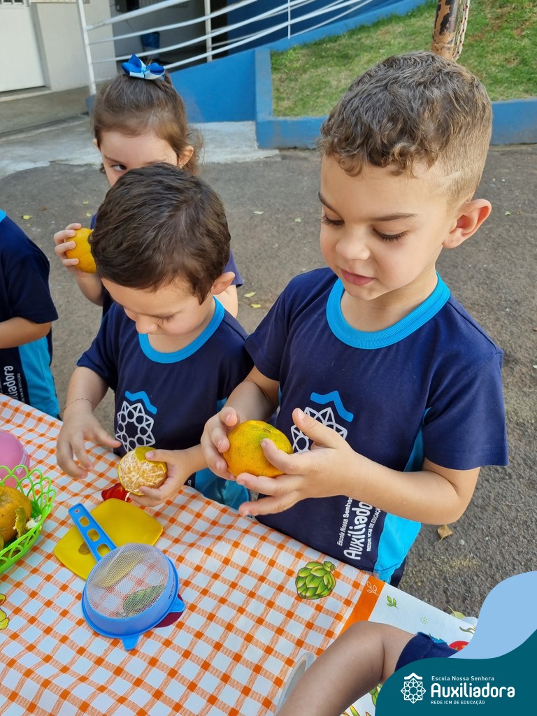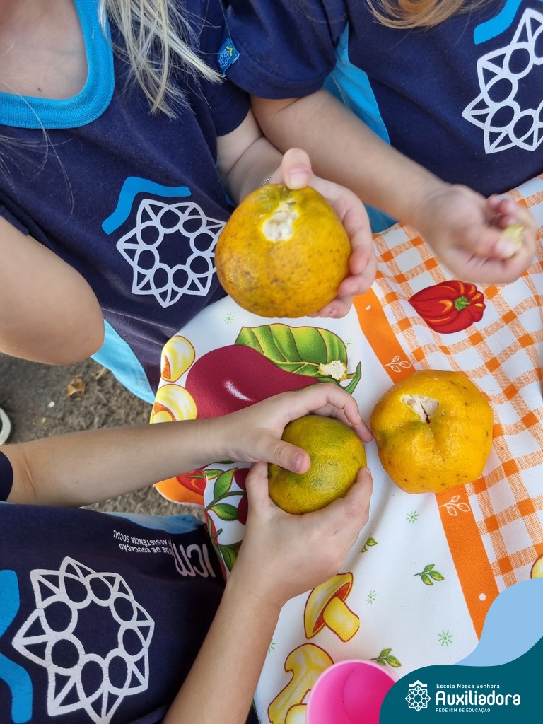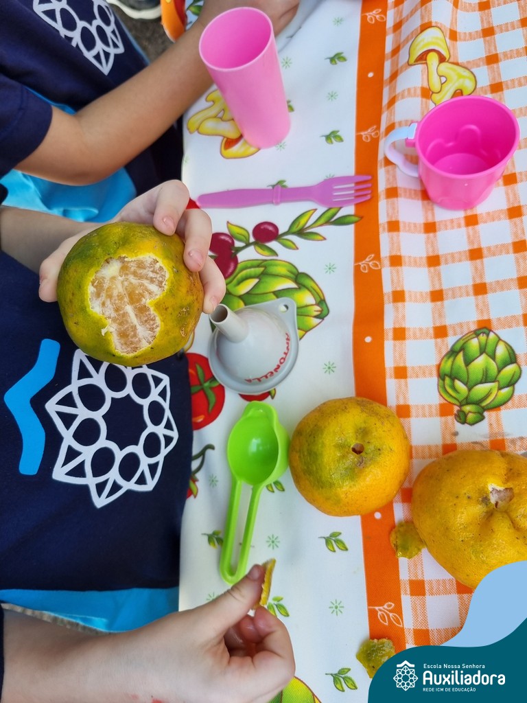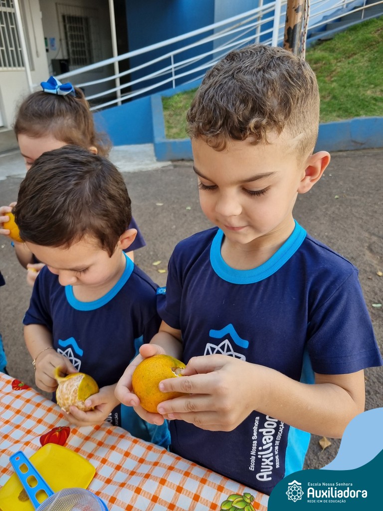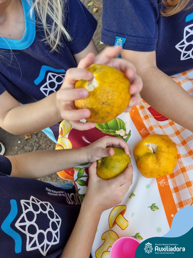 Nossas crianças aprimoraram a coordenação motora fina, aguçaram o sentido e exploraram a fruta bergamota, típica dessa época.