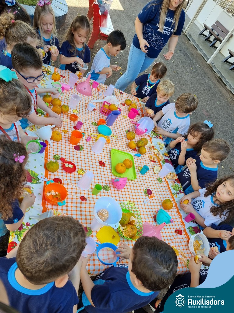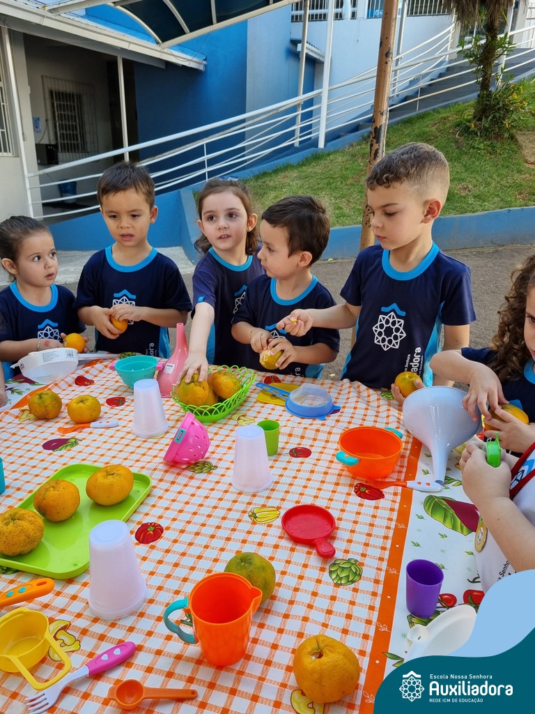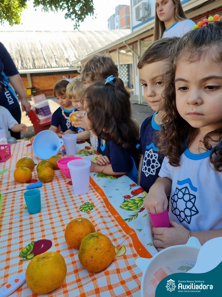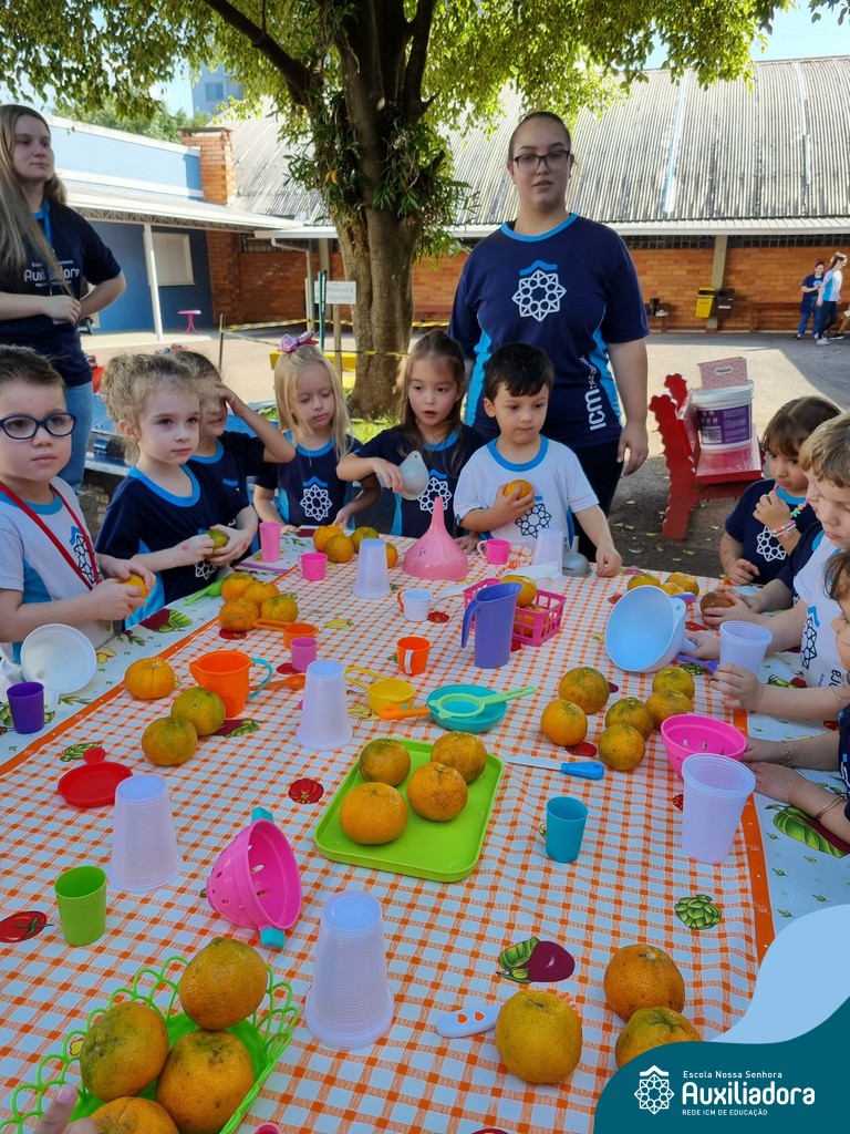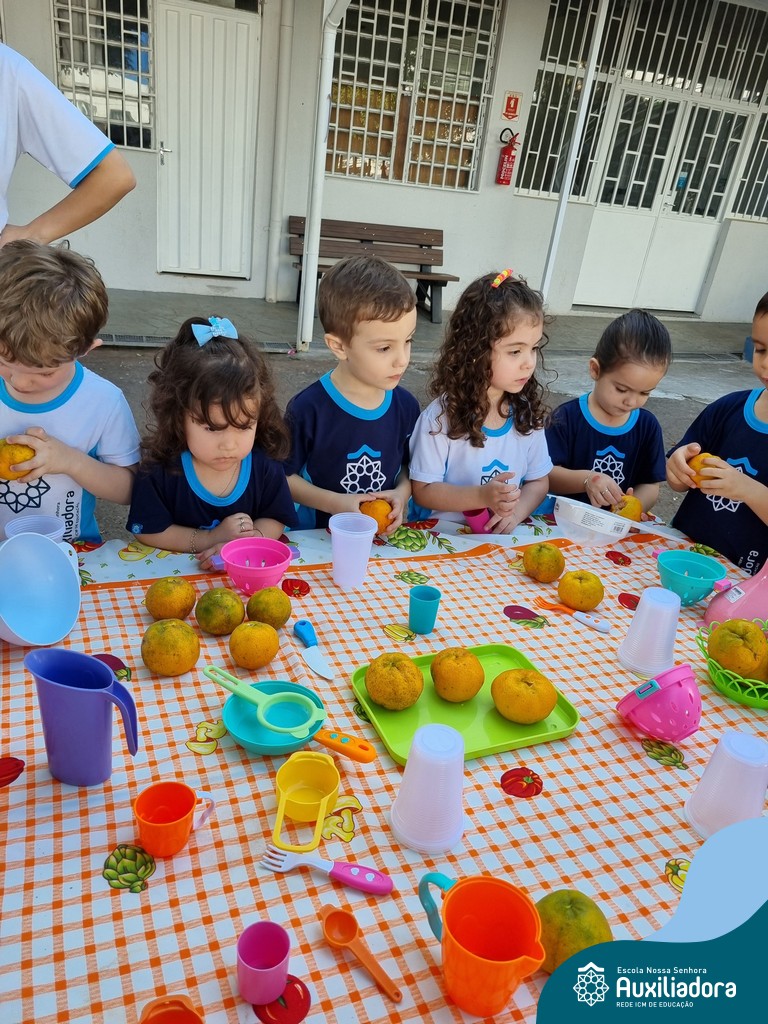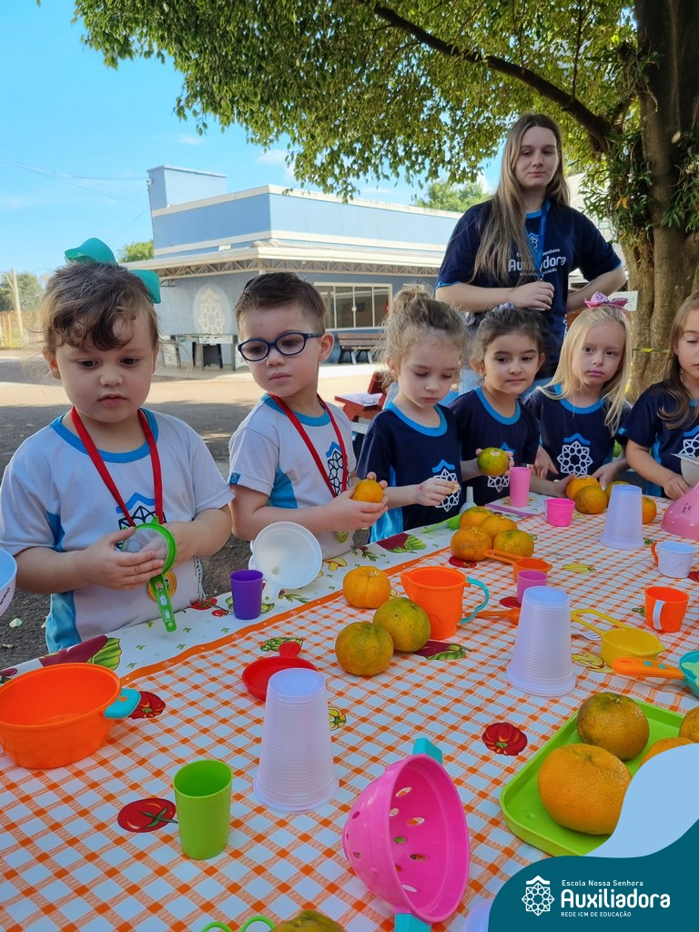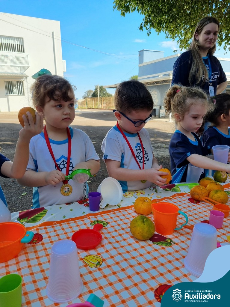 Nossas crianças aprimoraram a coordenação motora fina, aguçaram o sentido e exploraram a fruta bergamota, típica dessa época.