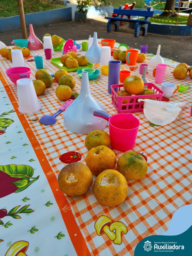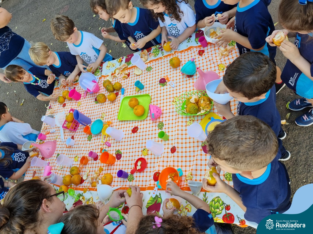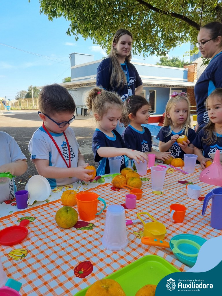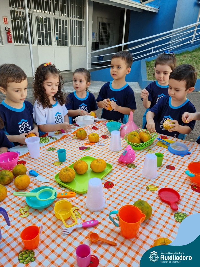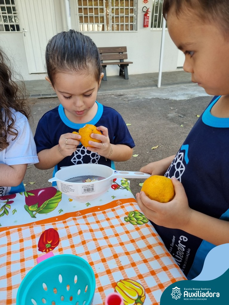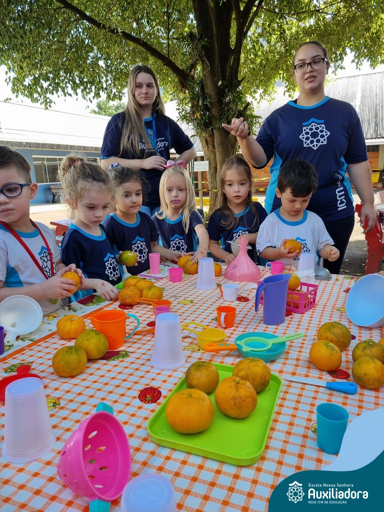 Nossas crianças aprimoraram a coordenação motora fina, aguçaram o sentido e exploraram a fruta bergamota, típica dessa época.