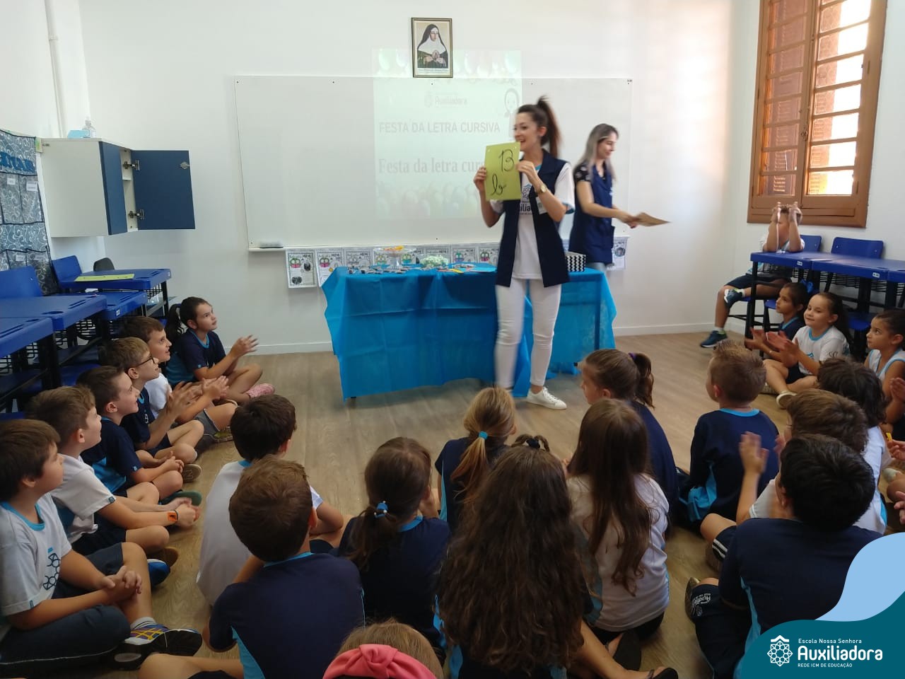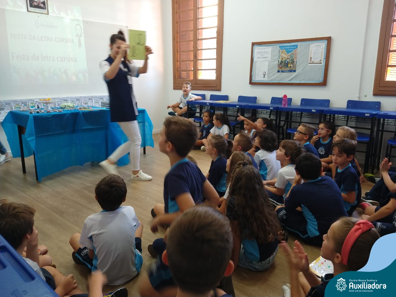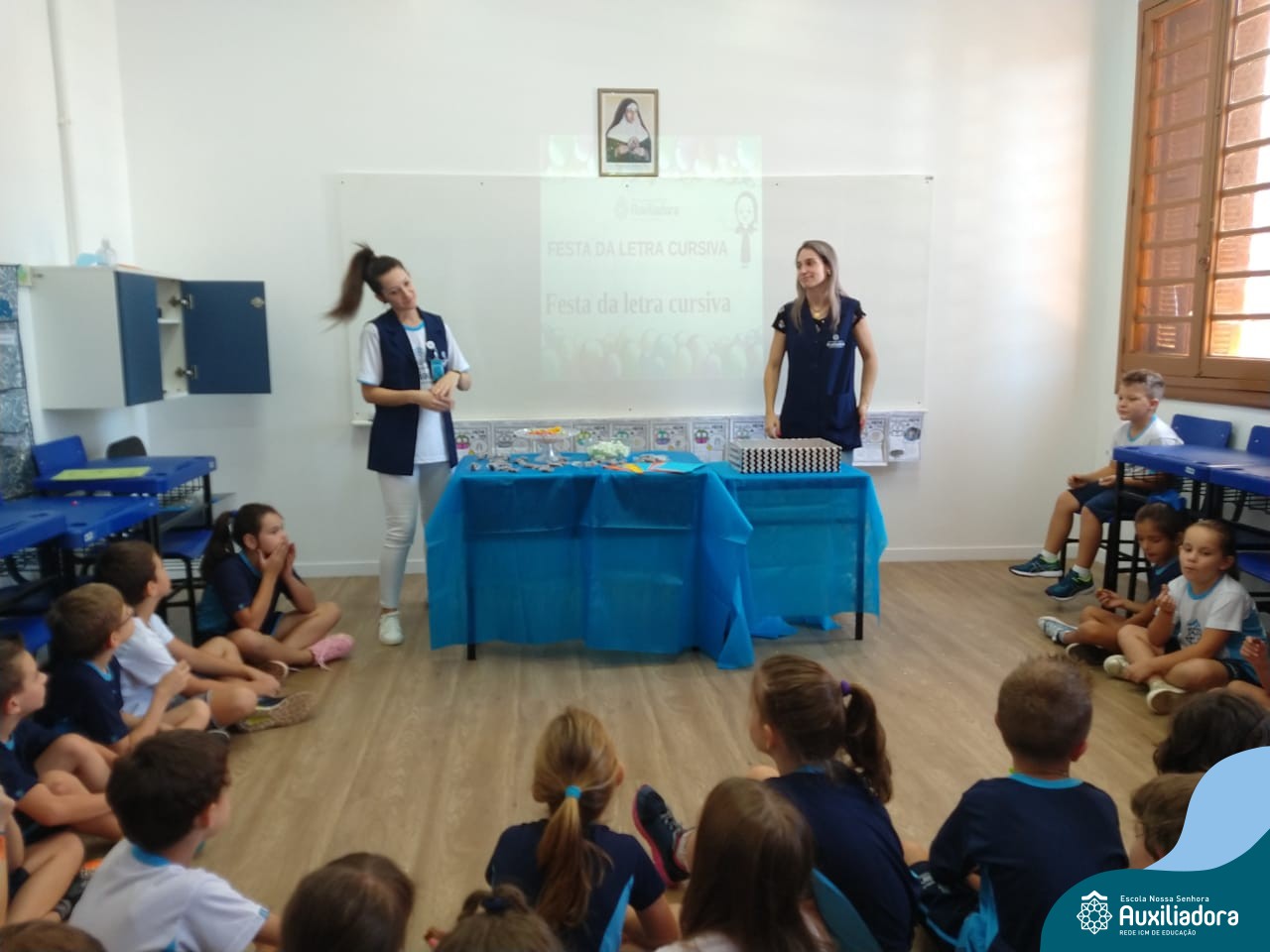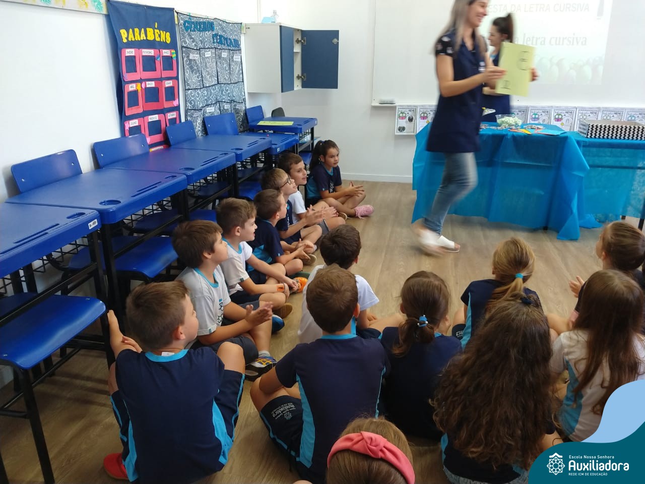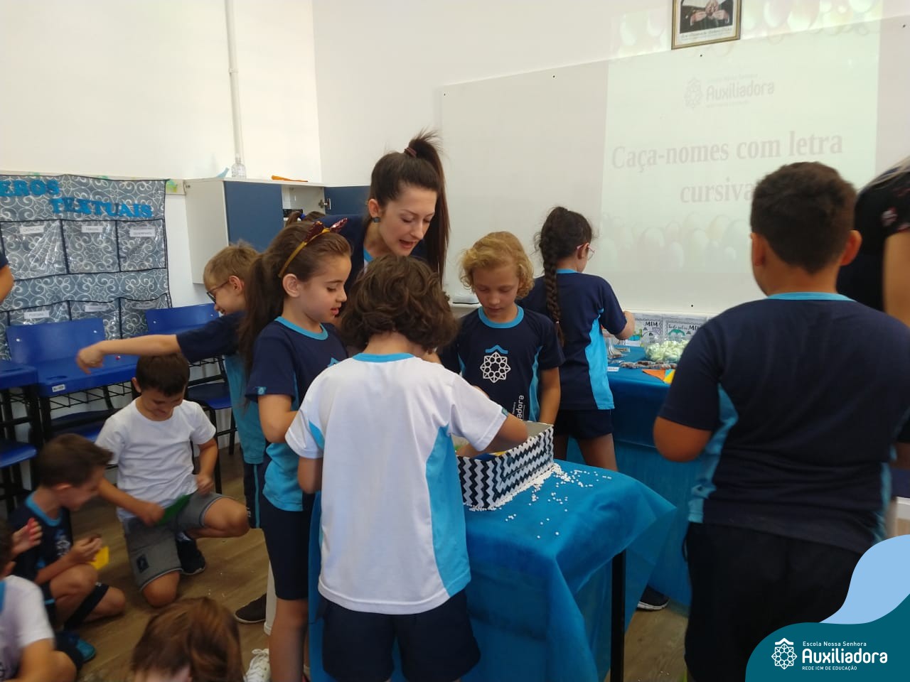 As turmas do 2° ano 21 e 22 estão se aventurando na descoberta da letra cursiva. A transição da letra palito para a letra cursiva aconteceu através de uma festa com brincadeiras e guloseimas.