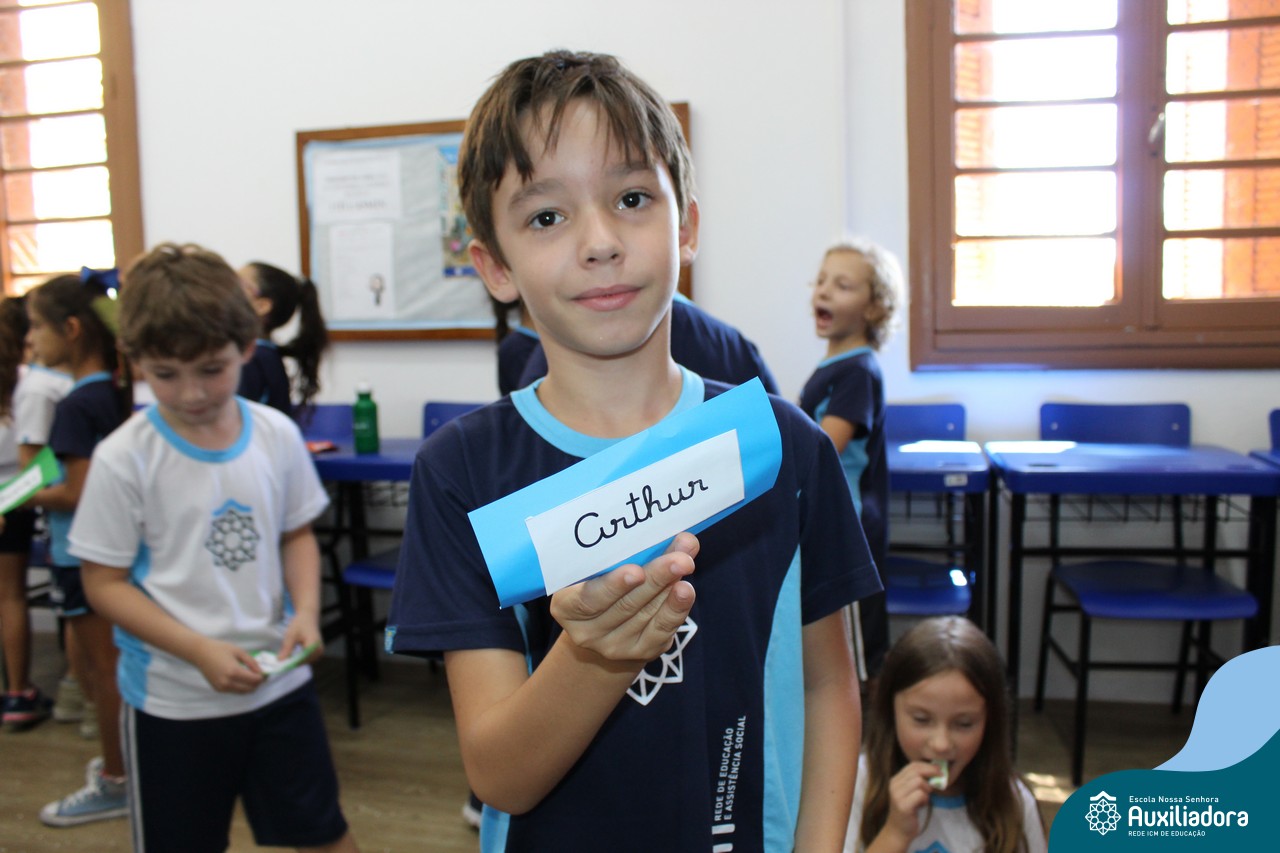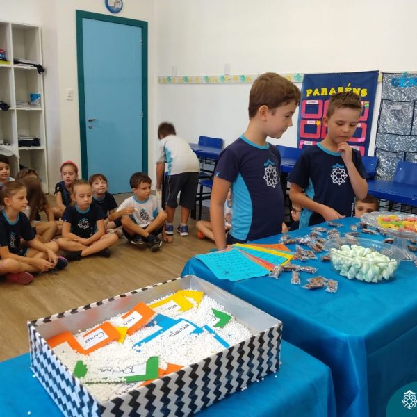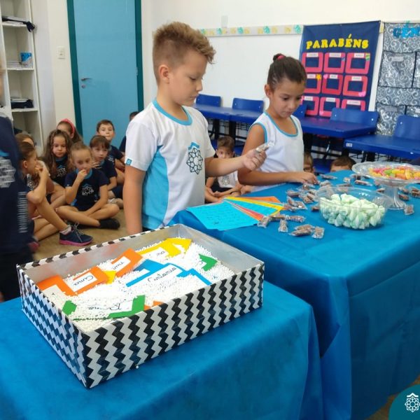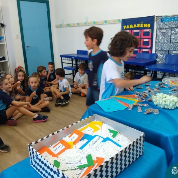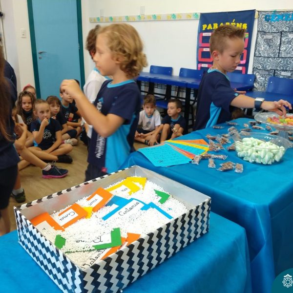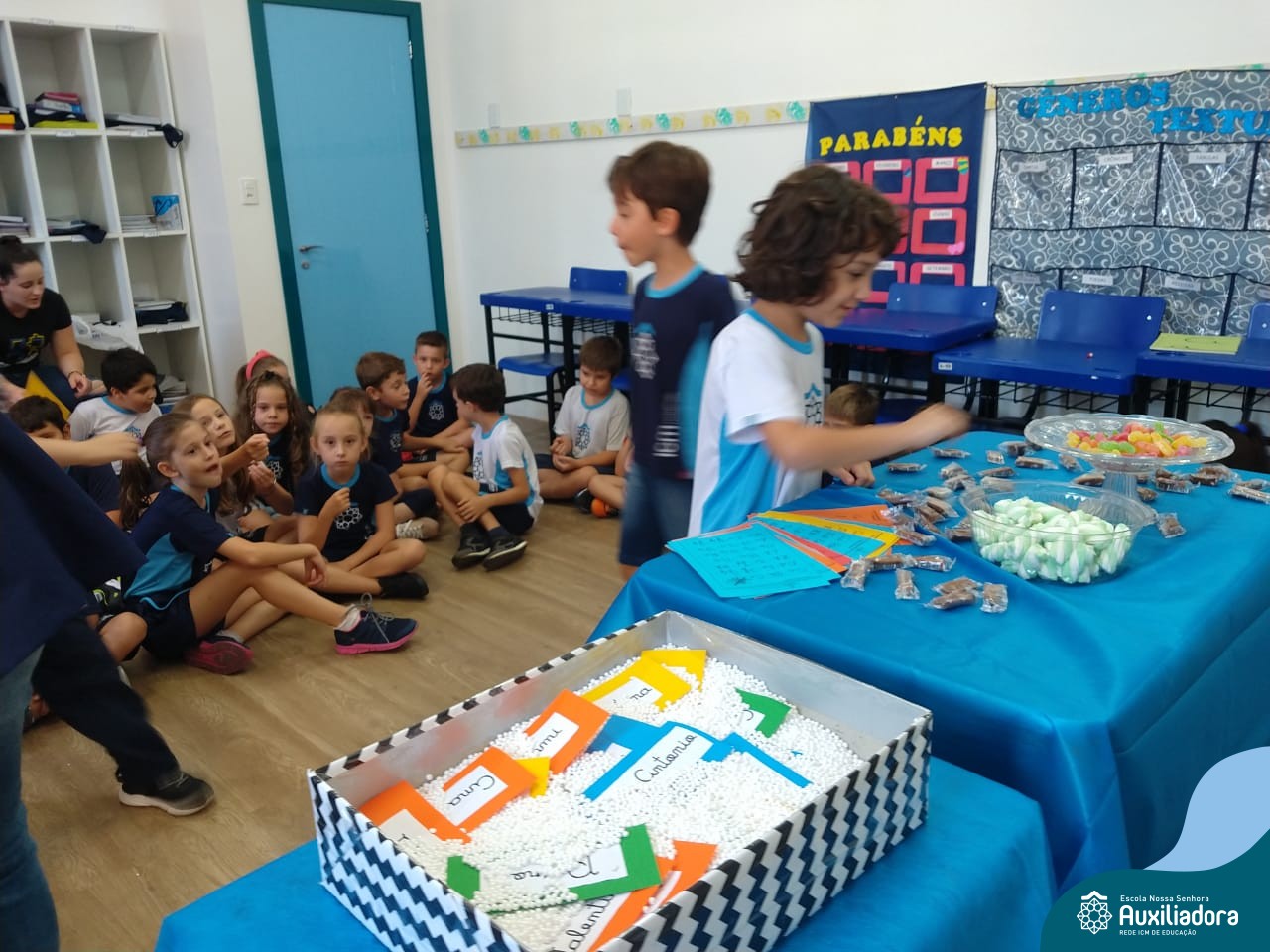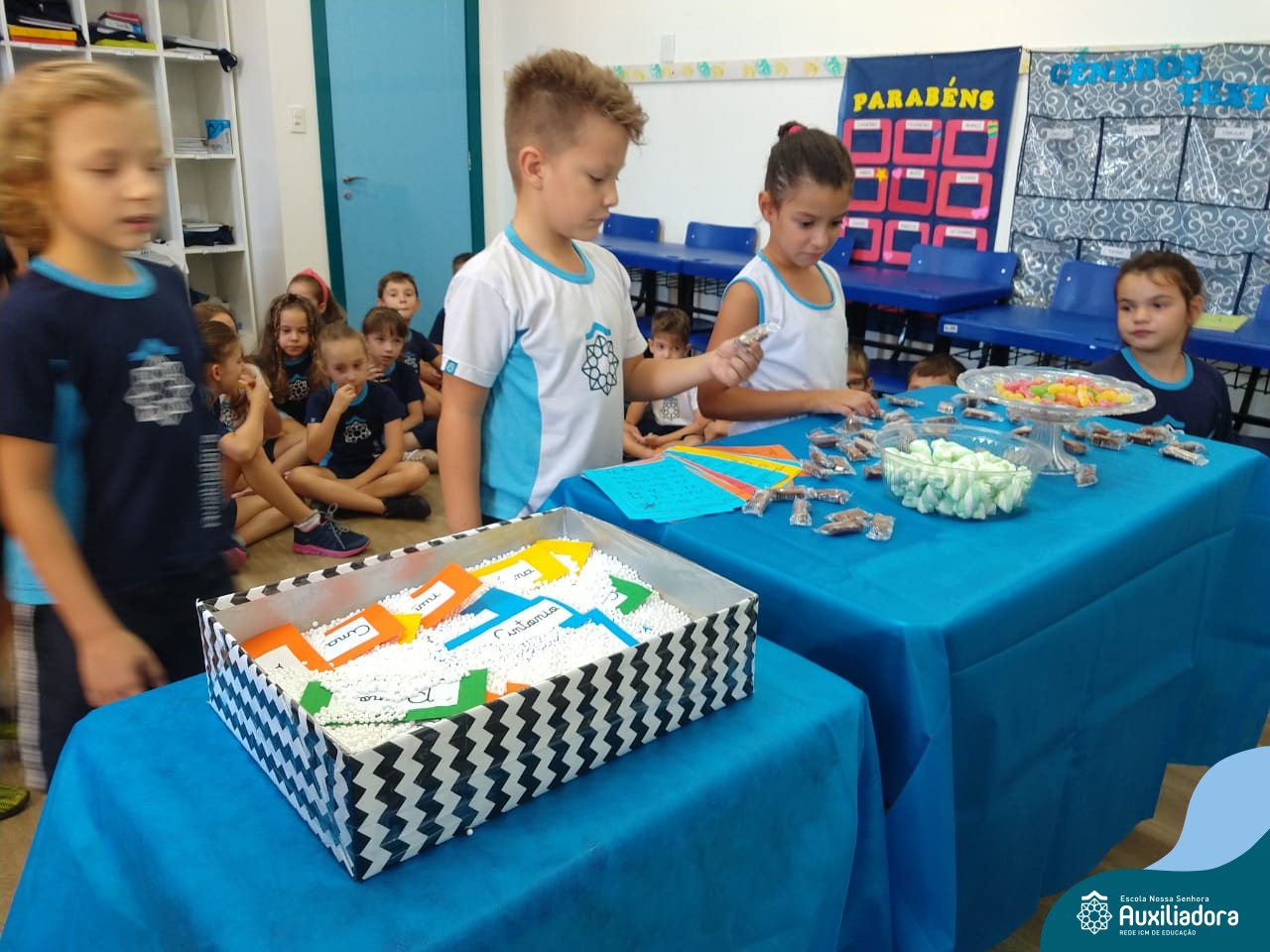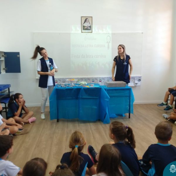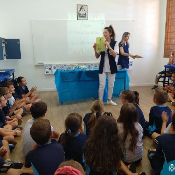 As turmas do 2° ano 21 e 22 estão se aventurando na descoberta da letra cursiva. A transição da letra palito para a letra cursiva aconteceu através de uma festa com brincadeiras e guloseimas.