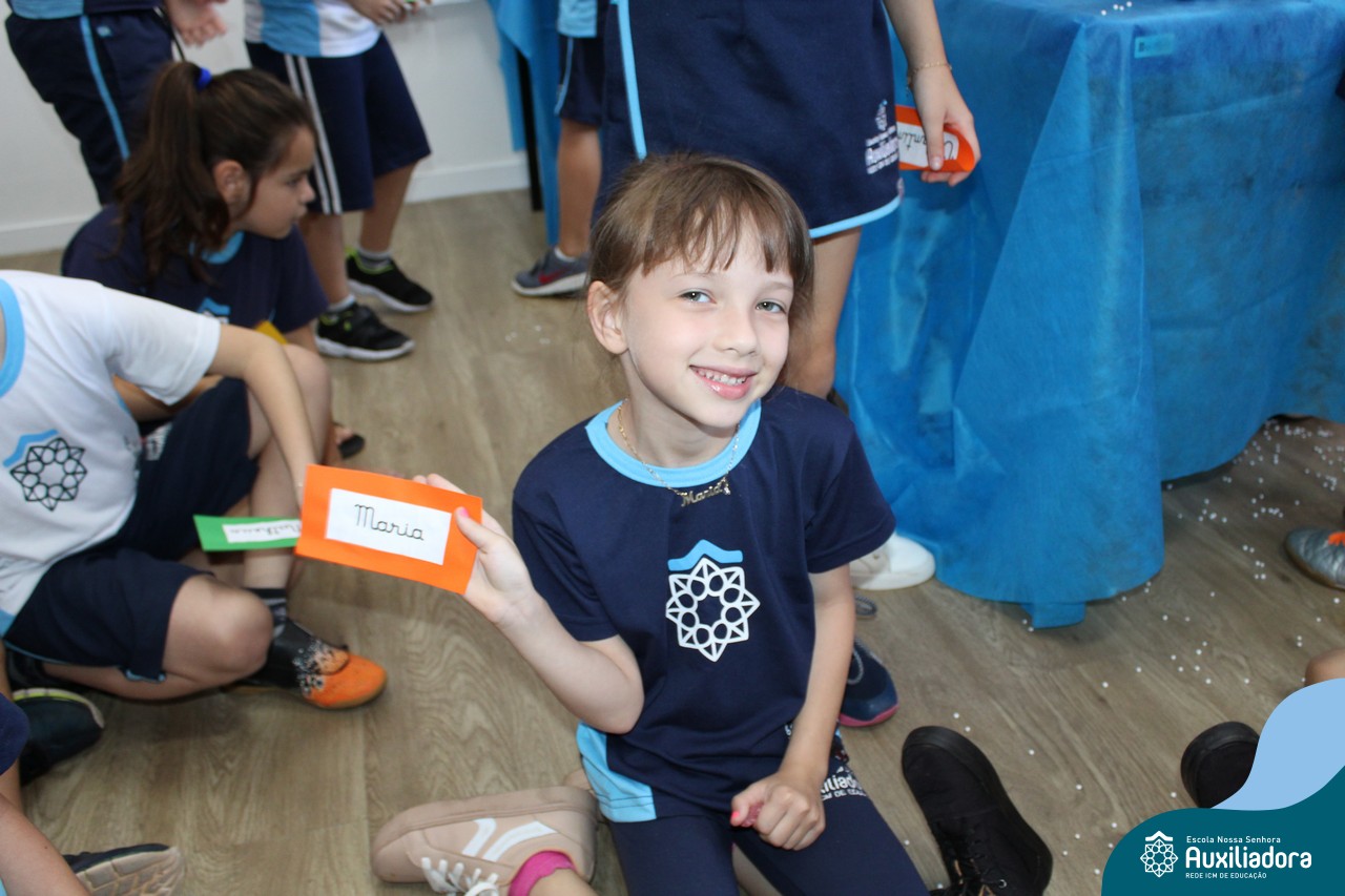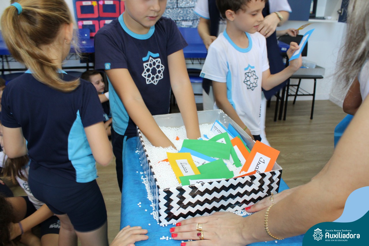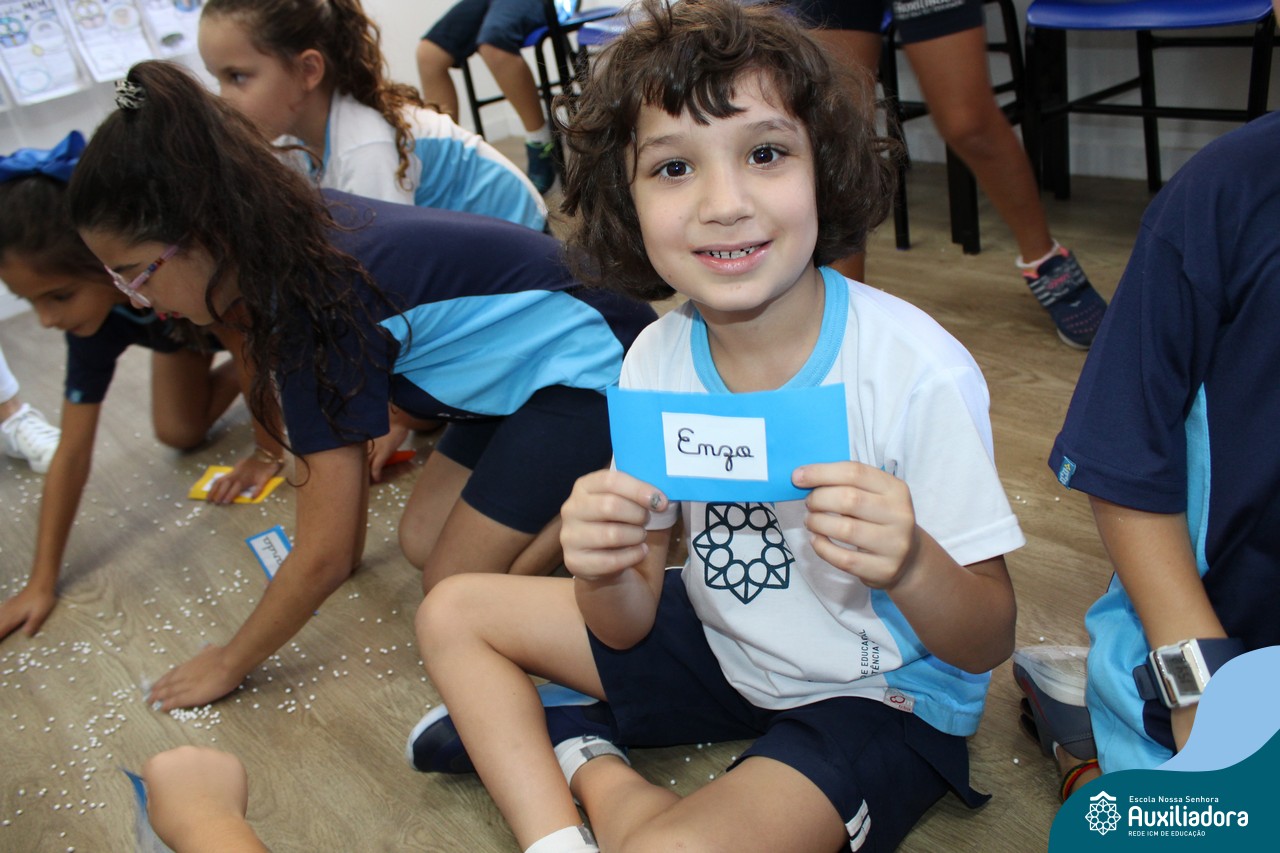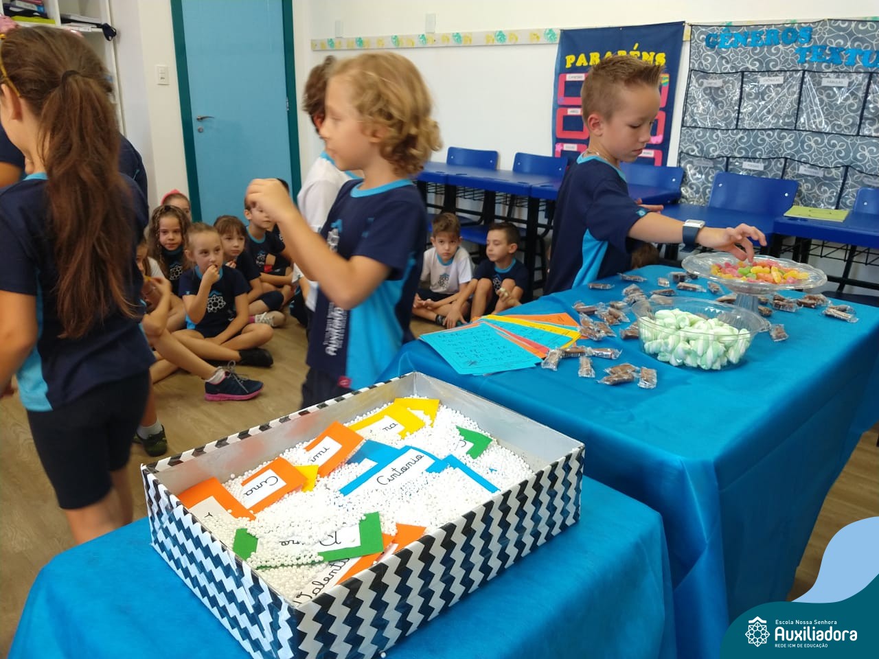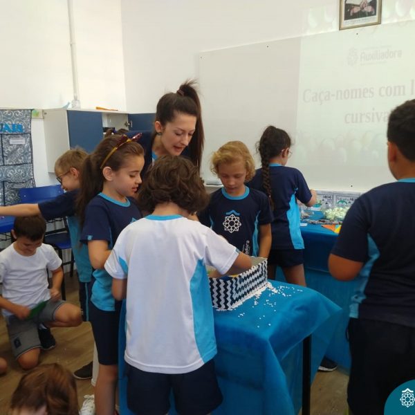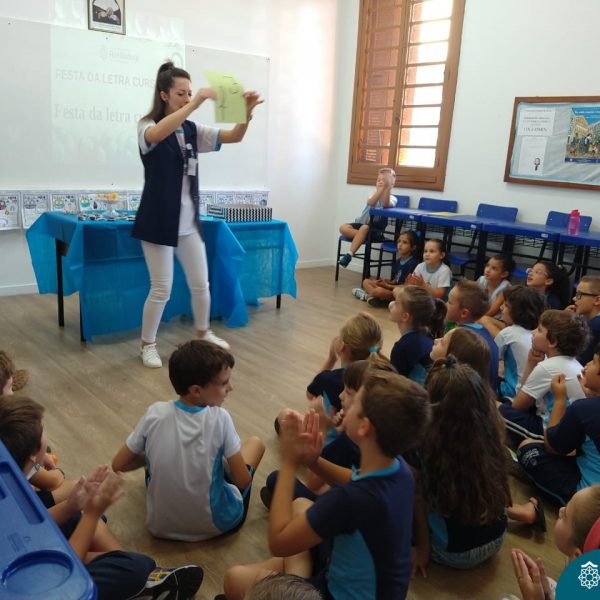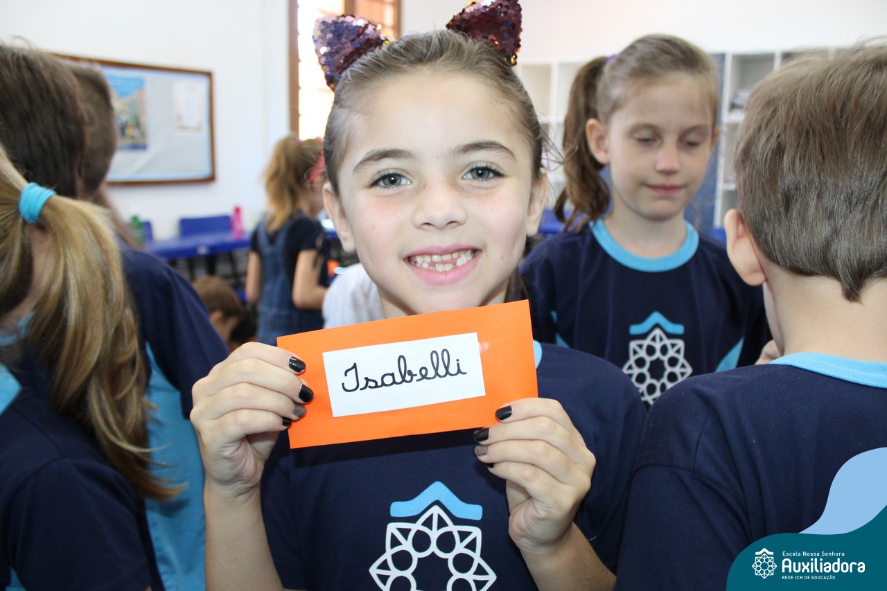 As turmas do 2° ano 21 e 22 estão se aventurando na descoberta da letra cursiva. A transição da letra palito para a letra cursiva aconteceu através de uma festa com brincadeiras e guloseimas.