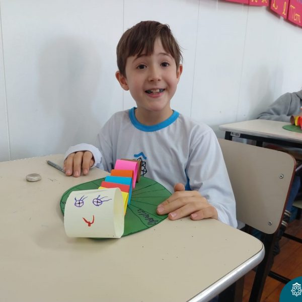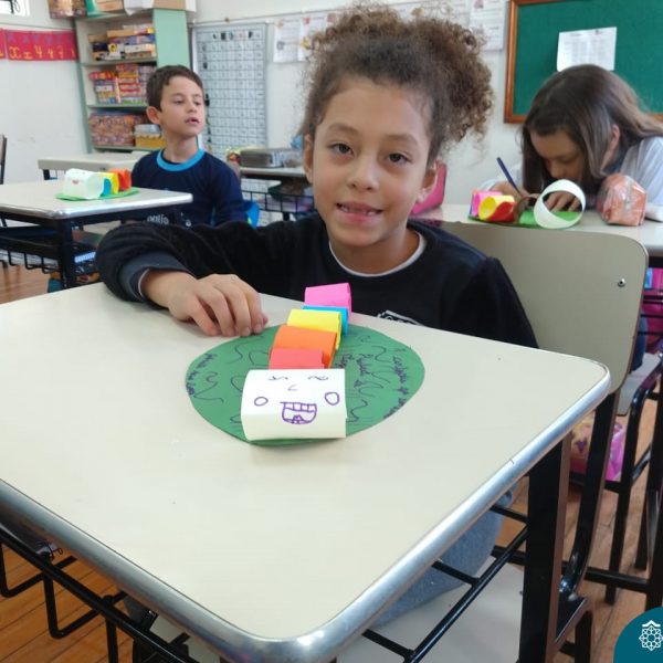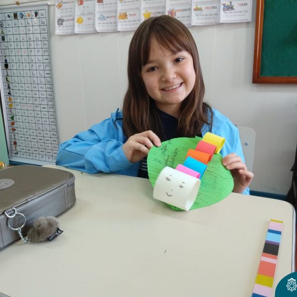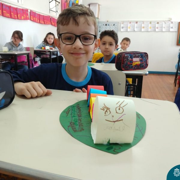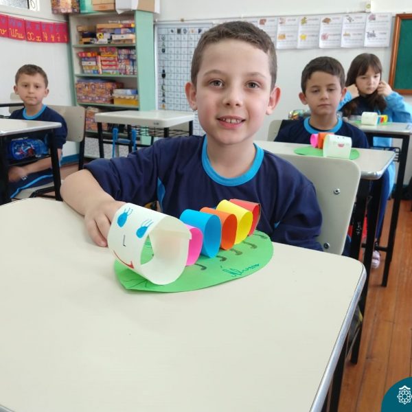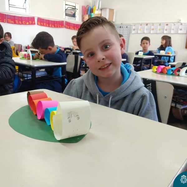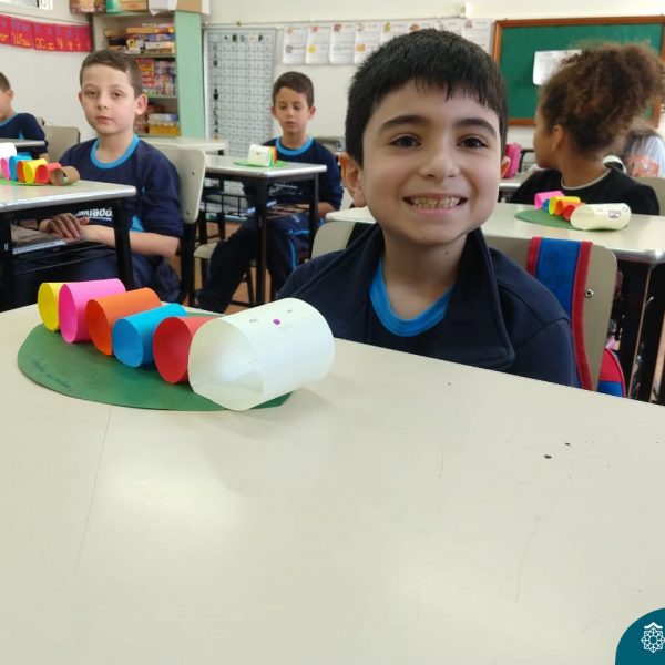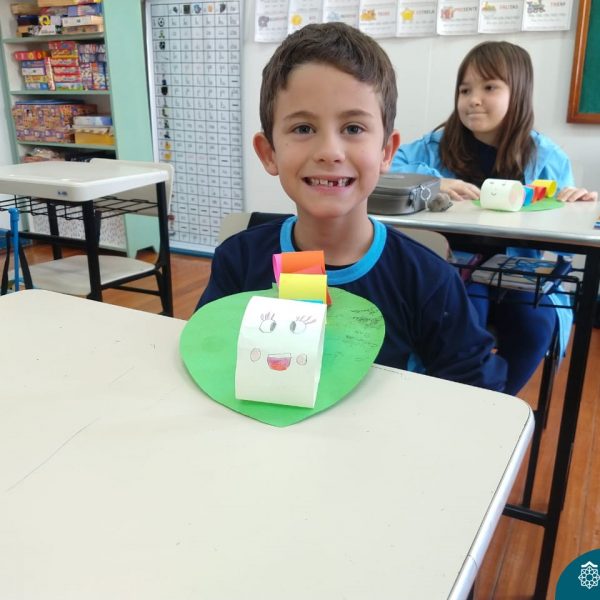 A chegada da estação da primavera foi marcada com o início do trabalho com uma das leituras obrigatórias do 2° ano 22, “A centopéia que sonhava”, em que a turma construiu a personagem principal usando papel colorido.