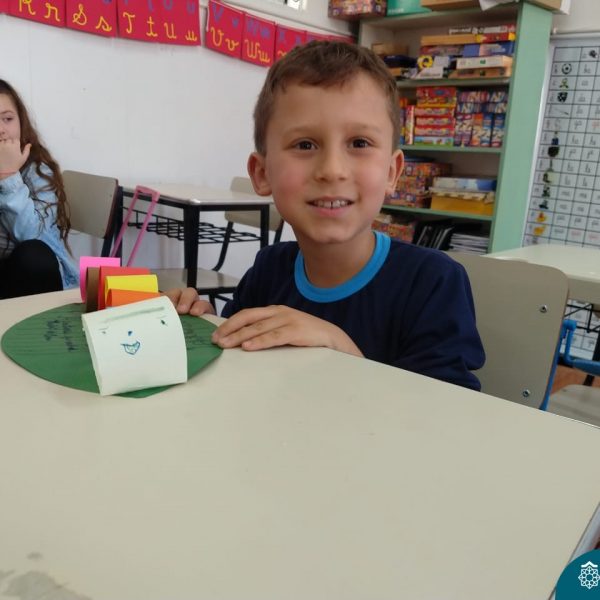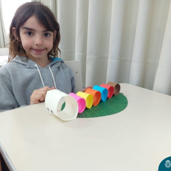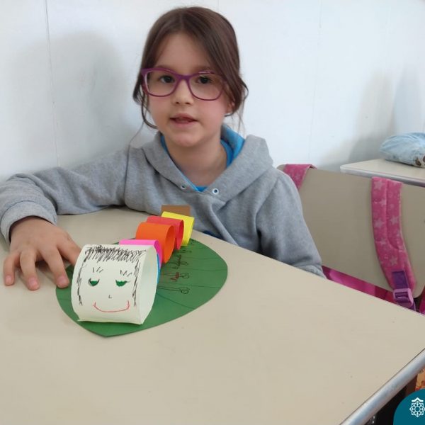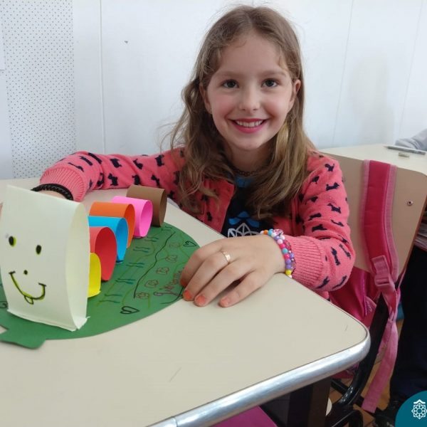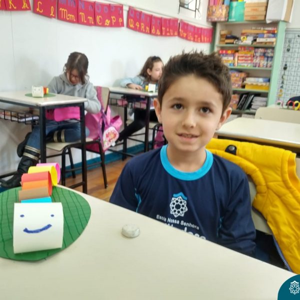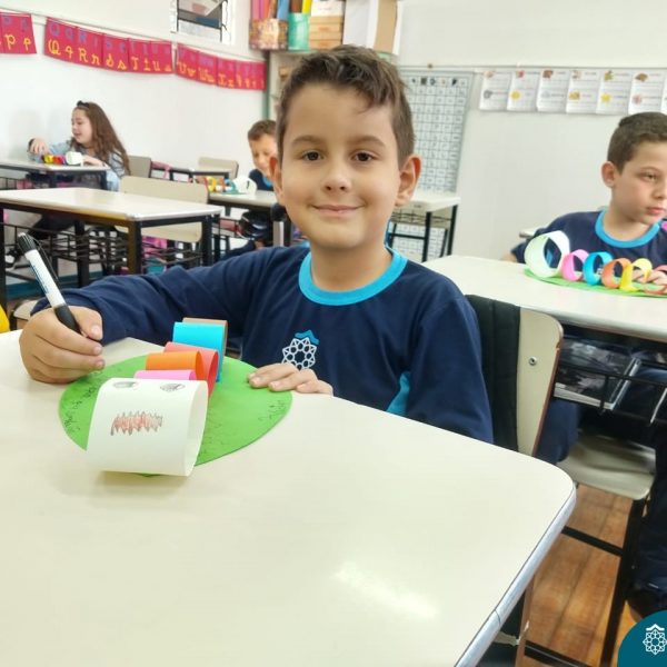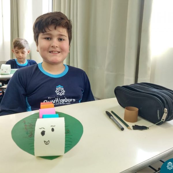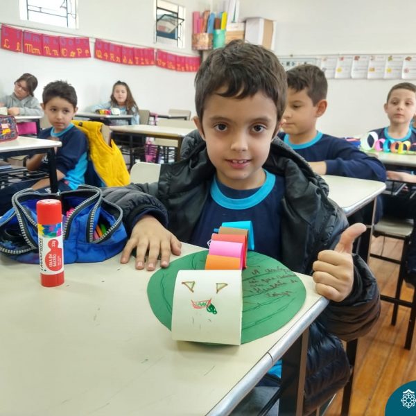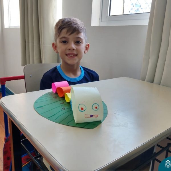 A chegada da estação da primavera foi marcada com o início do trabalho com uma das leituras obrigatórias do 2° ano 22, “A centopéia que sonhava”, em que a turma construiu a personagem principal usando papel colorido.