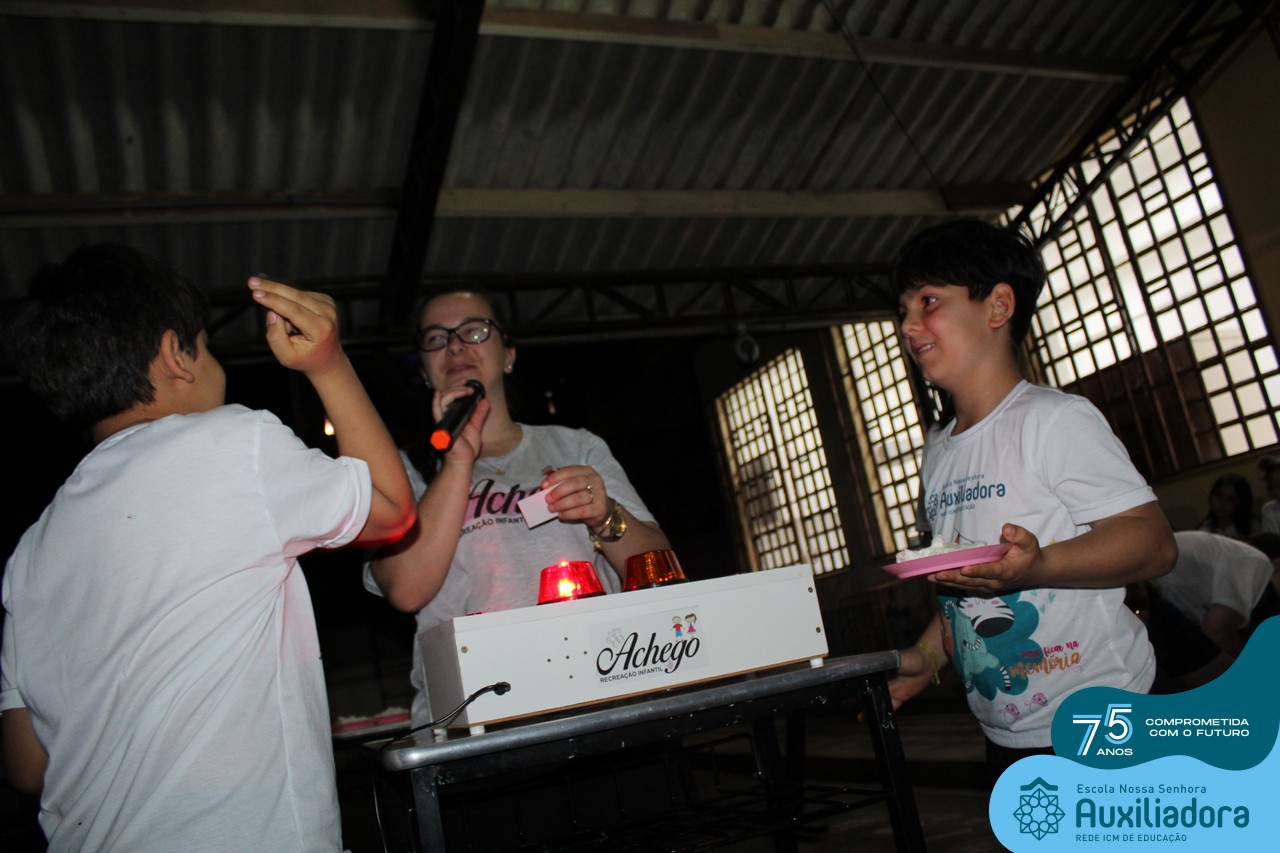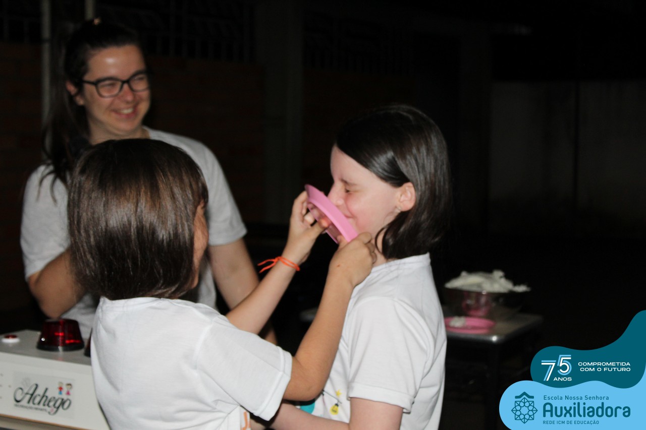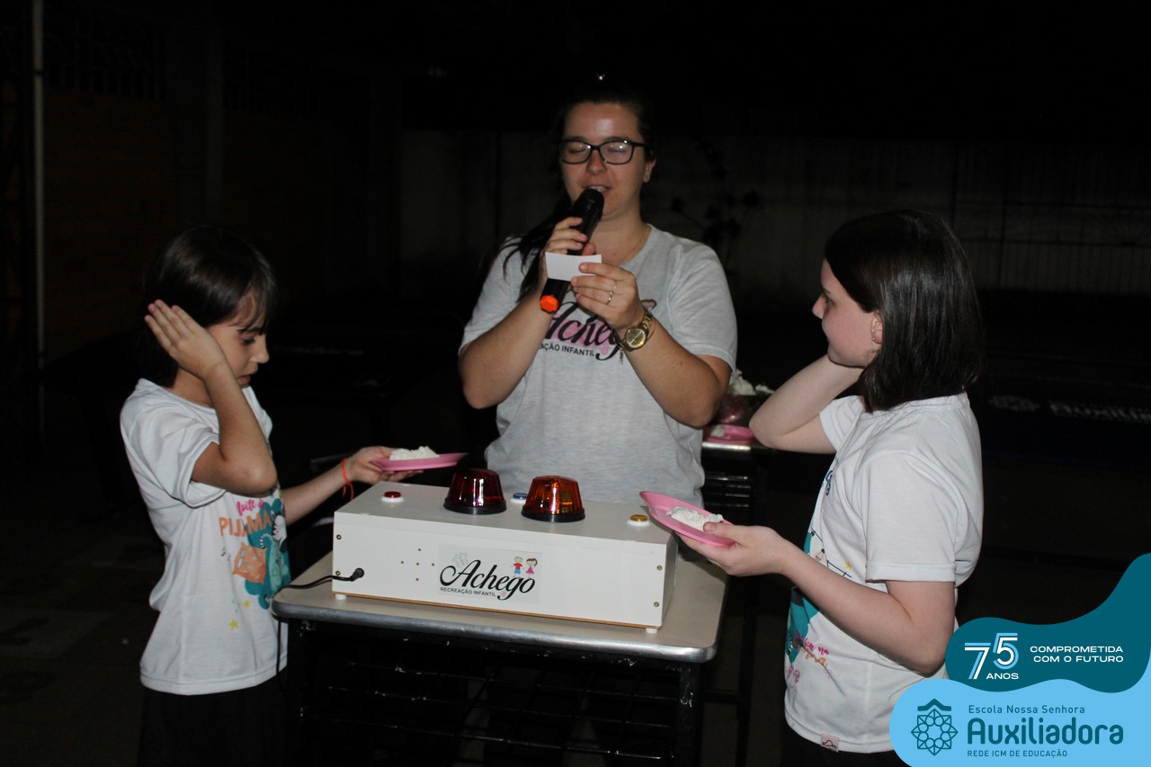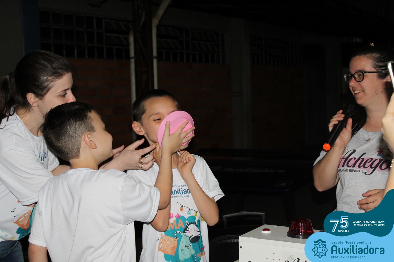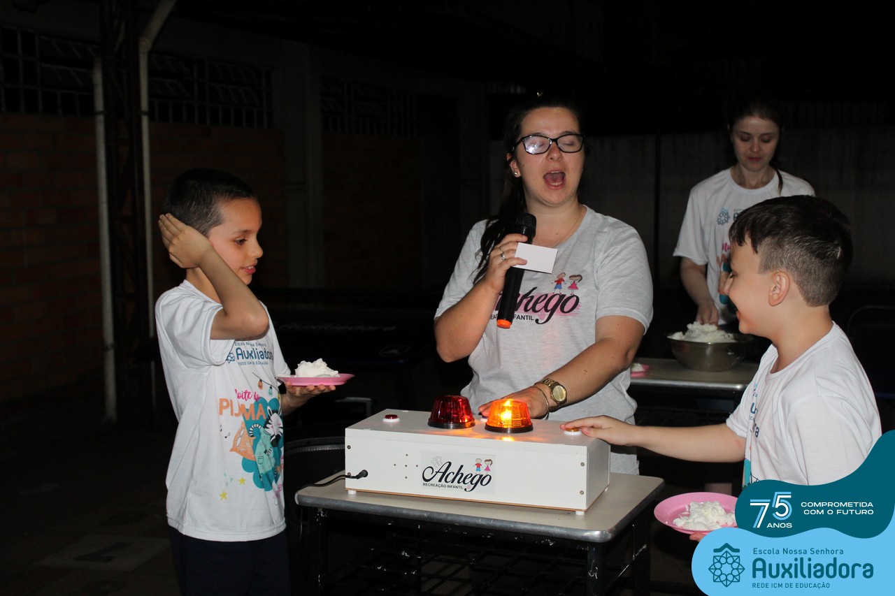 A noite foi de muitas atrações, que fizeram esse dia inesquecível. Teve espelho fotográfico, circuito de brincadeiras com a professora Jenifer, brincadeira “torta na cara” e baladinha com a Achego Recreação Infantil, fogueirinha de marshmallow, brincadeiras recreativas e, para fechar a noite, sessão cinema.