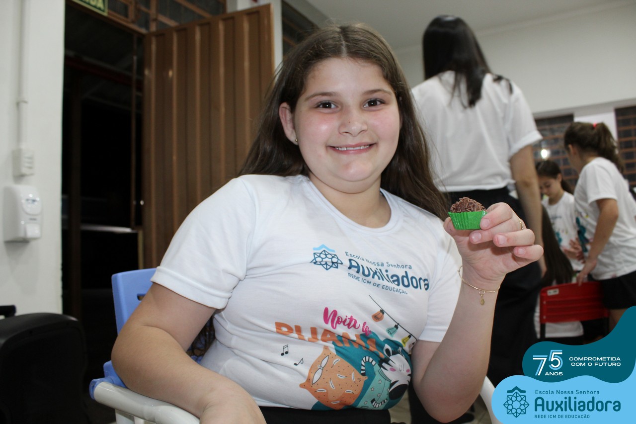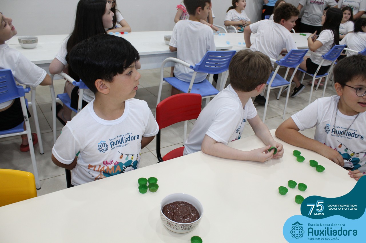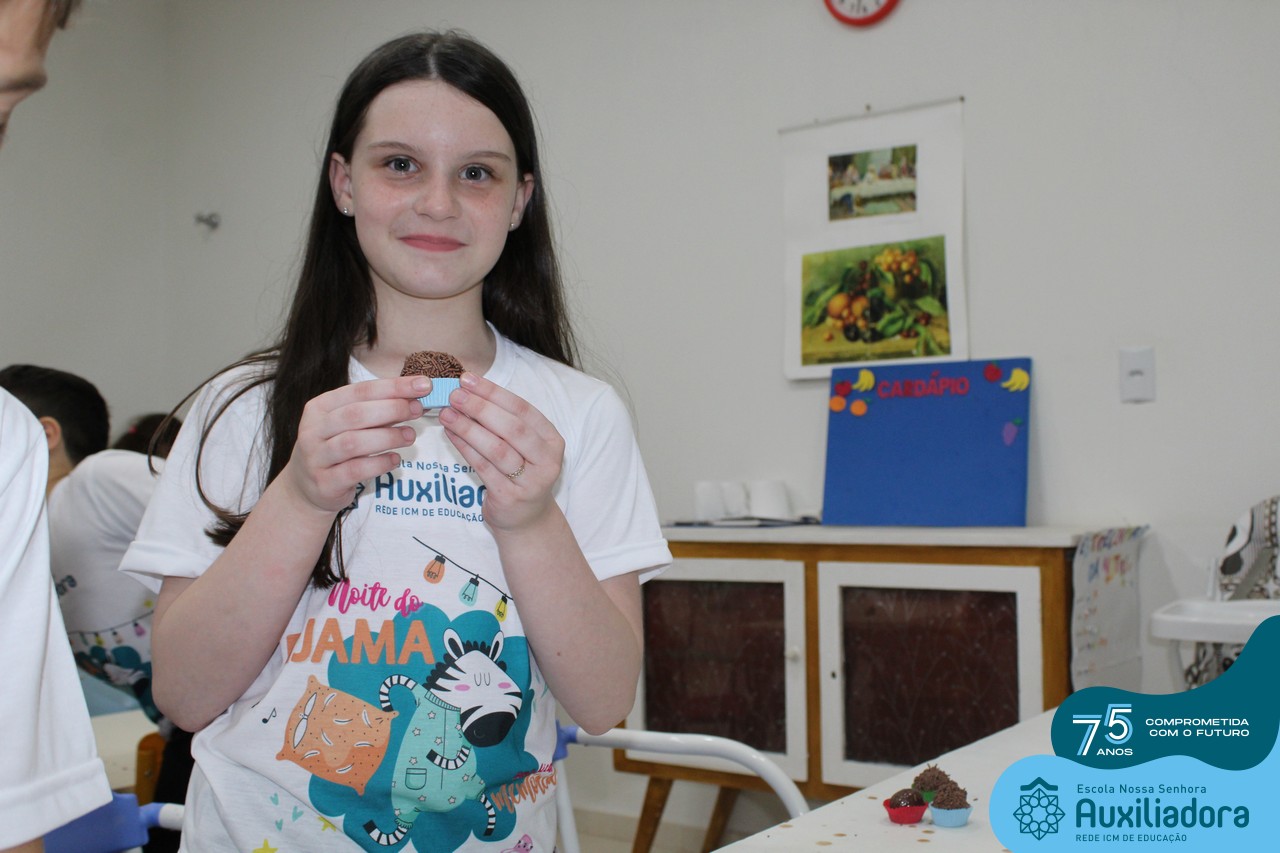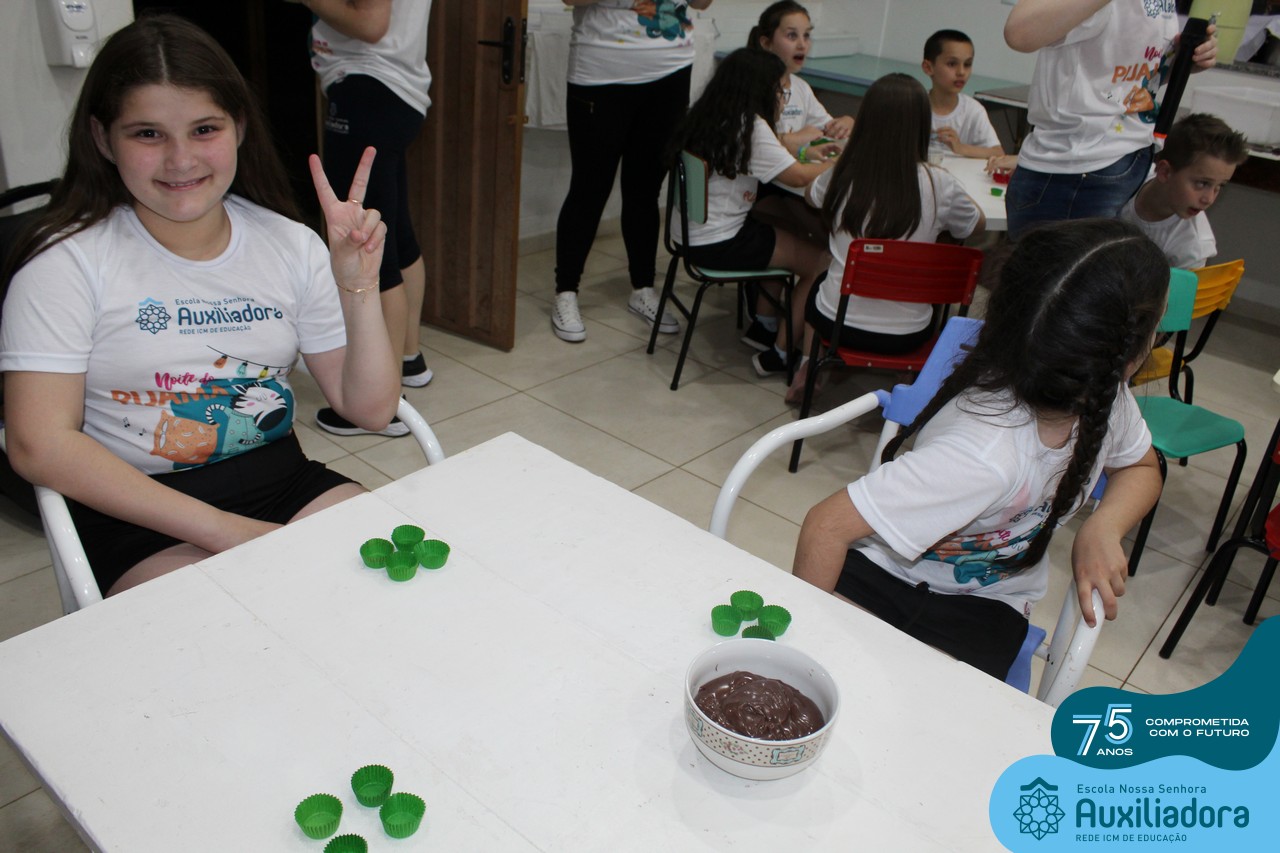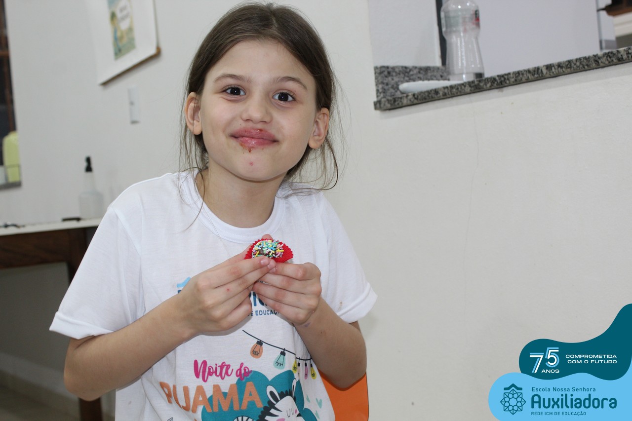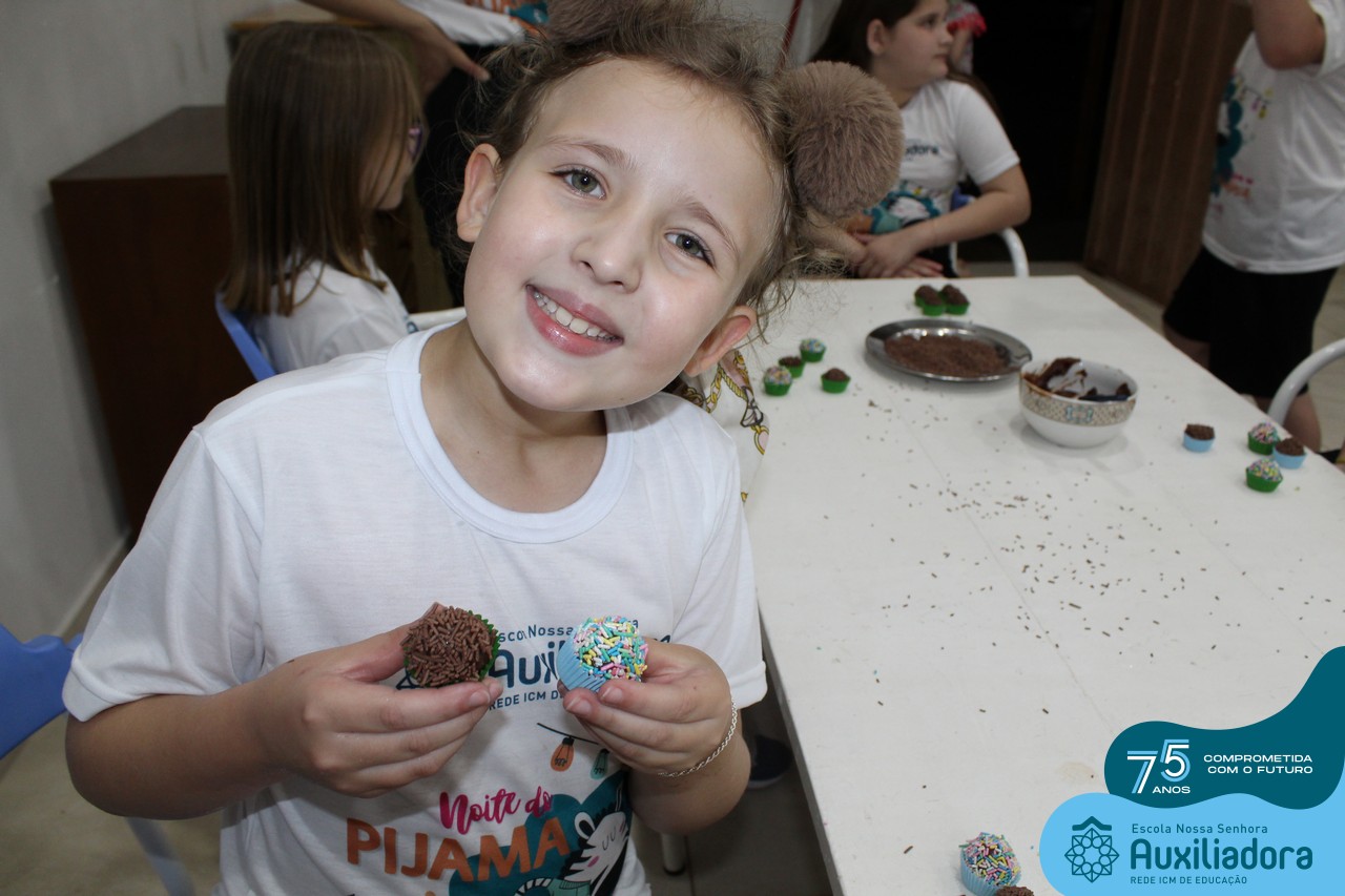 Ah, sem falar no delicioso jantar, com direito a pizza e batata frita! 🍕🍟 Teve sobremesa? 🧁 Claro que sim… Após o jantar, foi realizada uma oficina de docinhos, deliciosa e divertidíssima, com a Paula Bakof.