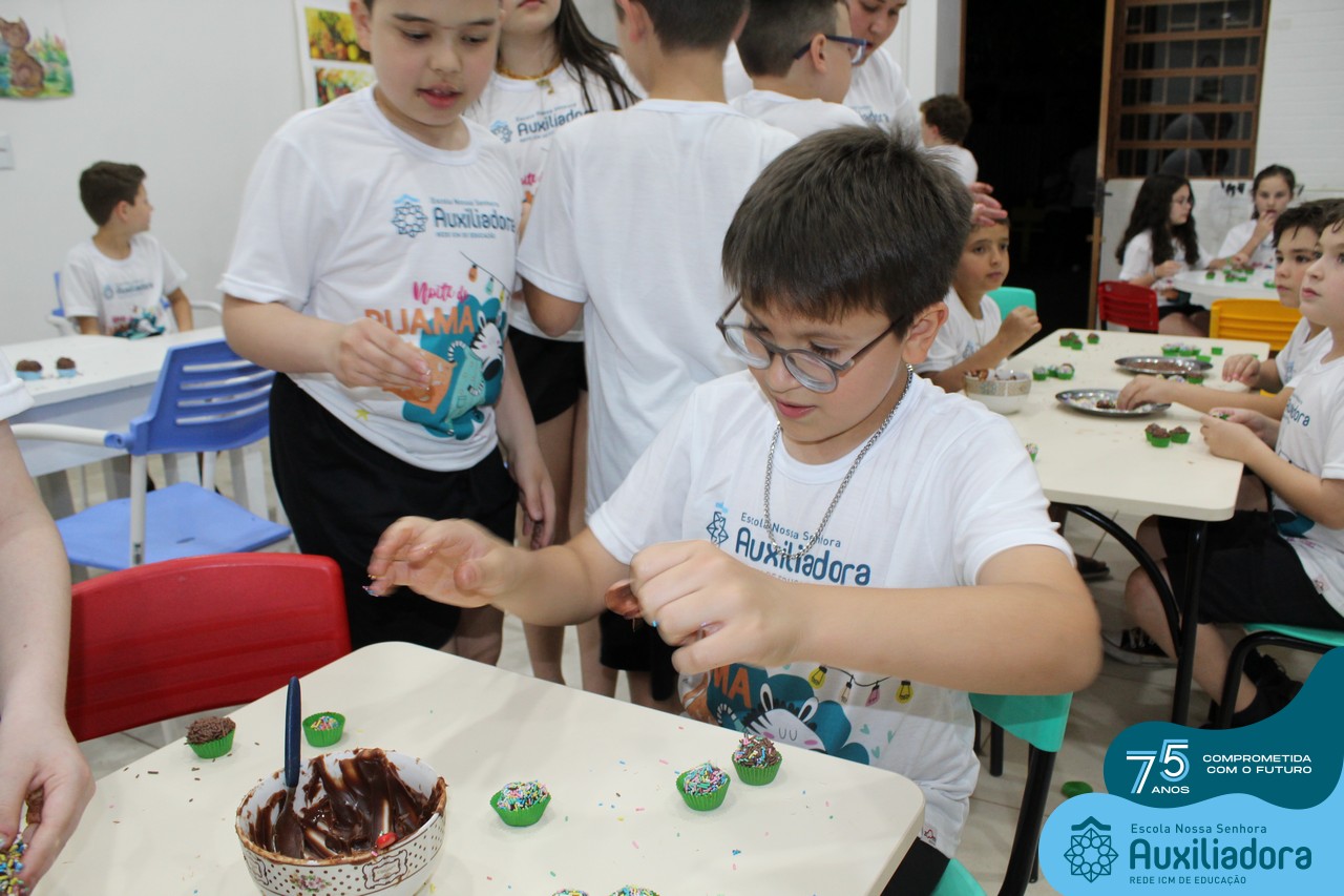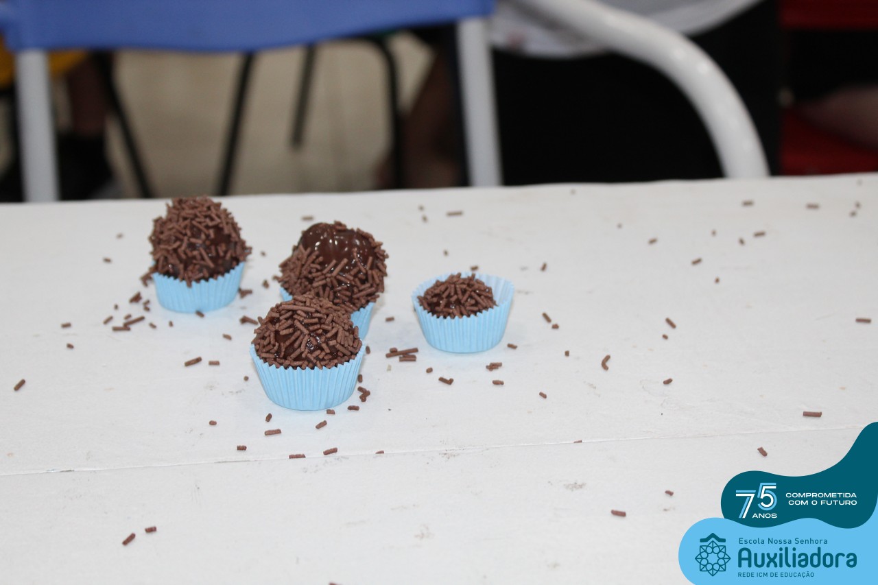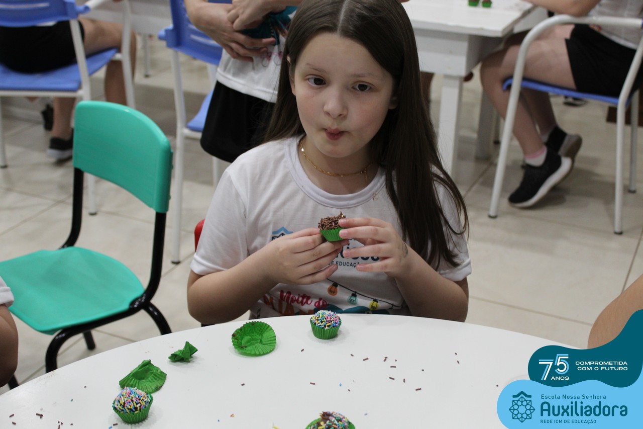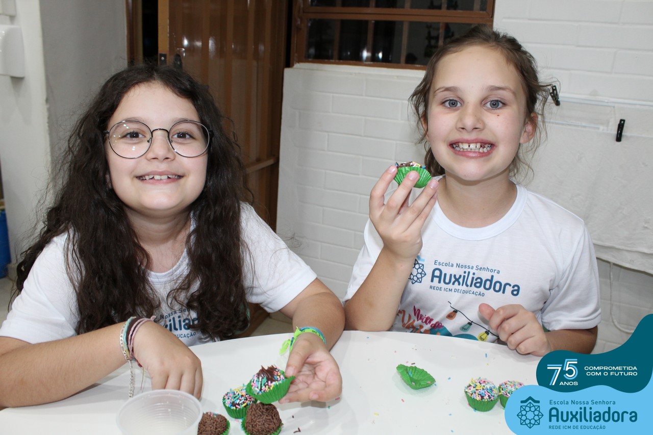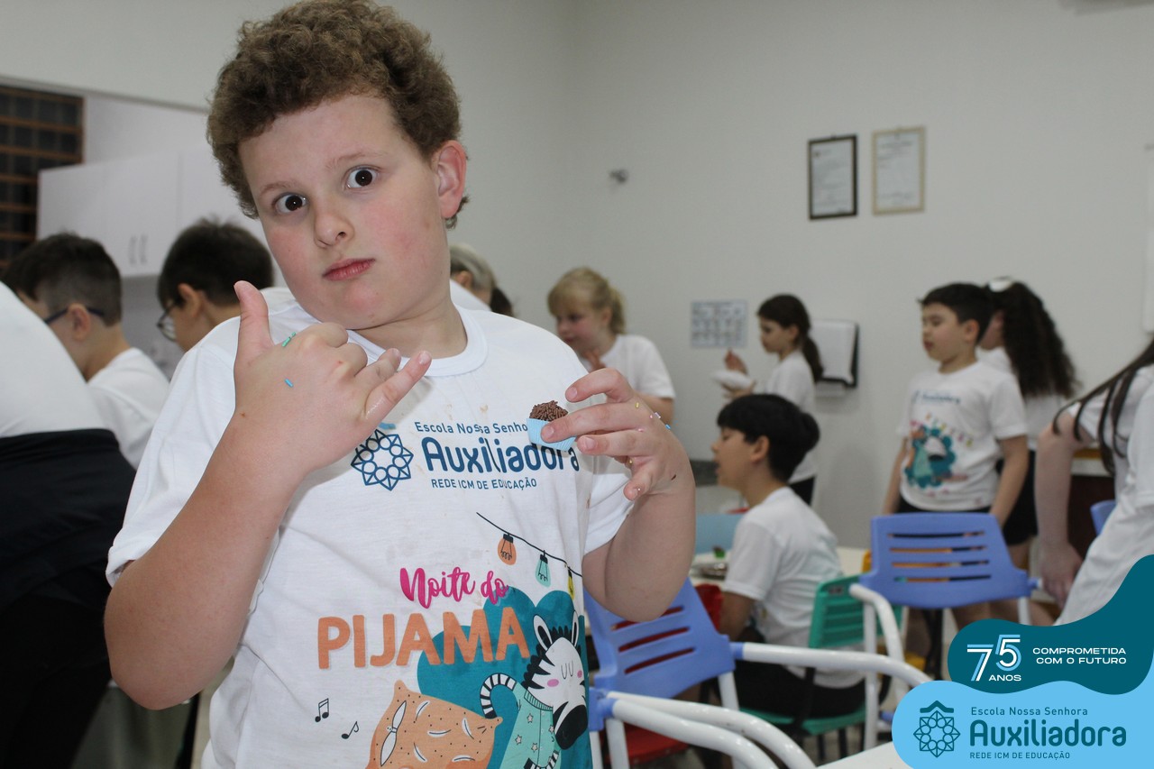 Ah, sem falar no delicioso jantar, com direito a pizza e batata frita! 🍕🍟 Teve sobremesa? 🧁 Claro que sim… Após o jantar, foi realizada uma oficina de docinhos, deliciosa e divertidíssima, com a Paula Bakof.