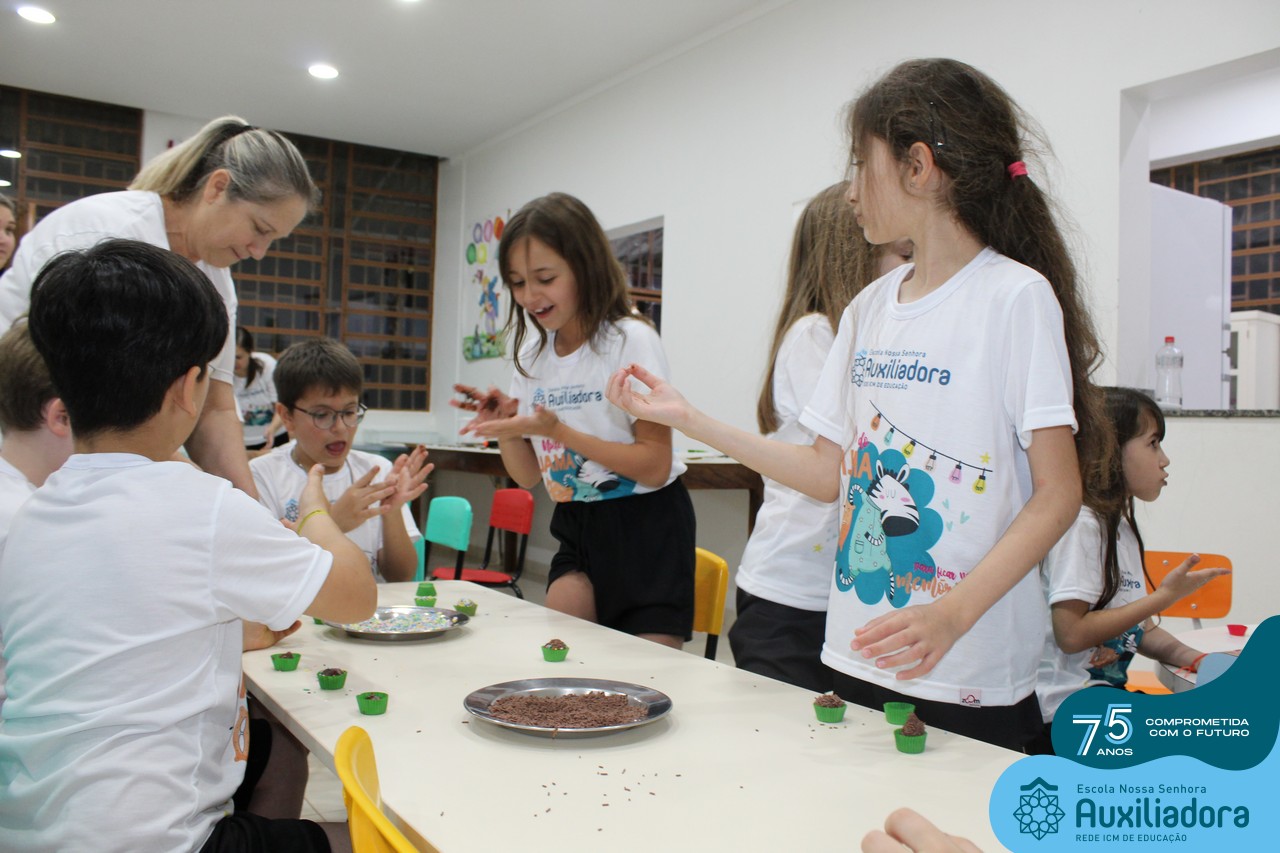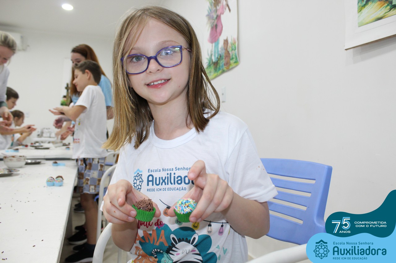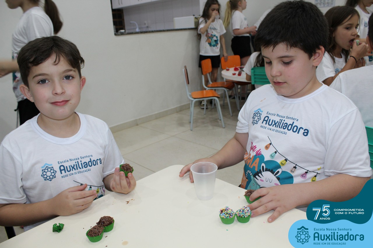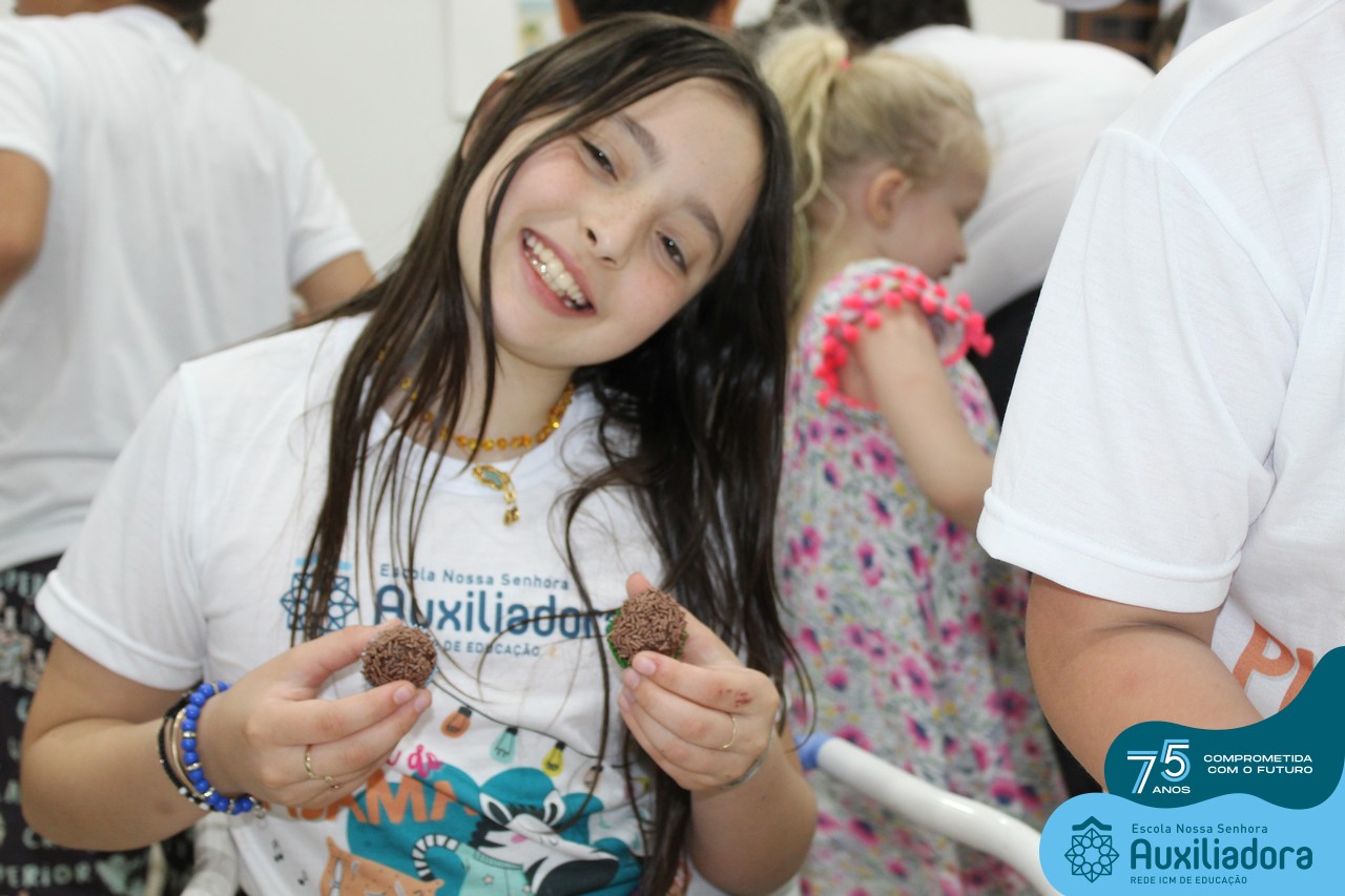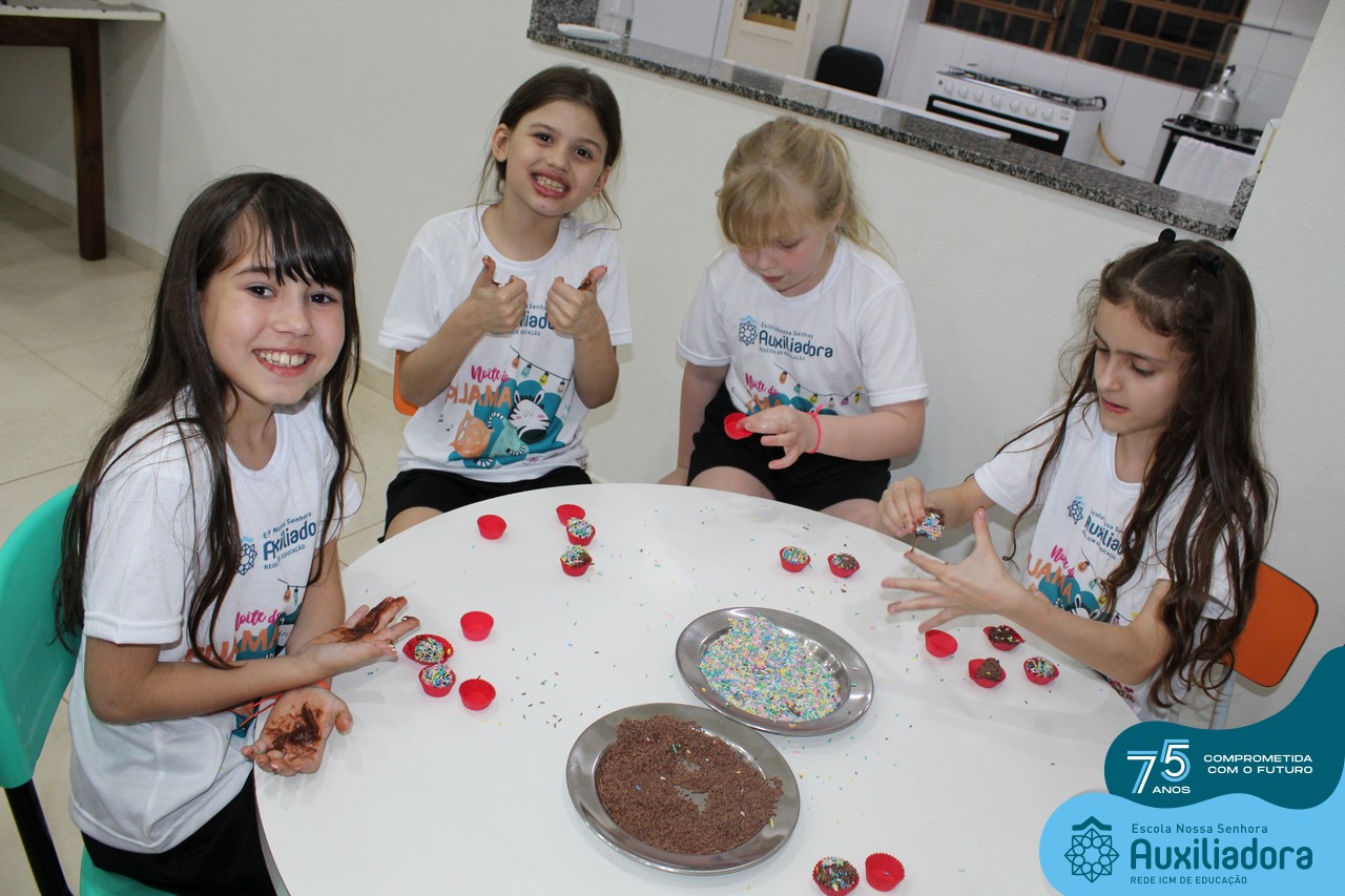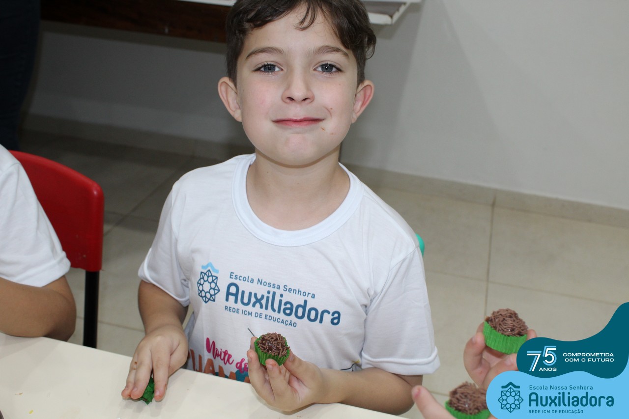 Ah, sem falar no delicioso jantar, com direito a pizza e batata frita! 🍕🍟 Teve sobremesa? 🧁 Claro que sim… Após o jantar, foi realizada uma oficina de docinhos, deliciosa e divertidíssima, com a Paula Bakof.