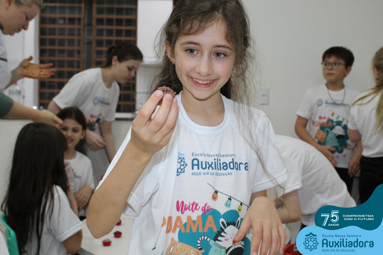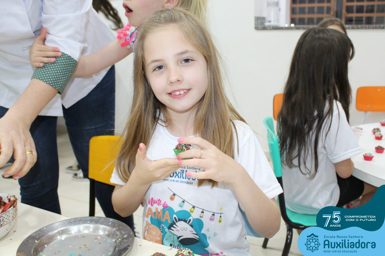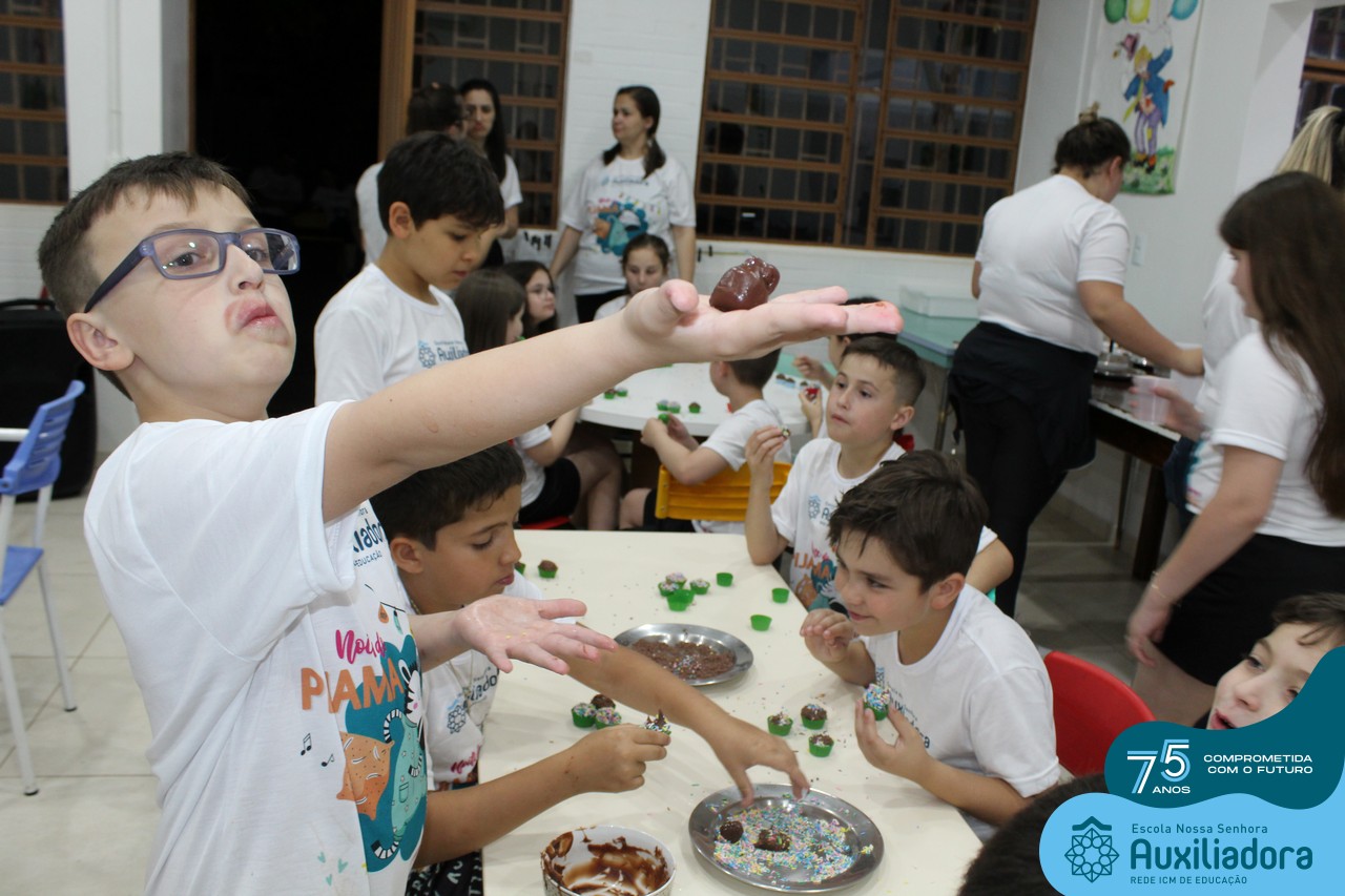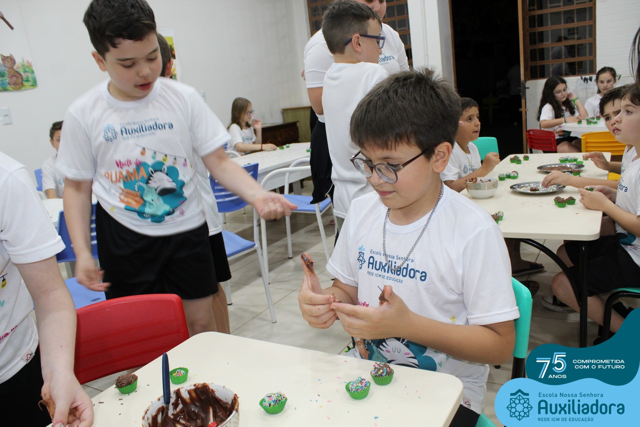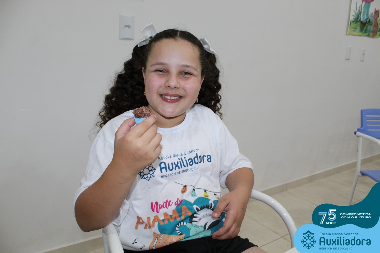 Ah, sem falar no delicioso jantar, com direito a pizza e batata frita! 🍕🍟 Teve sobremesa? 🧁 Claro que sim… Após o jantar, foi realizada uma oficina de docinhos, deliciosa e divertidíssima, com a Paula Bakof.