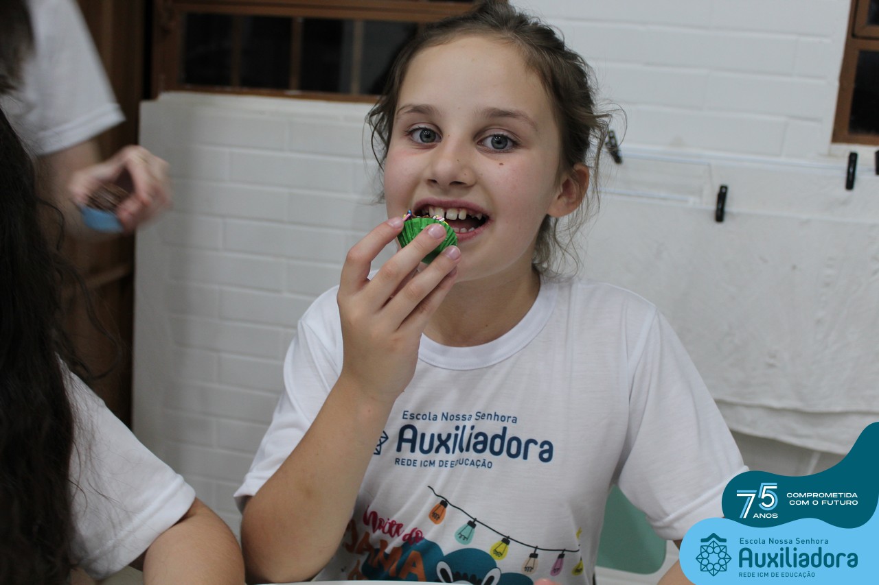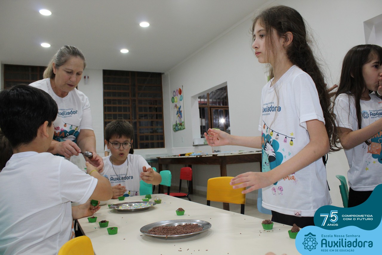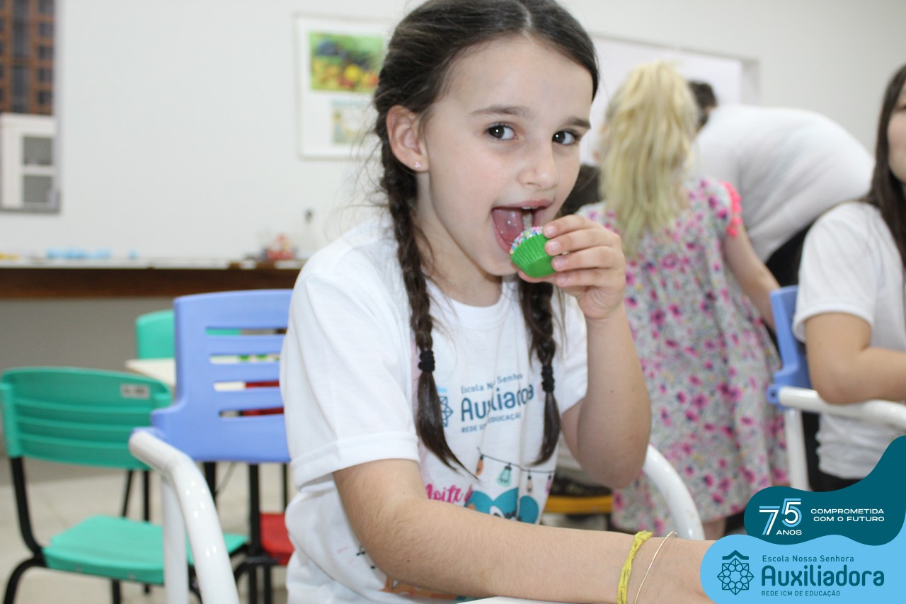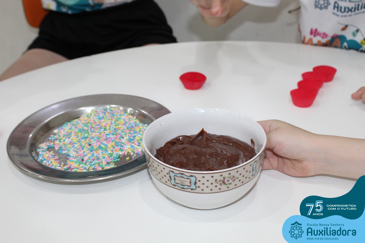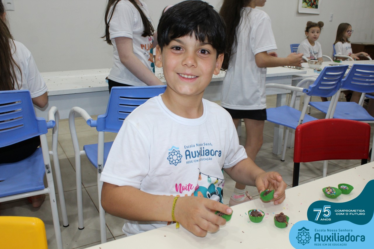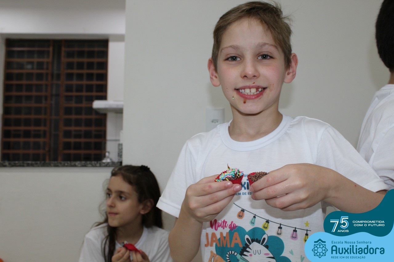 Ah, sem falar no delicioso jantar, com direito a pizza e batata frita! 🍕🍟 Teve sobremesa? 🧁 Claro que sim… Após o jantar, foi realizada uma oficina de docinhos, deliciosa e divertidíssima, com a Paula Bakof.