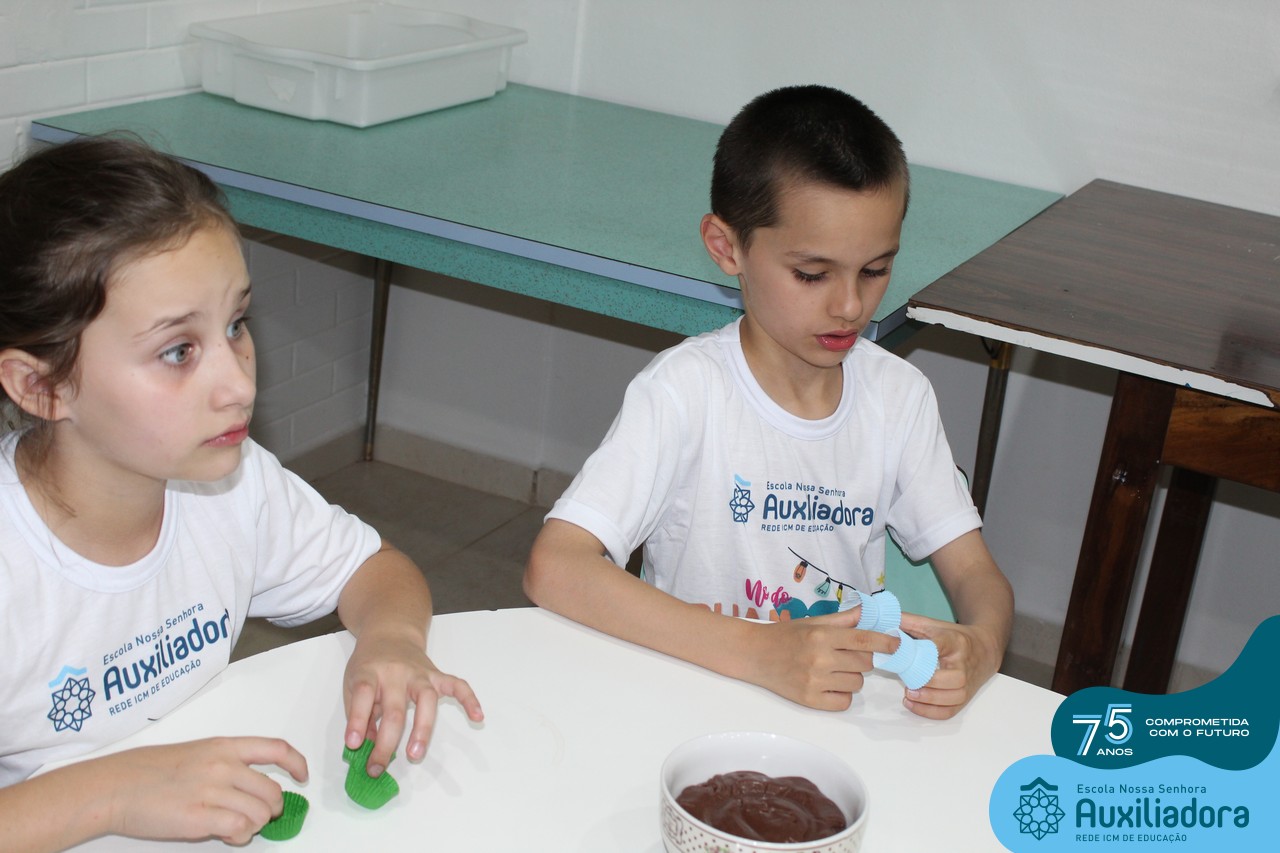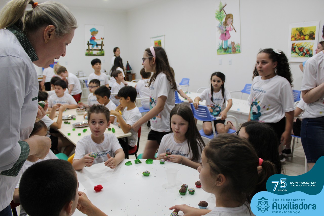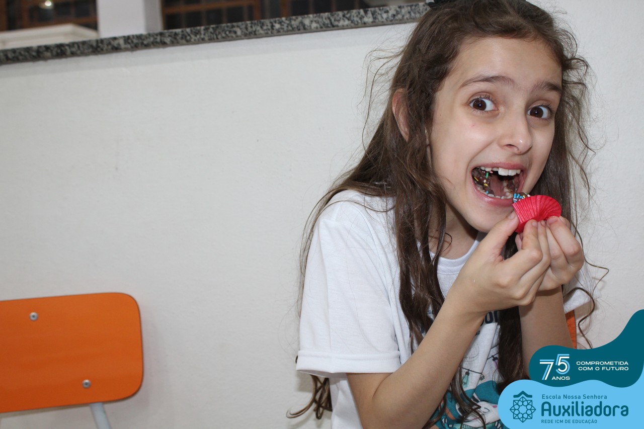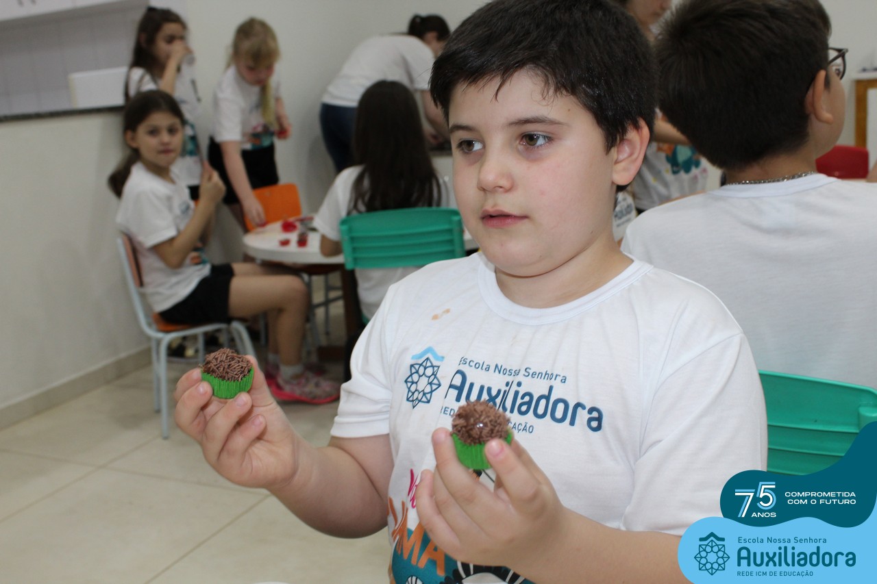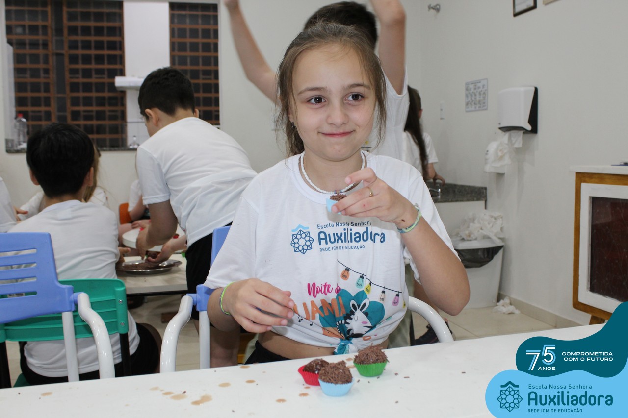 Ah, sem falar no delicioso jantar, com direito a pizza e batata frita! 🍕🍟 Teve sobremesa? 🧁 Claro que sim… Após o jantar, foi realizada uma oficina de docinhos, deliciosa e divertidíssima, com a Paula Bakof.