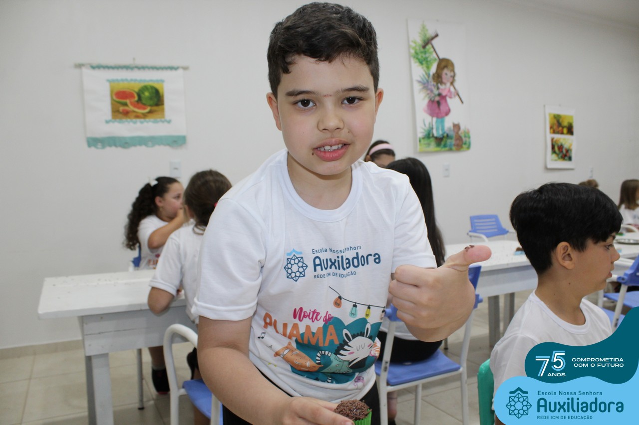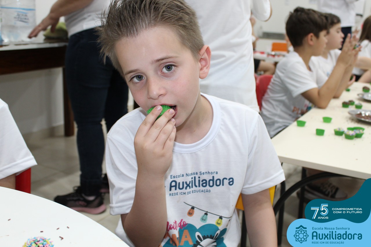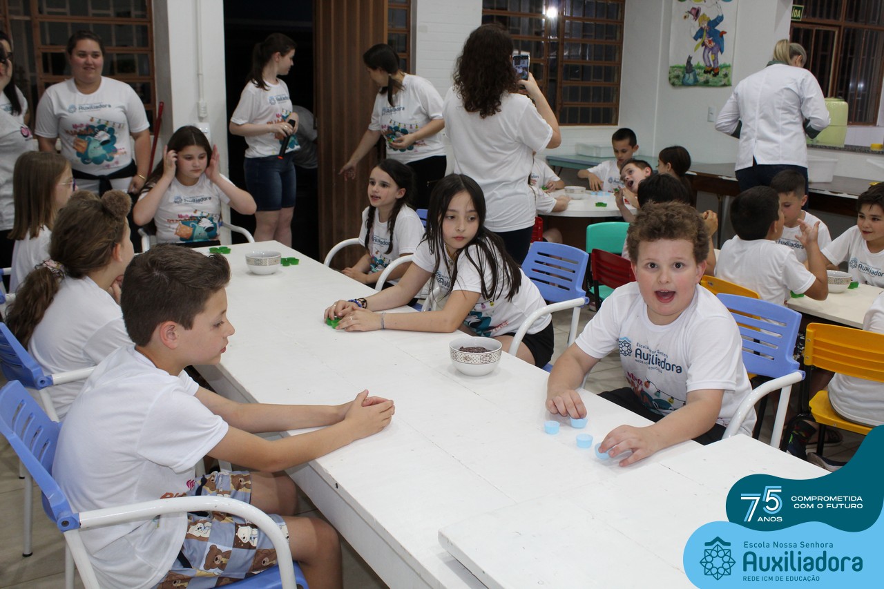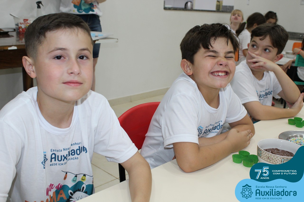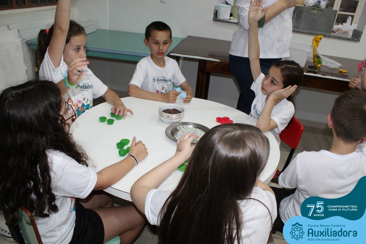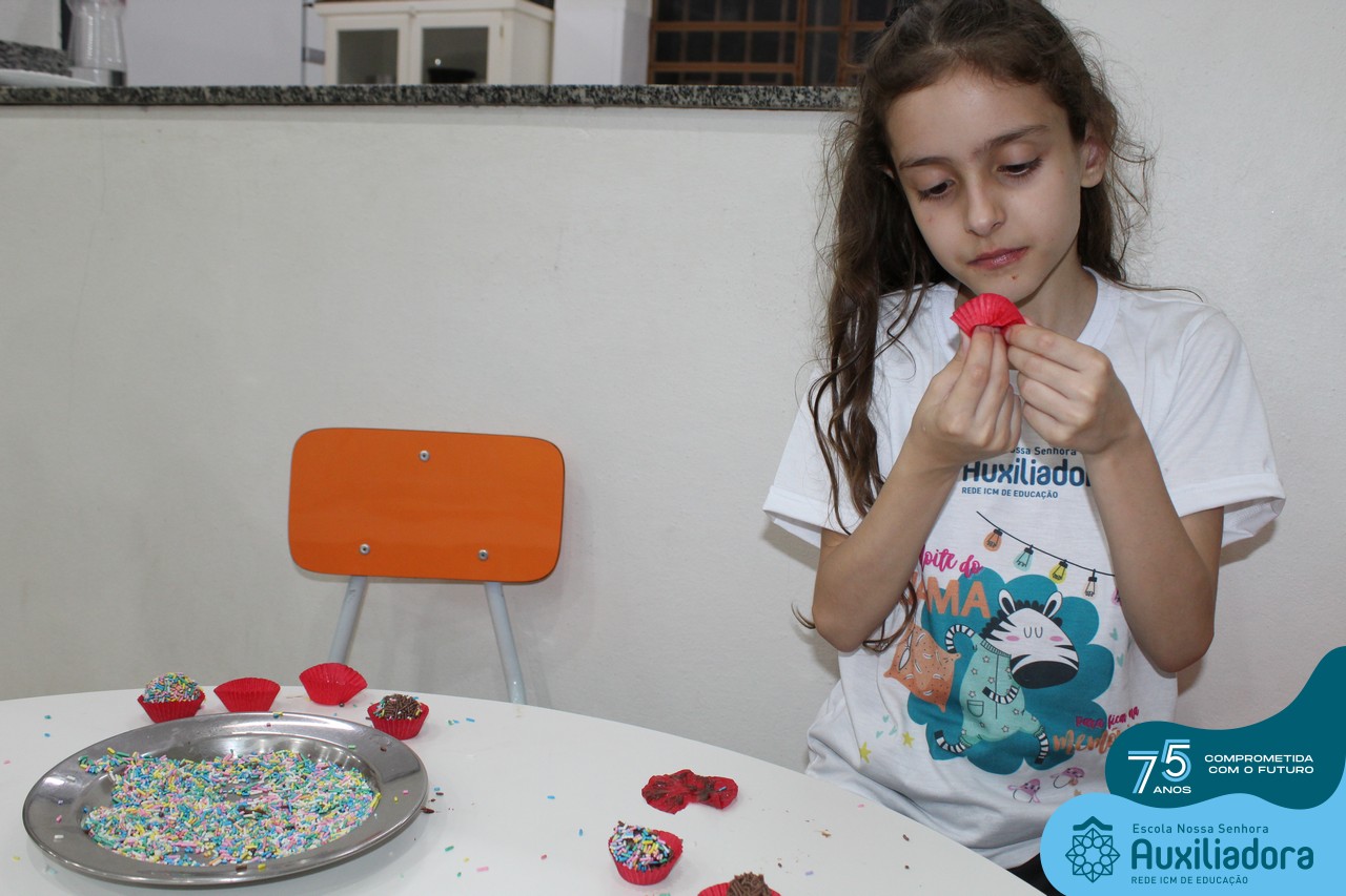 Ah, sem falar no delicioso jantar, com direito a pizza e batata frita! 🍕🍟 Teve sobremesa? 🧁 Claro que sim… Após o jantar, foi realizada uma oficina de docinhos, deliciosa e divertidíssima, com a Paula Bakof.