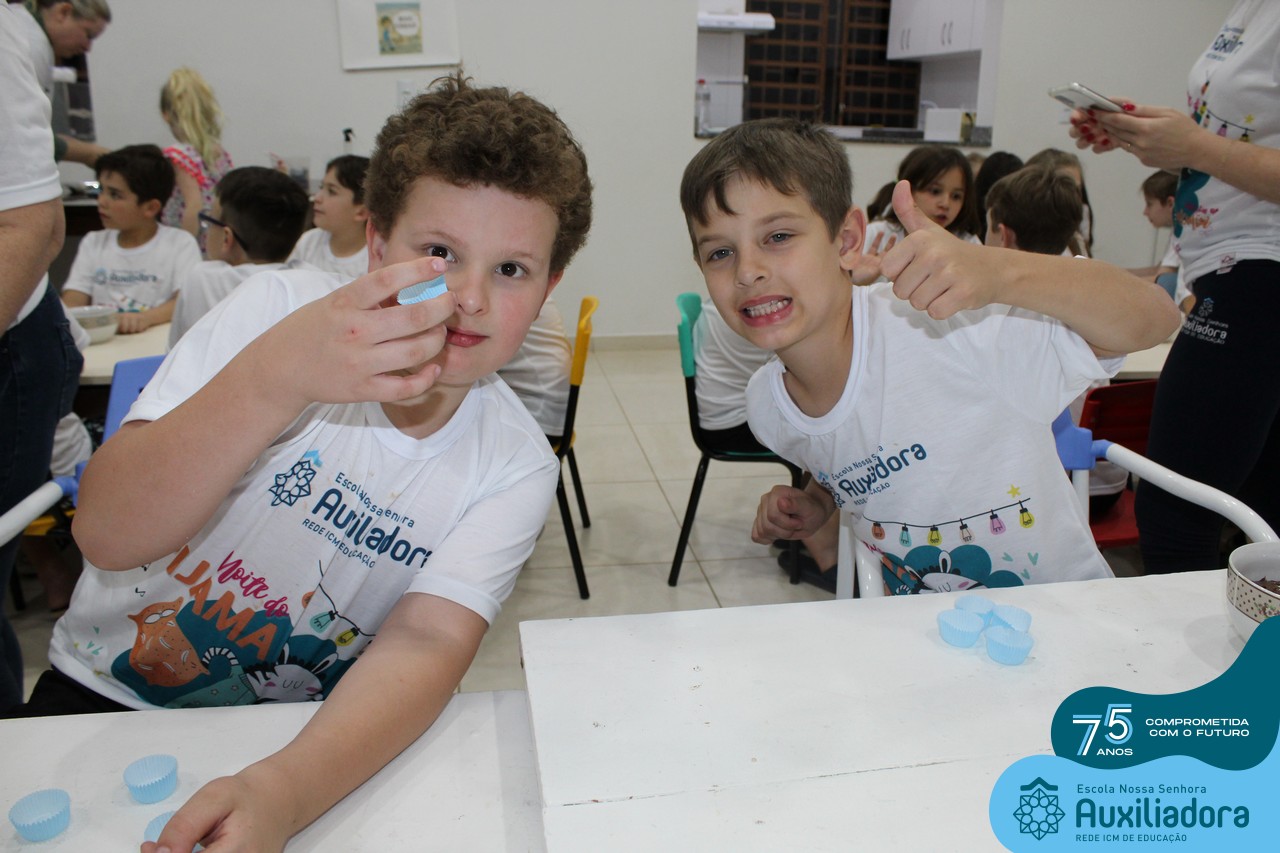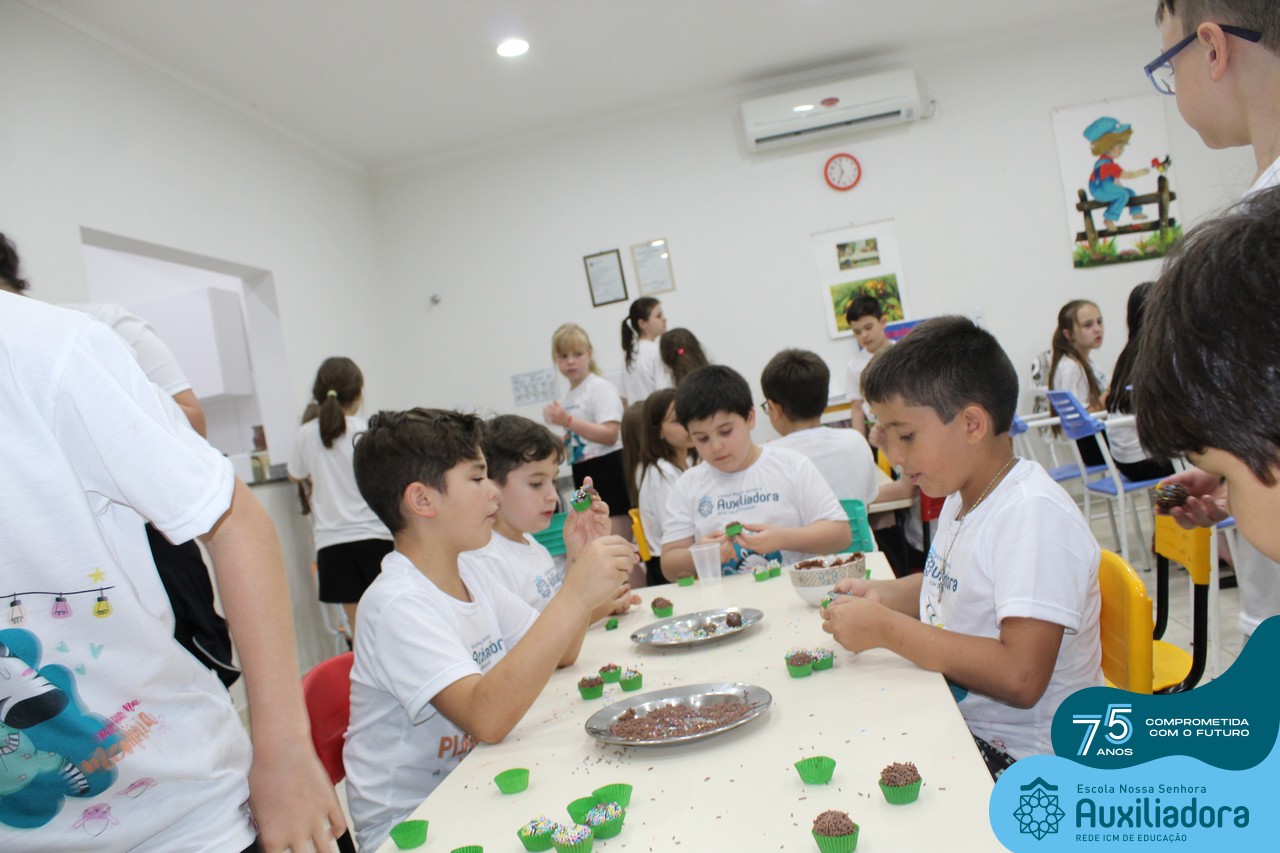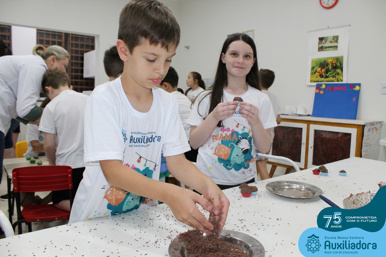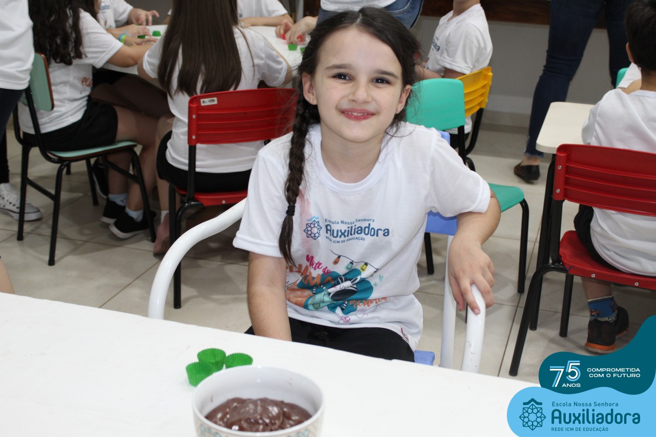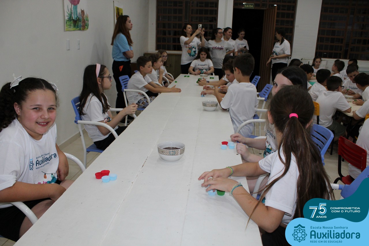 Ah, sem falar no delicioso jantar, com direito a pizza e batata frita! 🍕🍟 Teve sobremesa? 🧁 Claro que sim… Após o jantar, foi realizada uma oficina de docinhos, deliciosa e divertidíssima, com a Paula Bakof.
