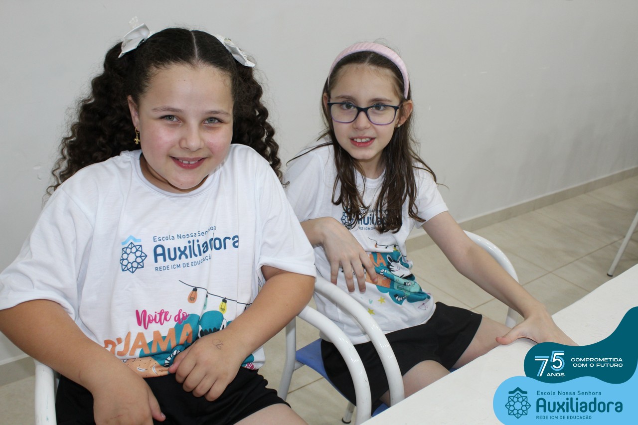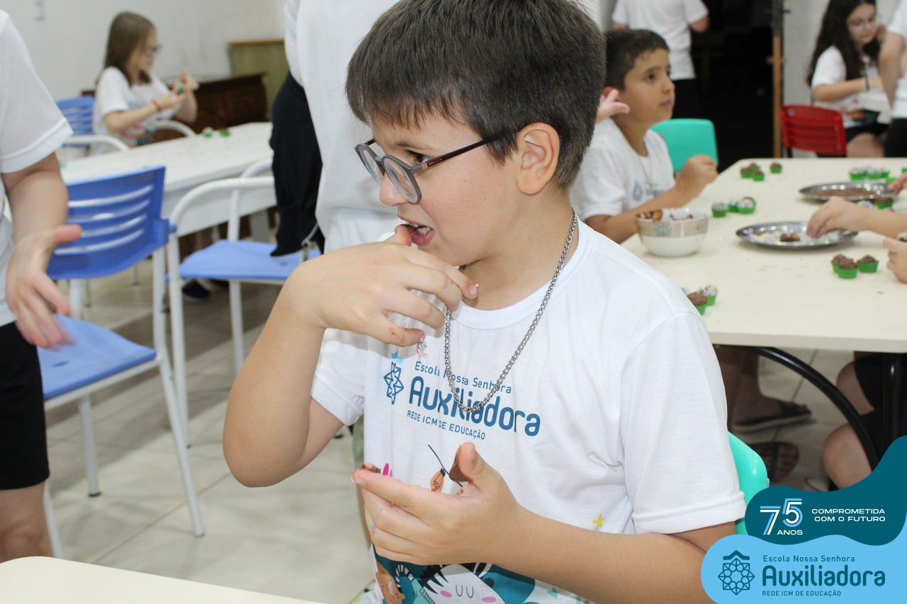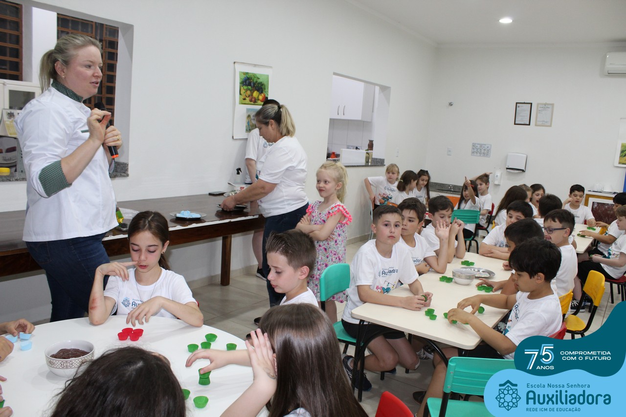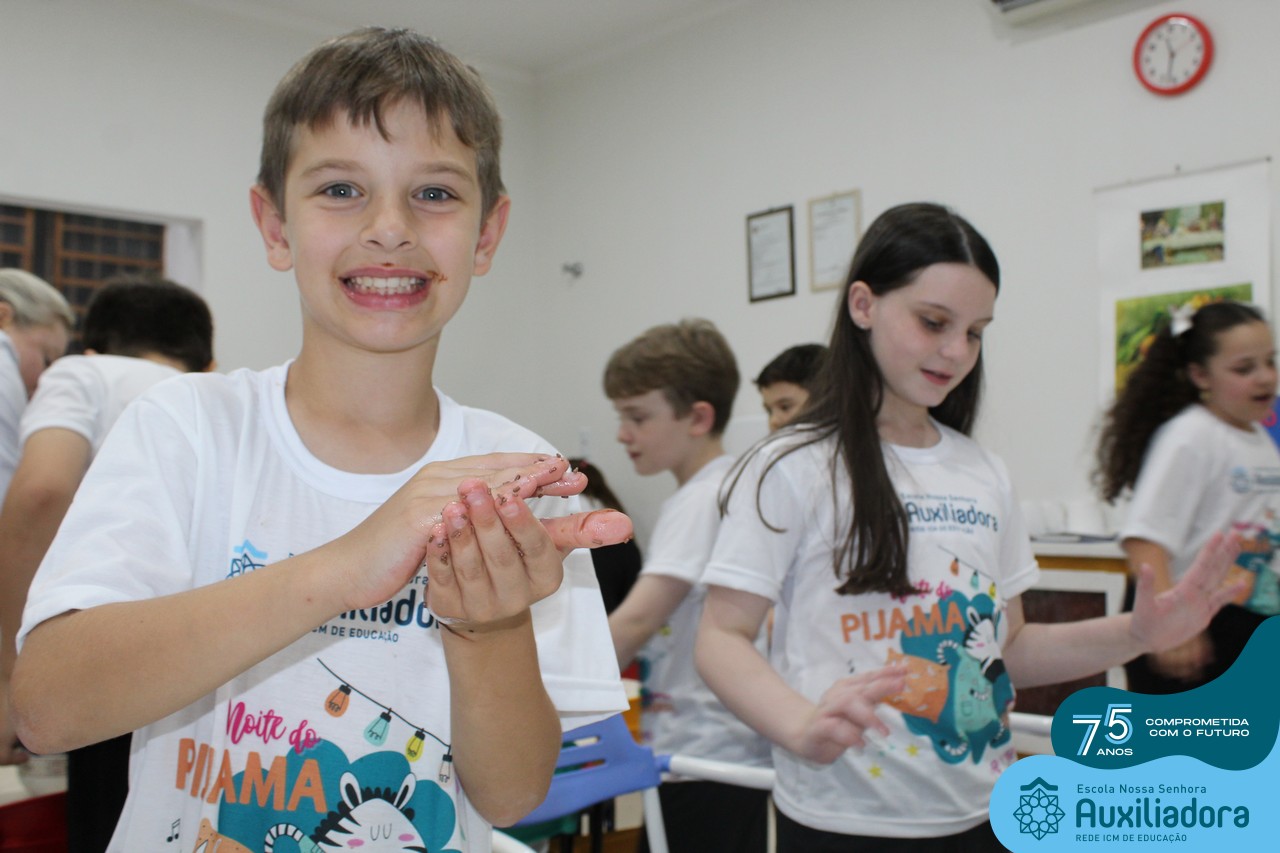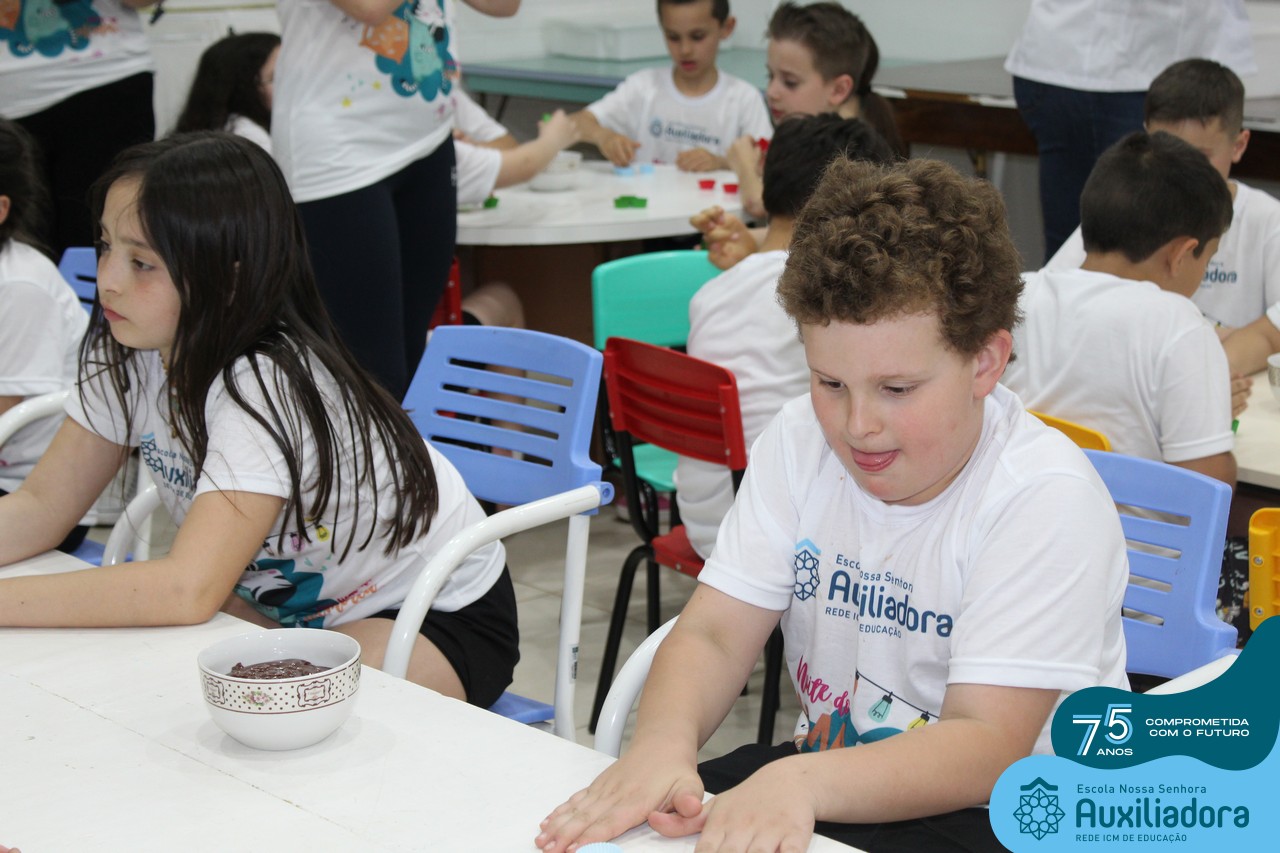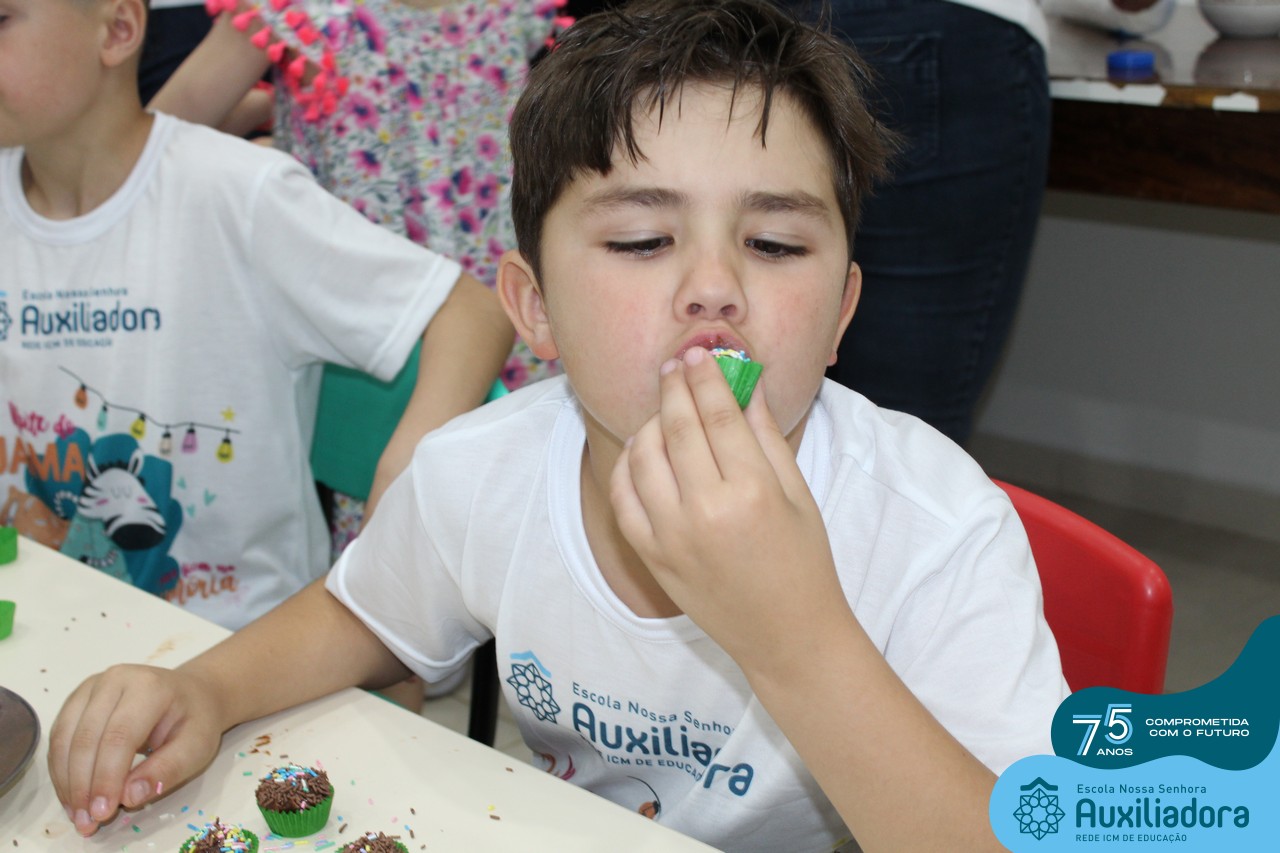 Ah, sem falar no delicioso jantar, com direito a pizza e batata frita! 🍕🍟 Teve sobremesa? 🧁 Claro que sim… Após o jantar, foi realizada uma oficina de docinhos, deliciosa e divertidíssima, com a Paula Bakof.
