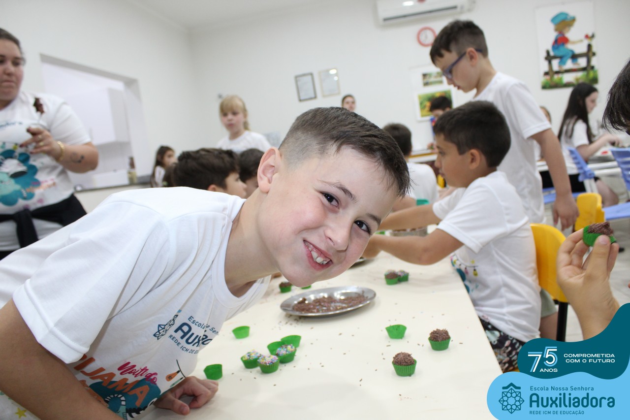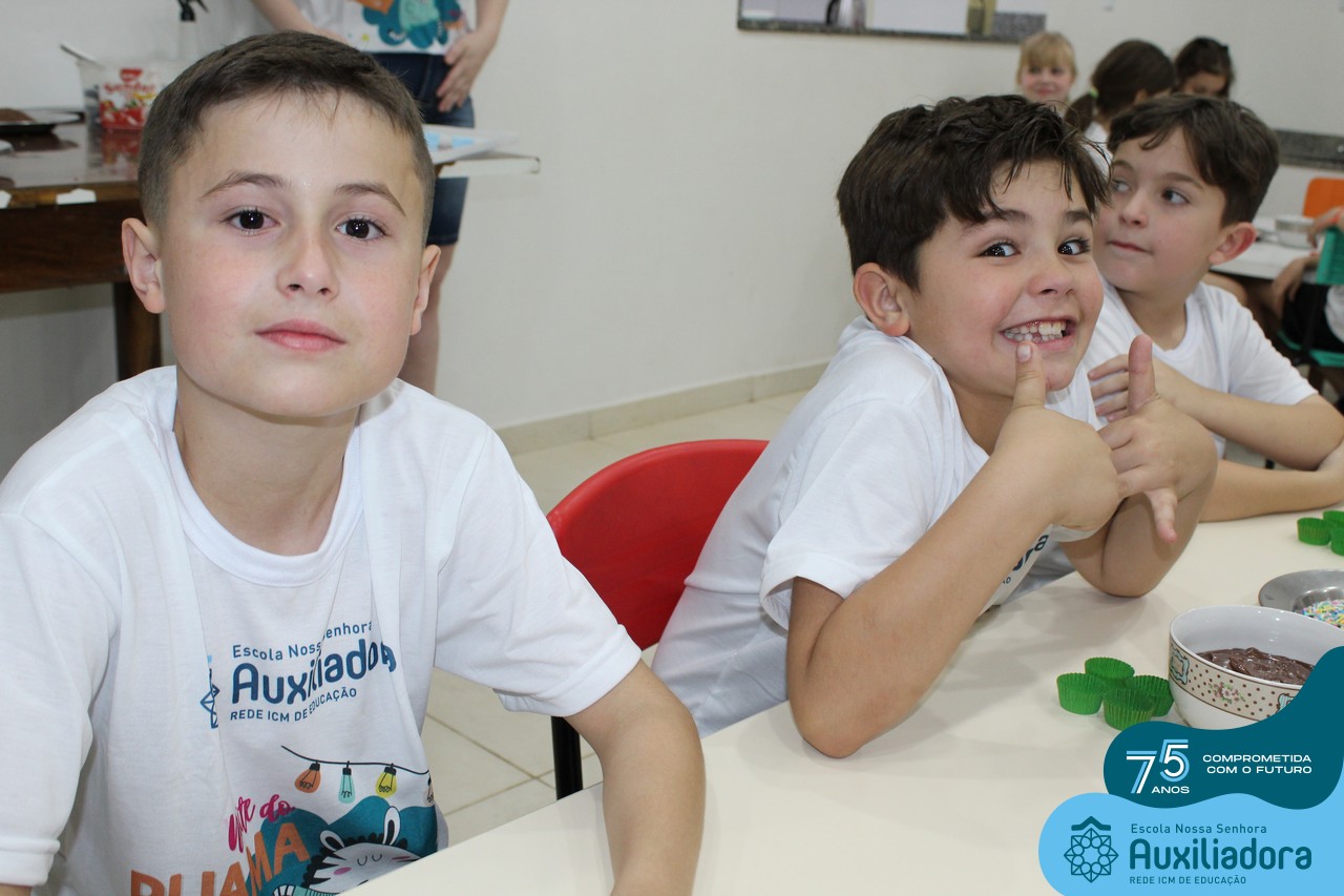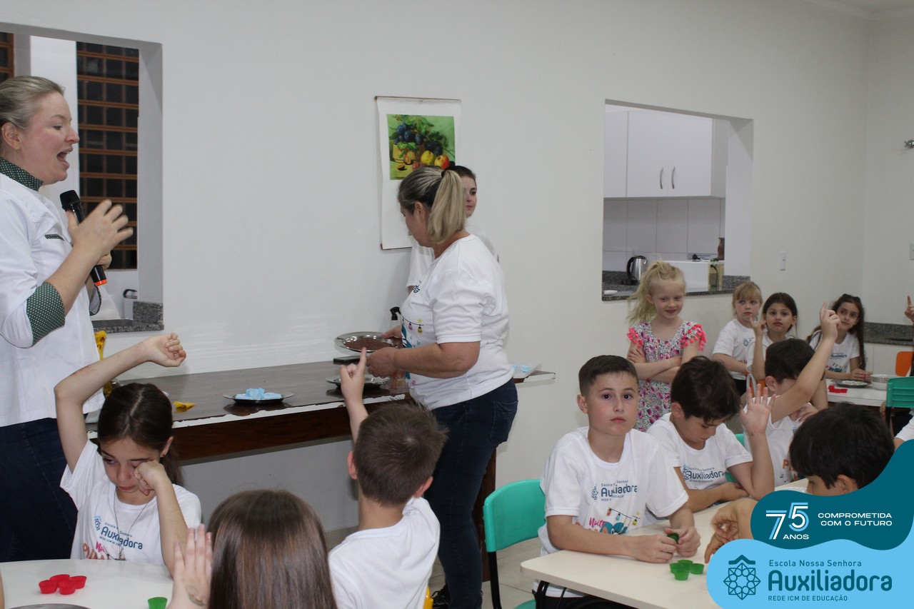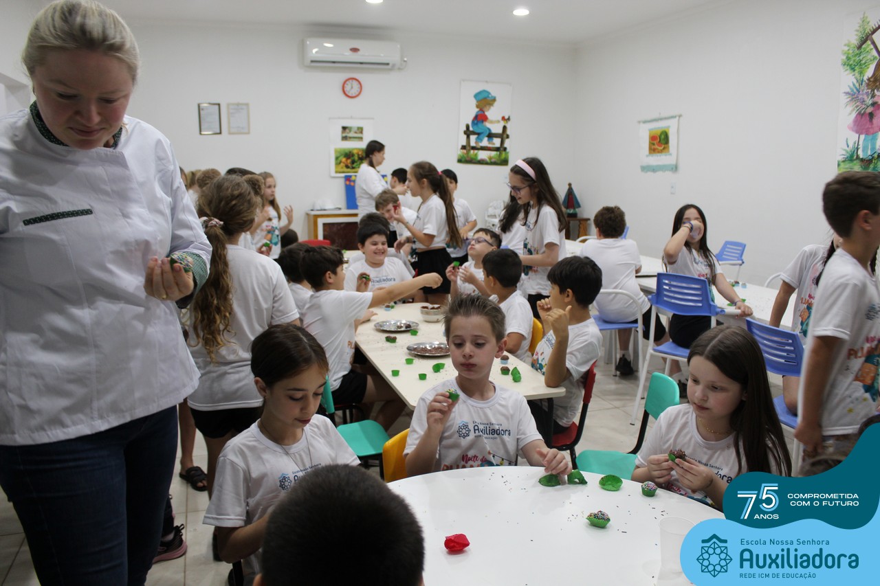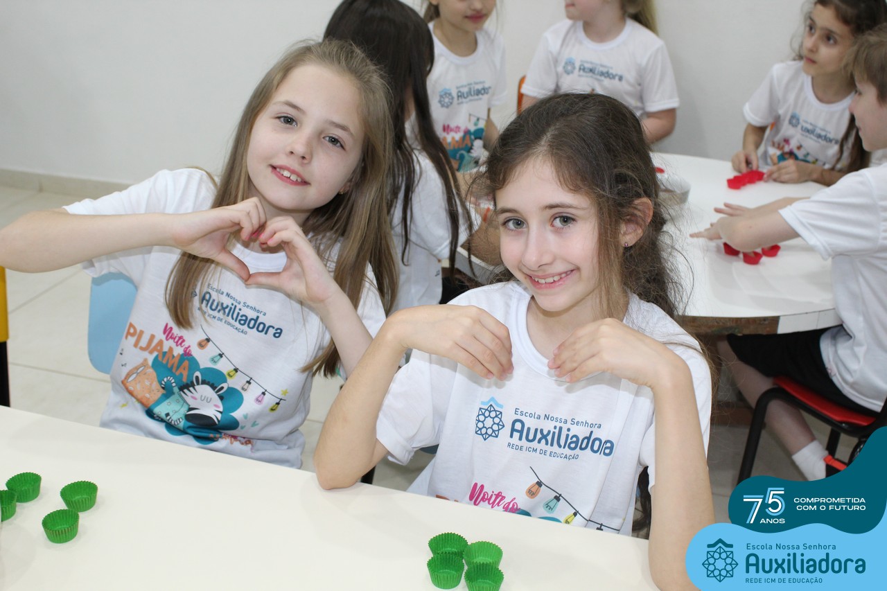 Ah, sem falar no delicioso jantar, com direito a pizza e batata frita! 🍕🍟 Teve sobremesa? 🧁 Claro que sim… Após o jantar, foi realizada uma oficina de docinhos, deliciosa e divertidíssima, com a Paula Bakof.