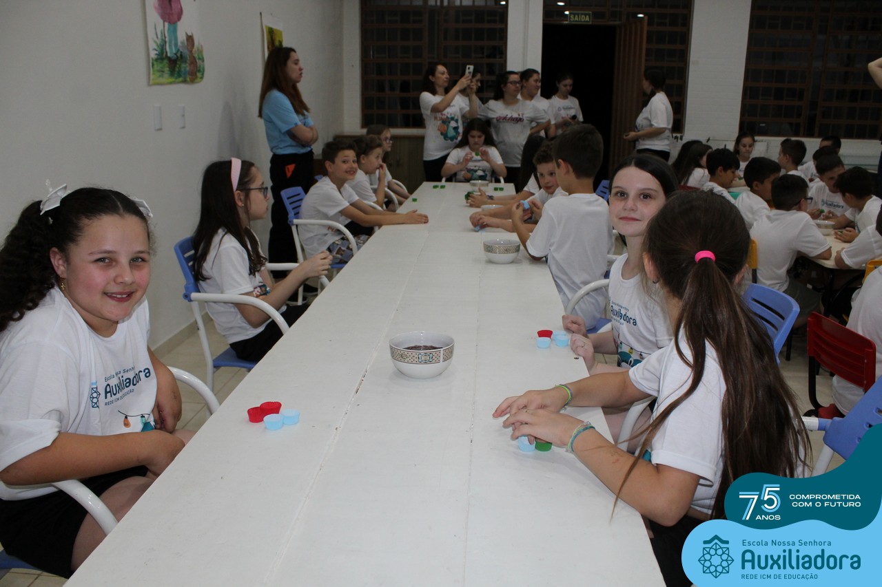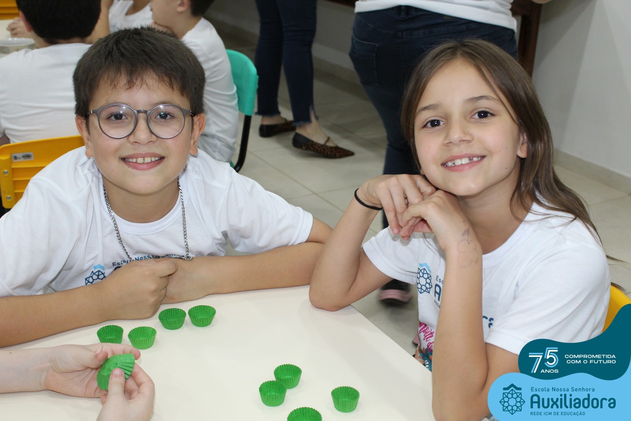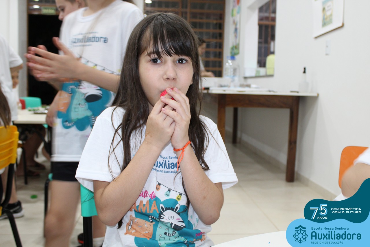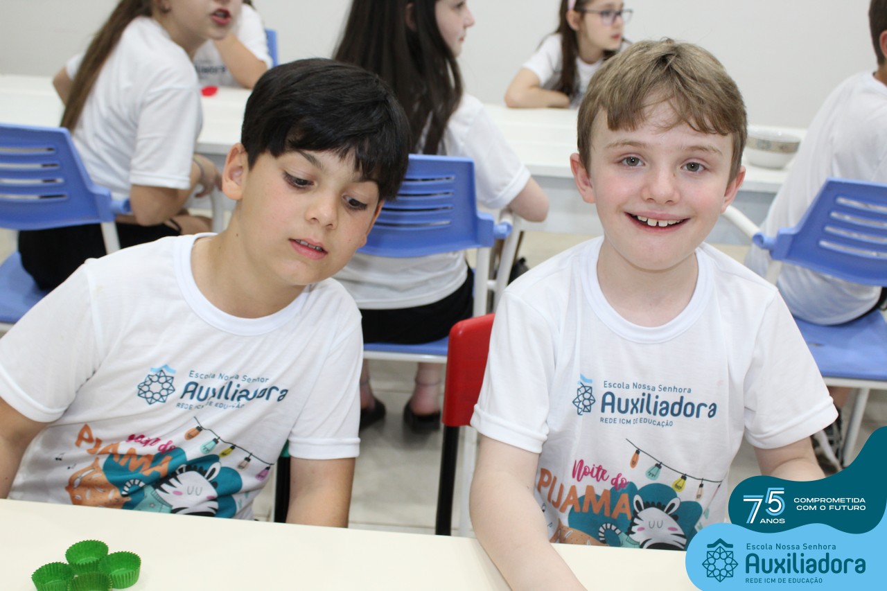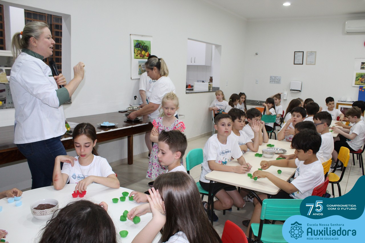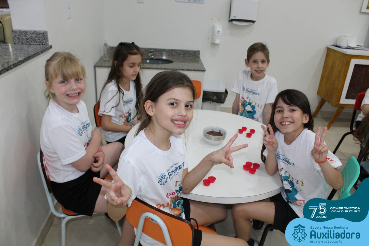 Ah, sem falar no delicioso jantar, com direito a pizza e batata frita! 🍕🍟 Teve sobremesa? 🧁 Claro que sim… Após o jantar, foi realizada uma oficina de docinhos, deliciosa e divertidíssima, com a Paula Bakof.