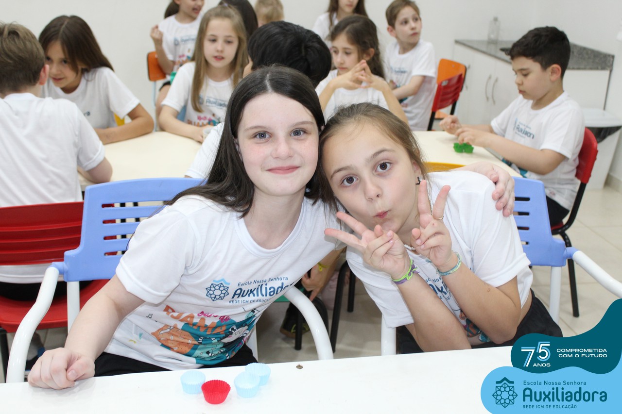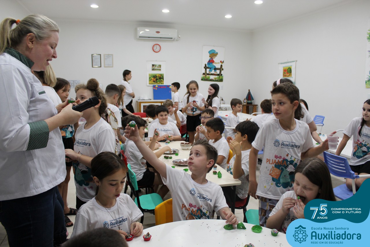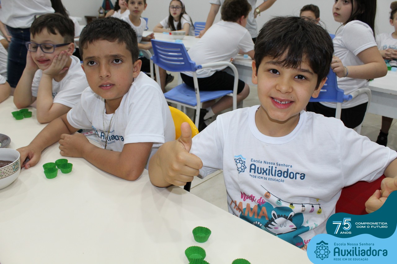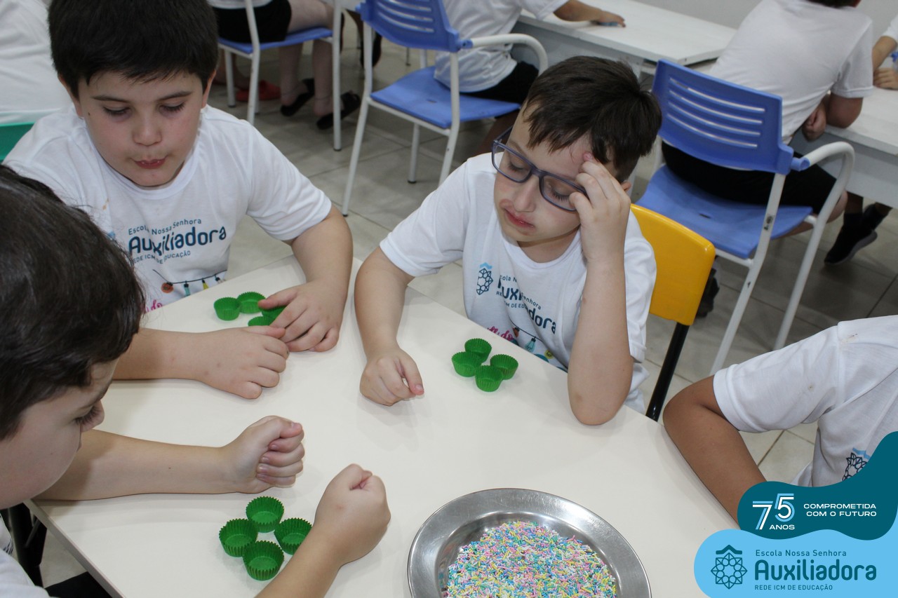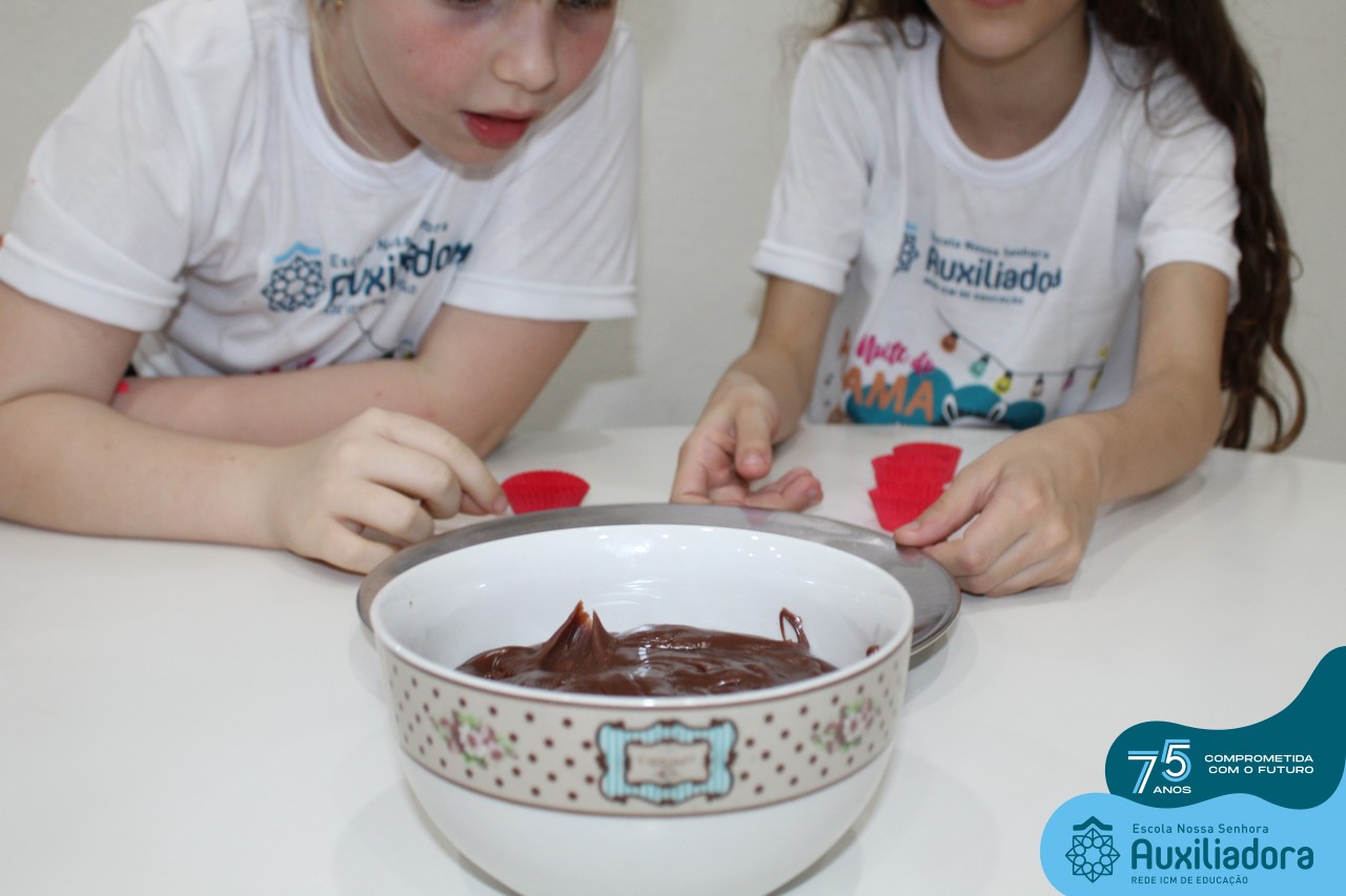 Ah, sem falar no delicioso jantar, com direito a pizza e batata frita! 🍕🍟 Teve sobremesa? 🧁 Claro que sim… Após o jantar, foi realizada uma oficina de docinhos, deliciosa e divertidíssima, com a Paula Bakof.