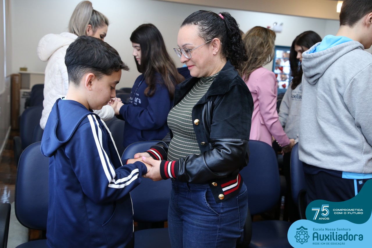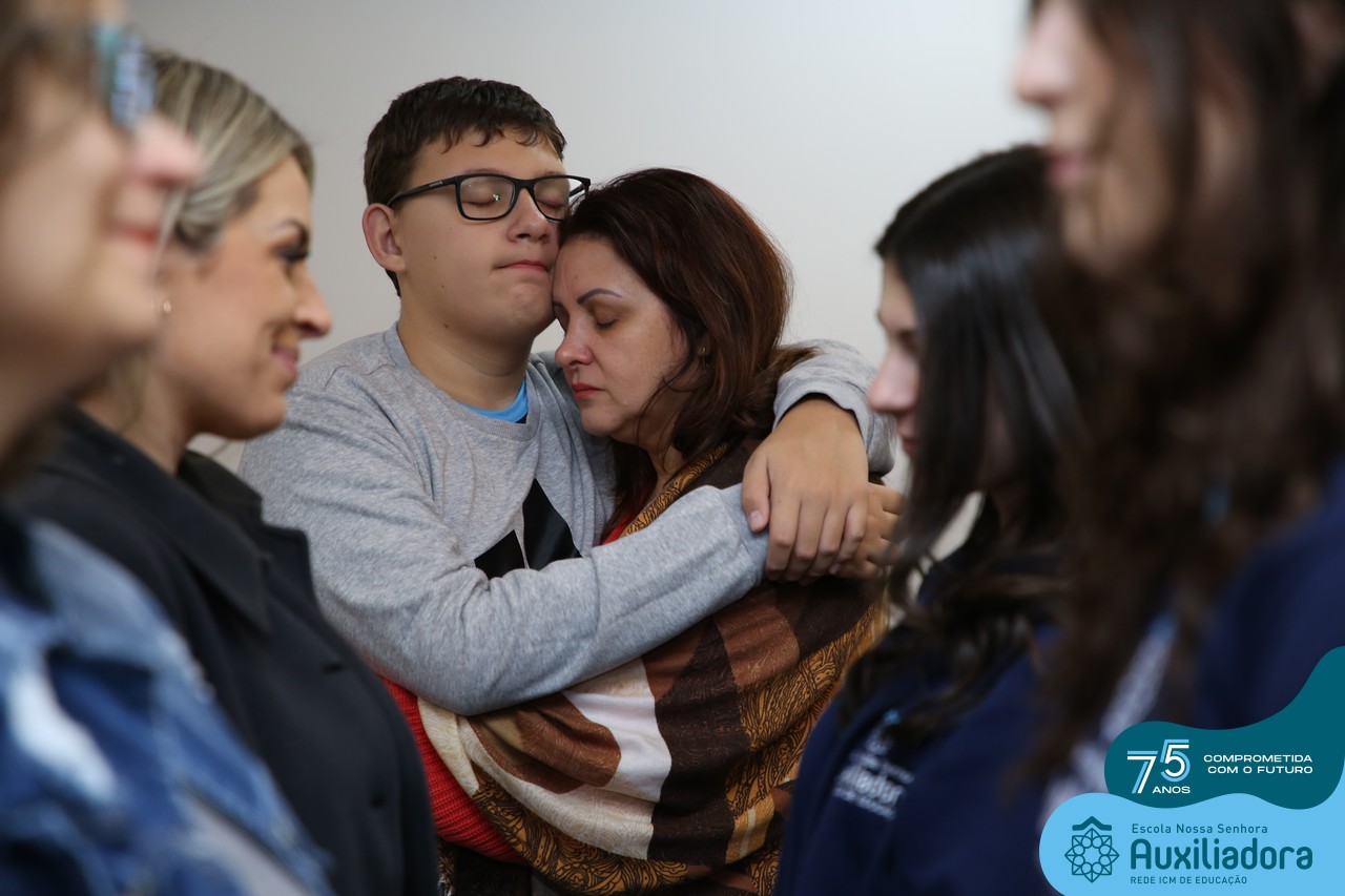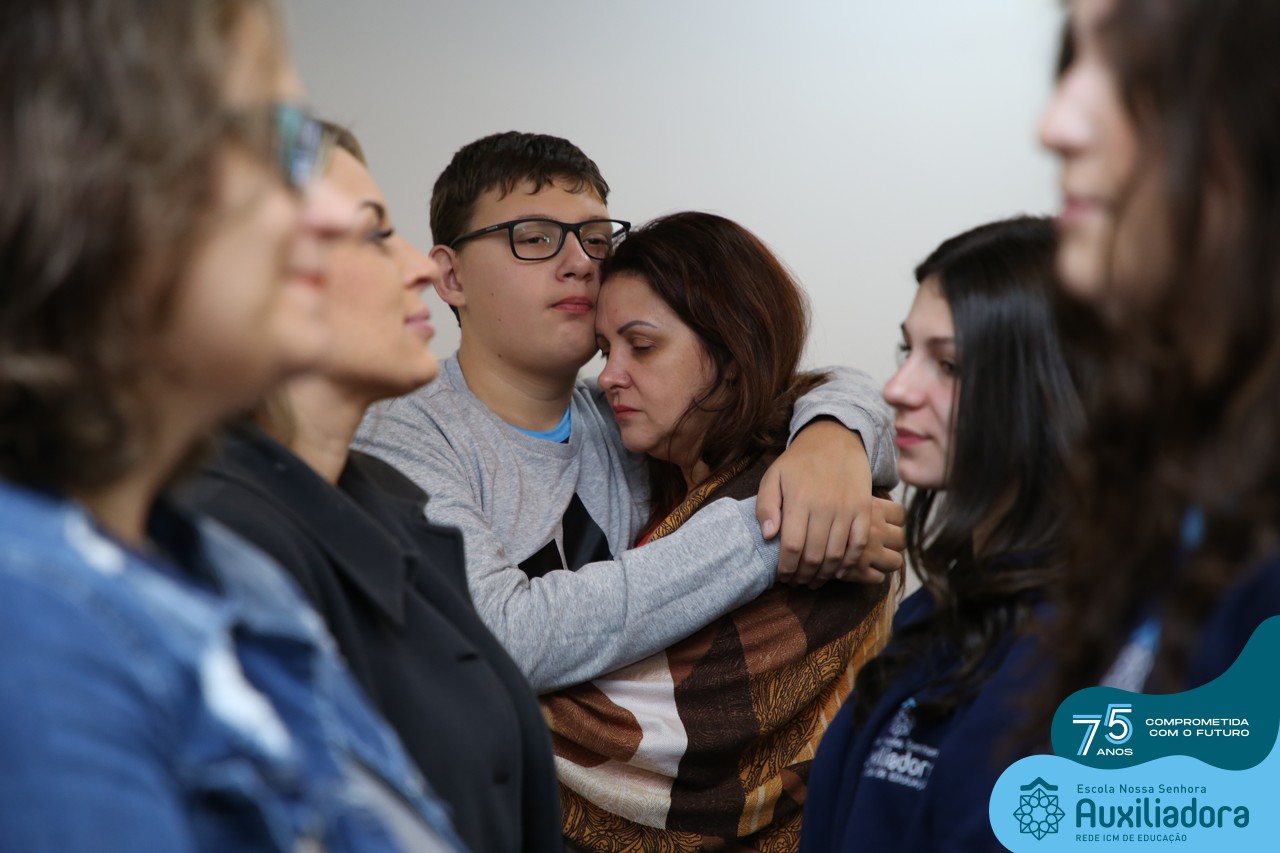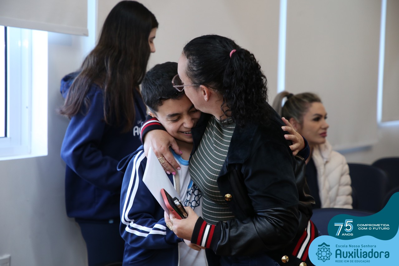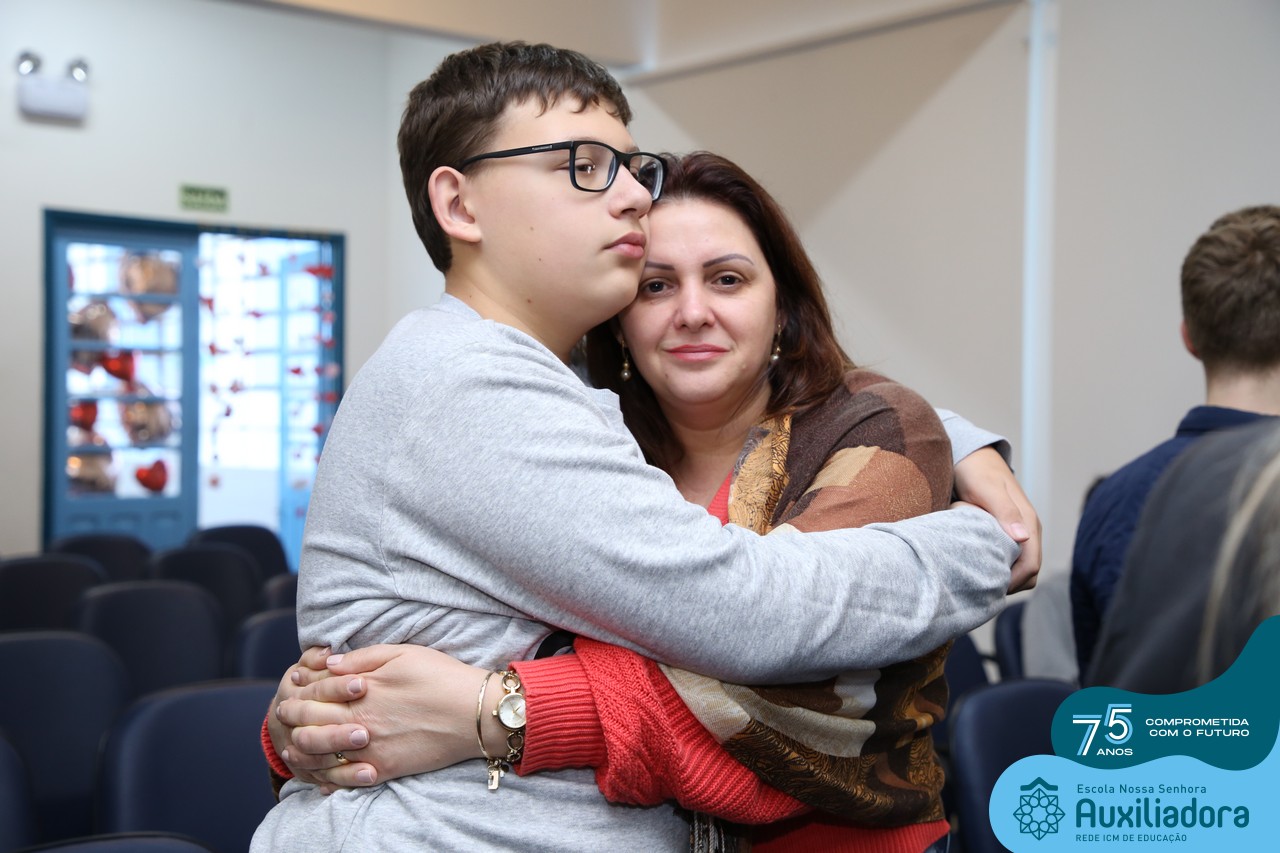 Mãe: palavra pequena, mas com um significado infinito, pois quer dizer amor, dedicação, renúncia a si própria, força e sabedoria. Ser mãe não é só dar à luz, e sim participar da vida dos seus frutos gerados ou criados. Os alunos do 8º82 receberam suas mães para homenageá-las através de uma bênção e de um cartão com suas fotos, trazendo boas lembranças e muito amor!