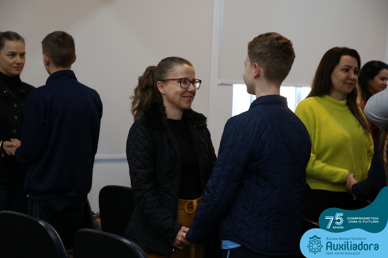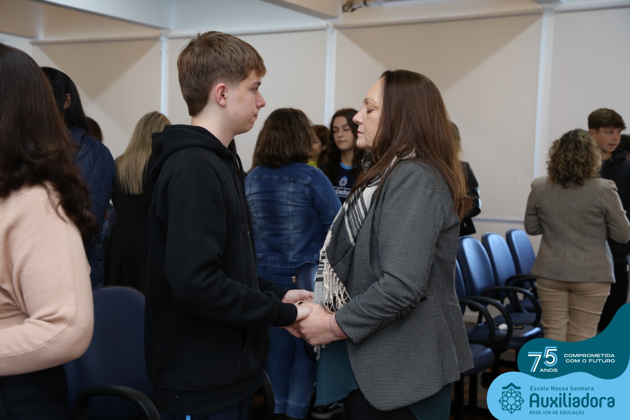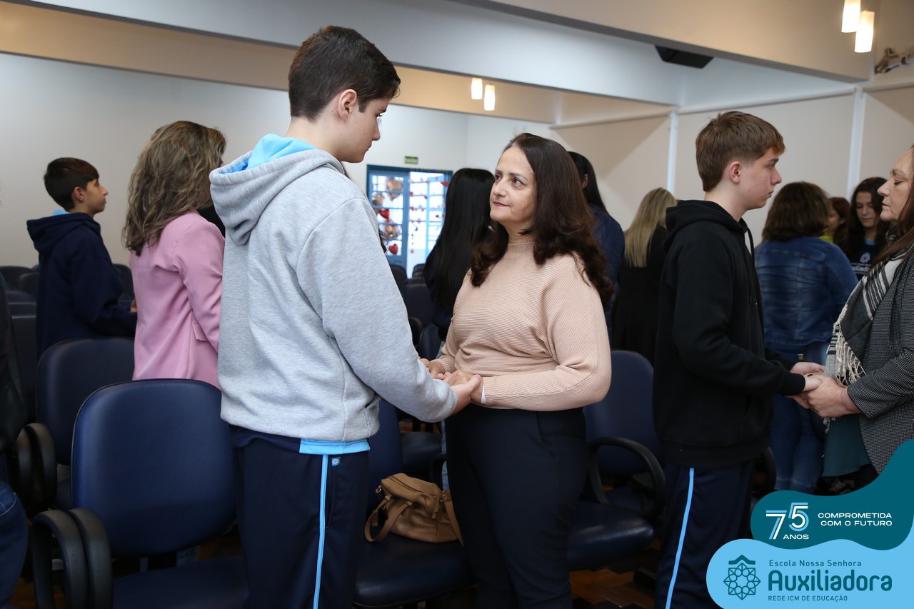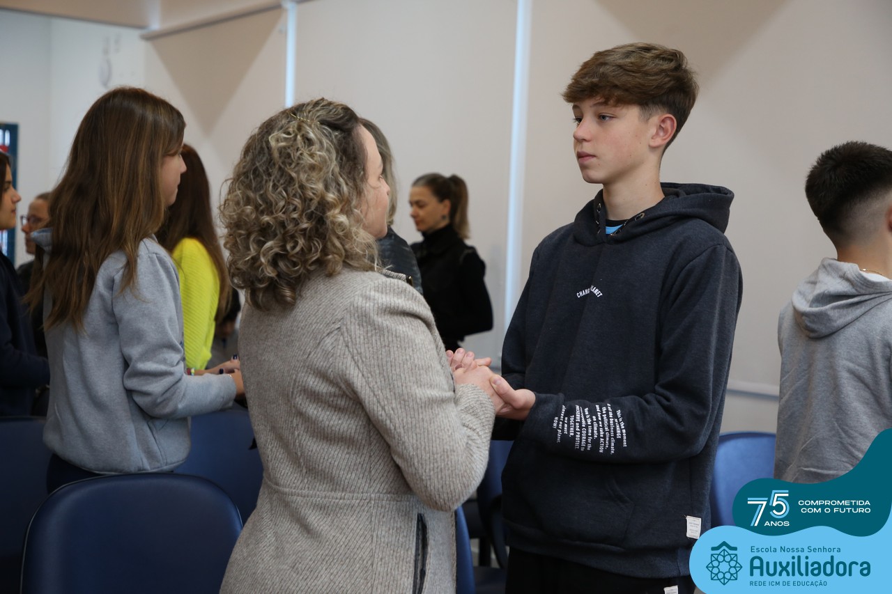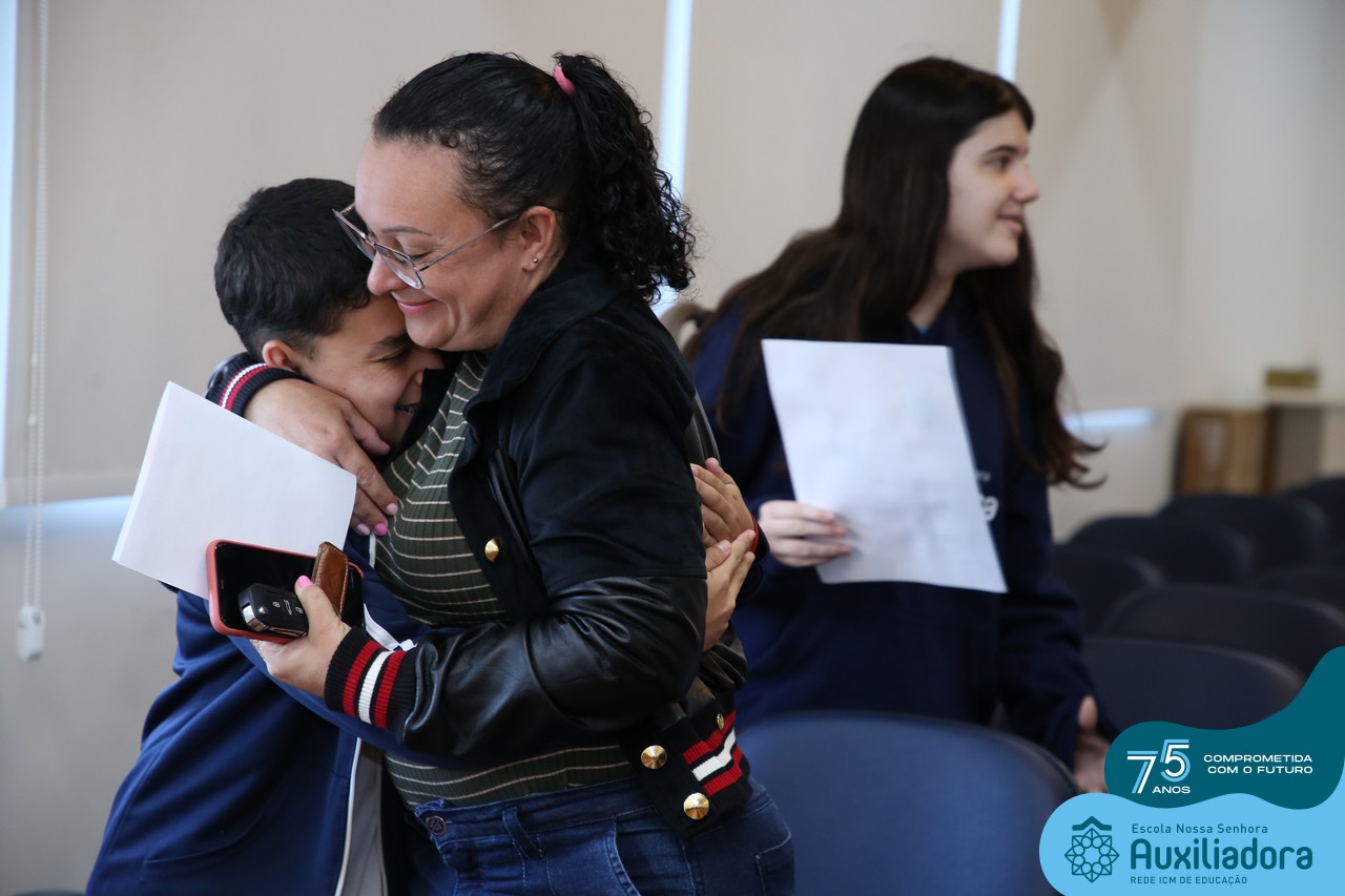 Mãe: palavra pequena, mas com um significado infinito, pois quer dizer amor, dedicação, renúncia a si própria, força e sabedoria. Ser mãe não é só dar à luz, e sim participar da vida dos seus frutos gerados ou criados. Os alunos do 8º82 receberam suas mães para homenageá-las através de uma bênção e de um cartão com suas fotos, trazendo boas lembranças e muito amor!