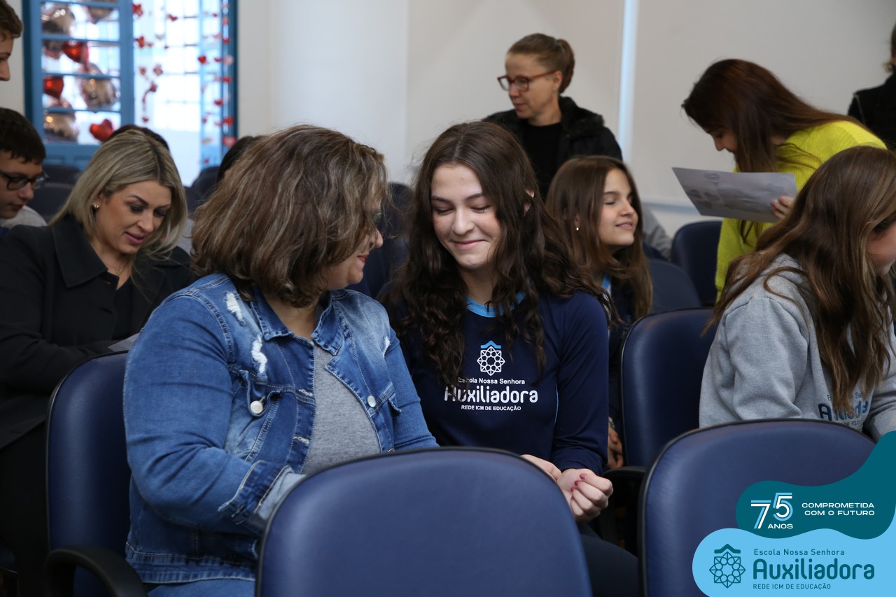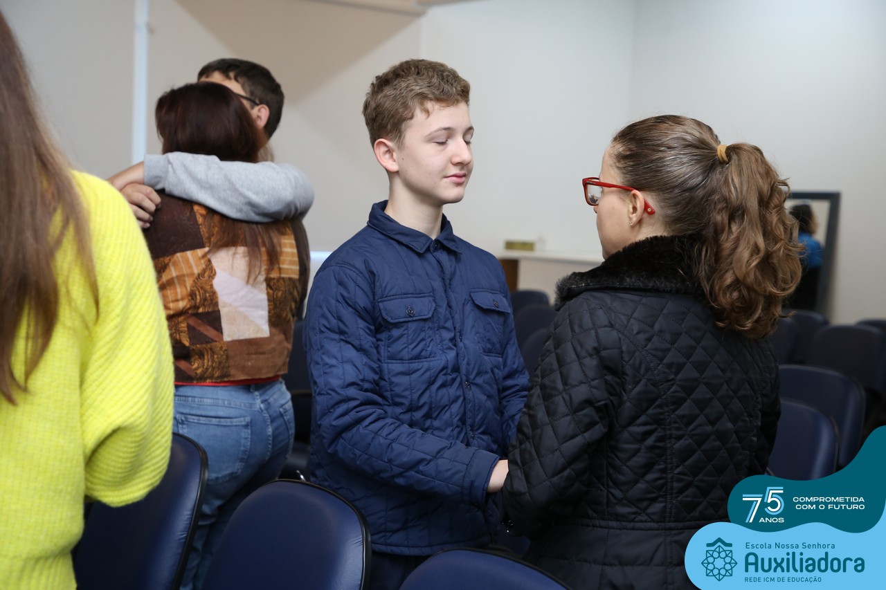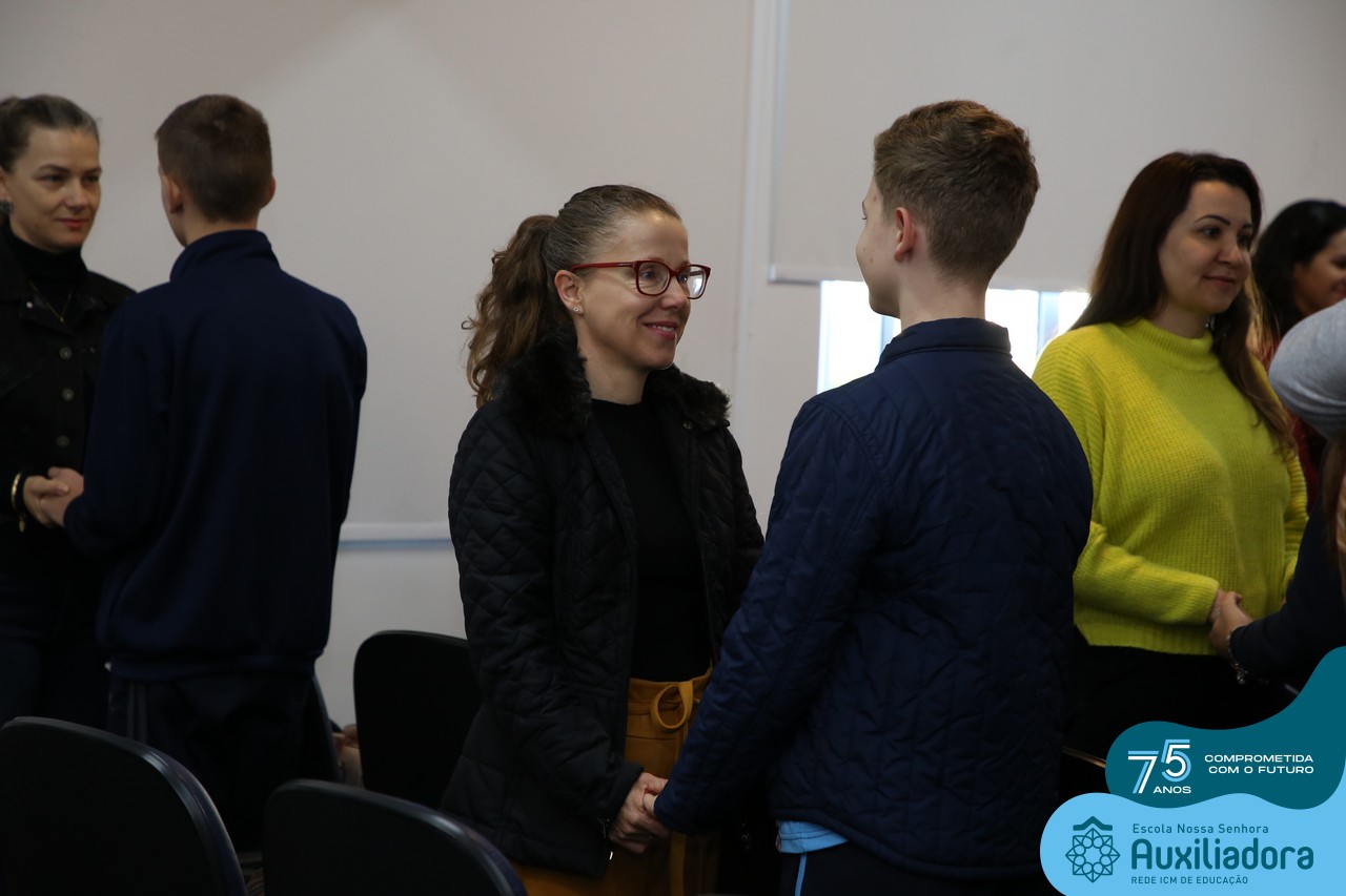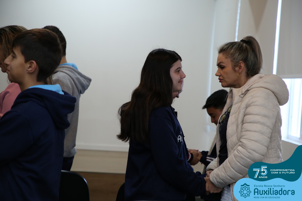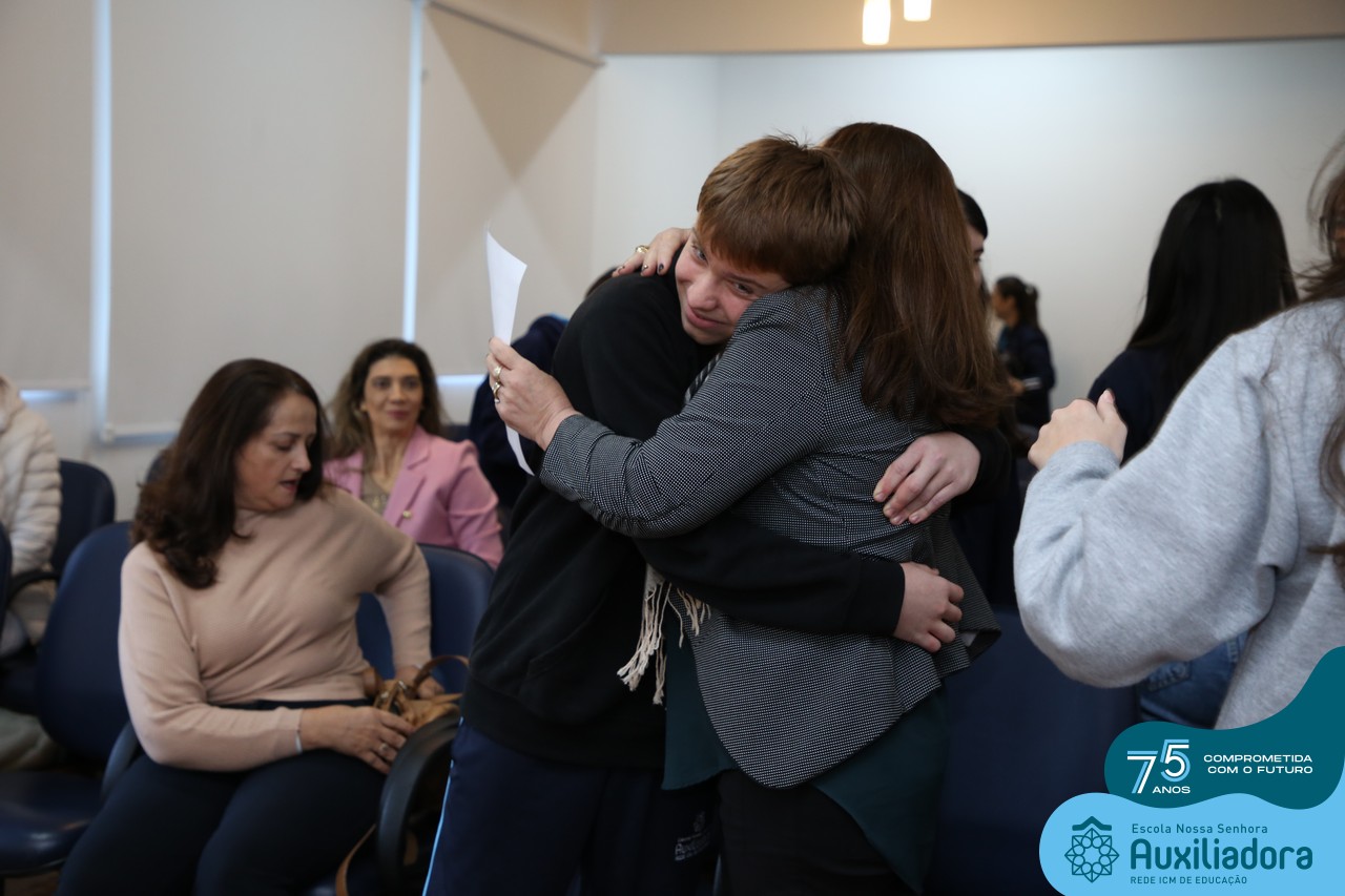 Mãe: palavra pequena, mas com um significado infinito, pois quer dizer amor, dedicação, renúncia a si própria, força e sabedoria. Ser mãe não é só dar à luz, e sim participar da vida dos seus frutos gerados ou criados. Os alunos do 8º82 receberam suas mães para homenageá-las através de uma bênção e de um cartão com suas fotos, trazendo boas lembranças e muito amor!
