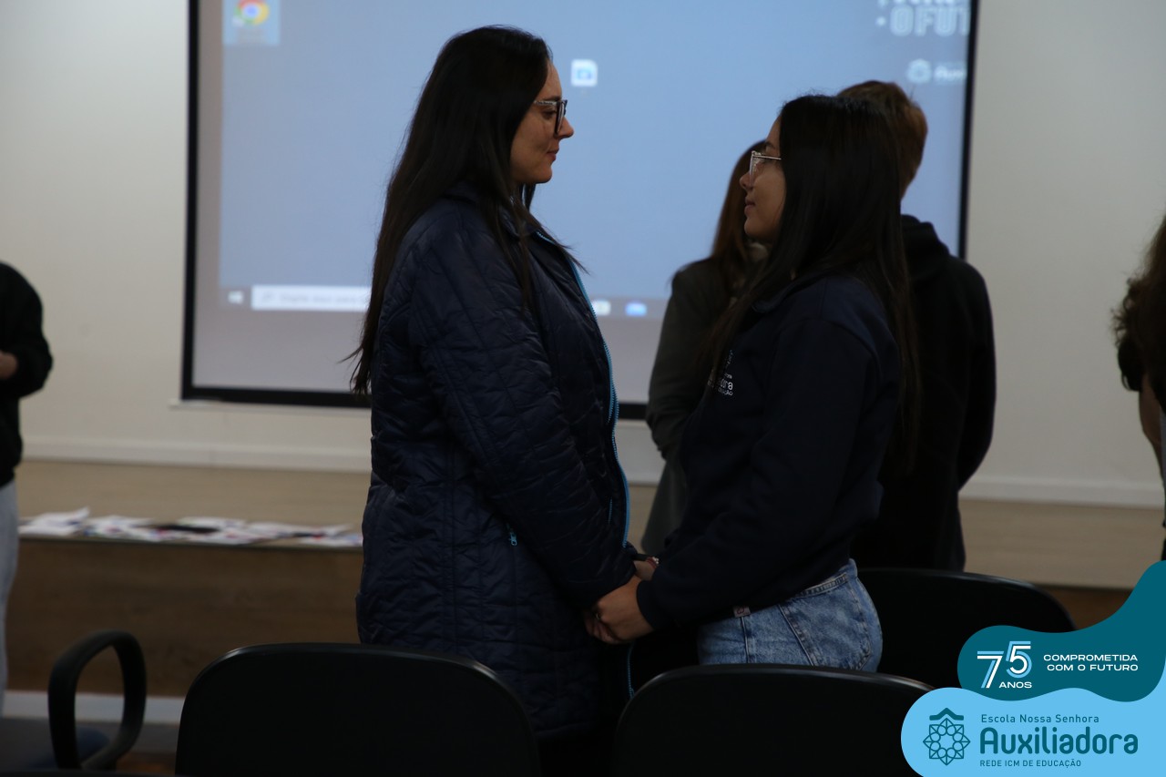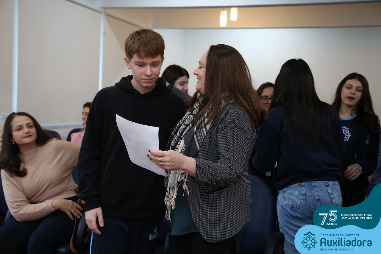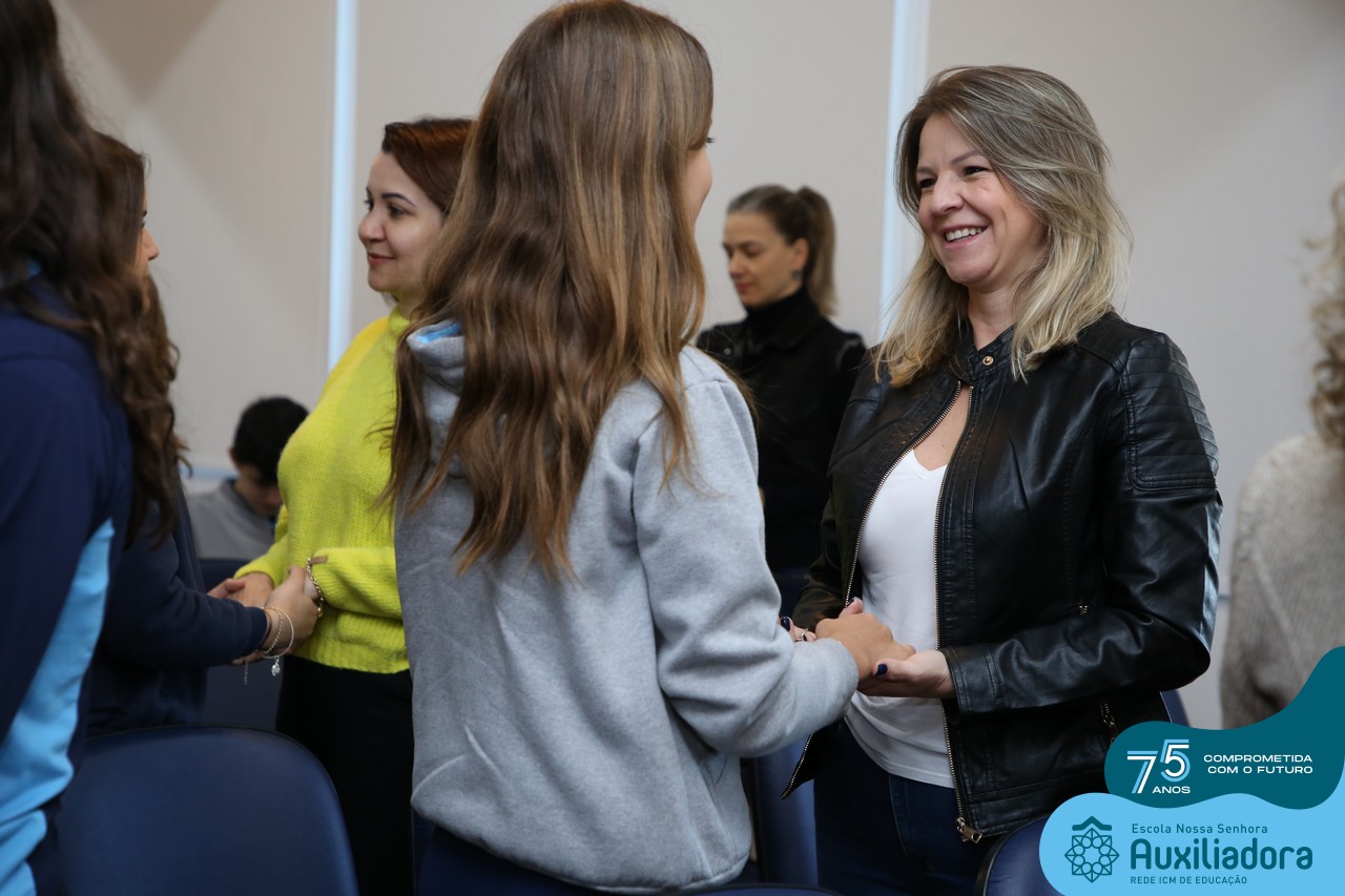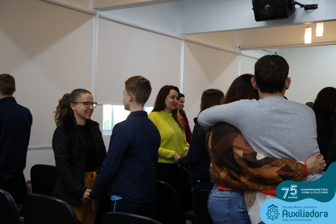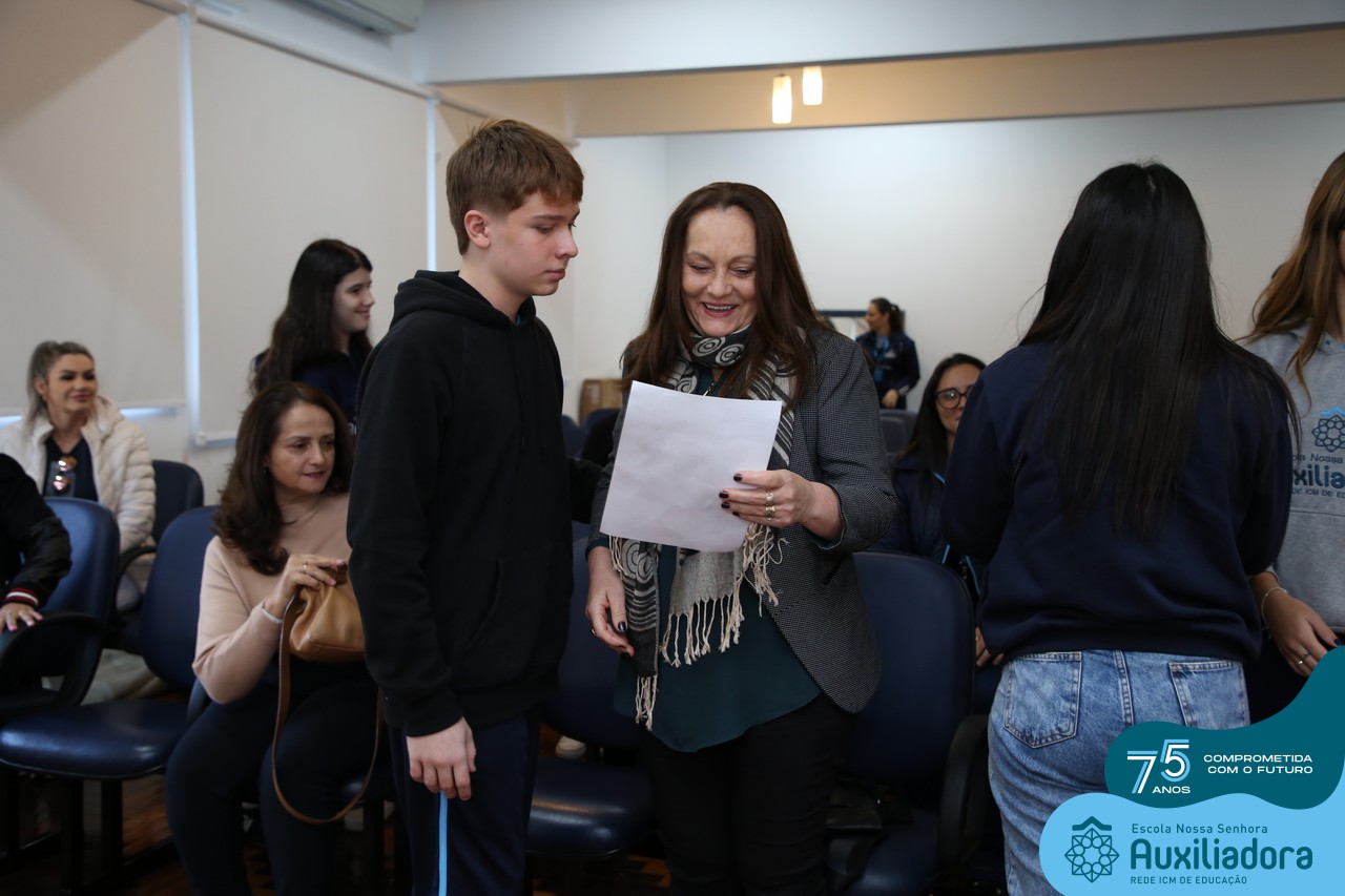 Mãe: palavra pequena, mas com um significado infinito, pois quer dizer amor, dedicação, renúncia a si própria, força e sabedoria. Ser mãe não é só dar à luz, e sim participar da vida dos seus frutos gerados ou criados. Os alunos do 8º82 receberam suas mães para homenageá-las através de uma bênção e de um cartão com suas fotos, trazendo boas lembranças e muito amor!