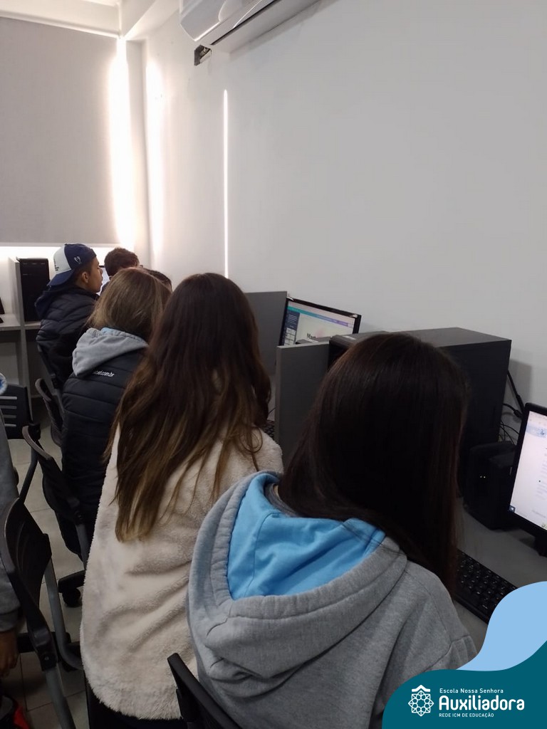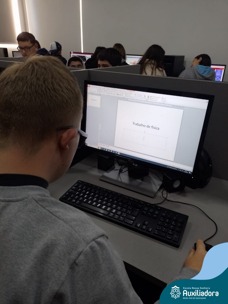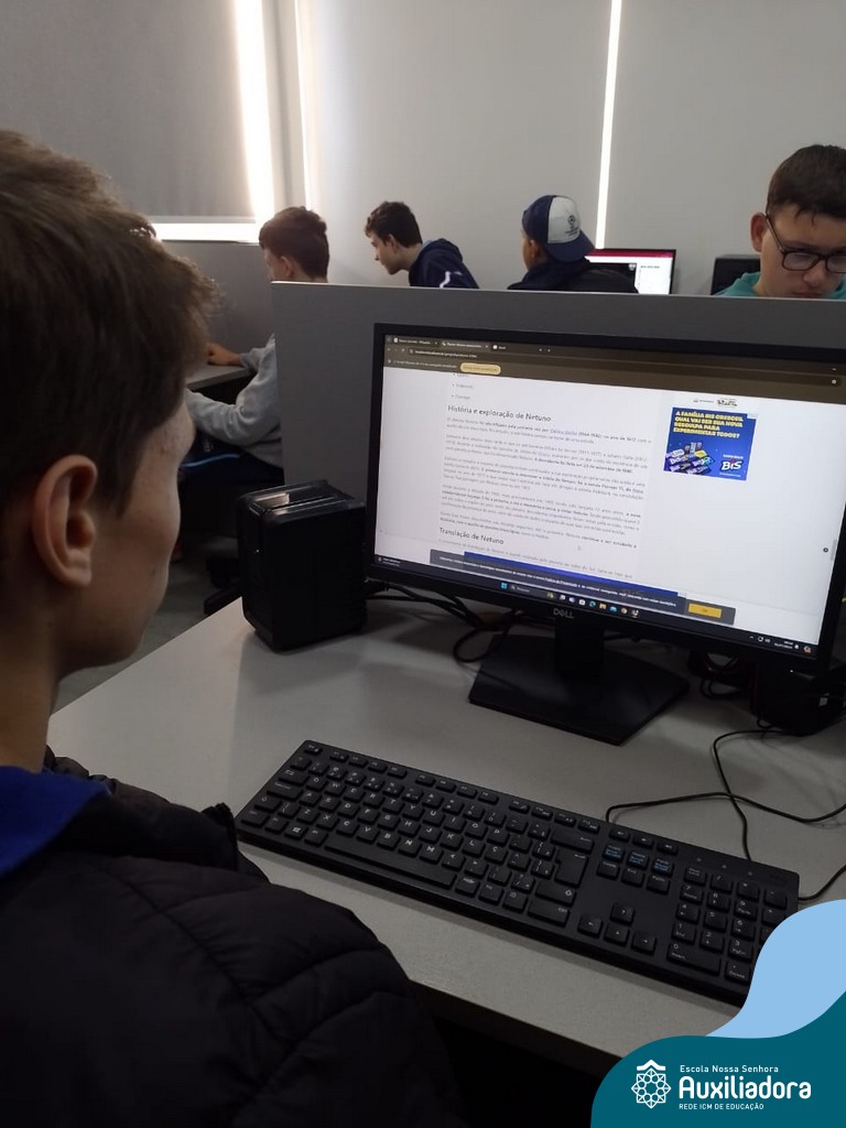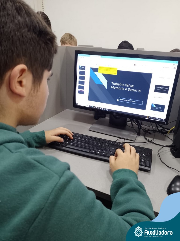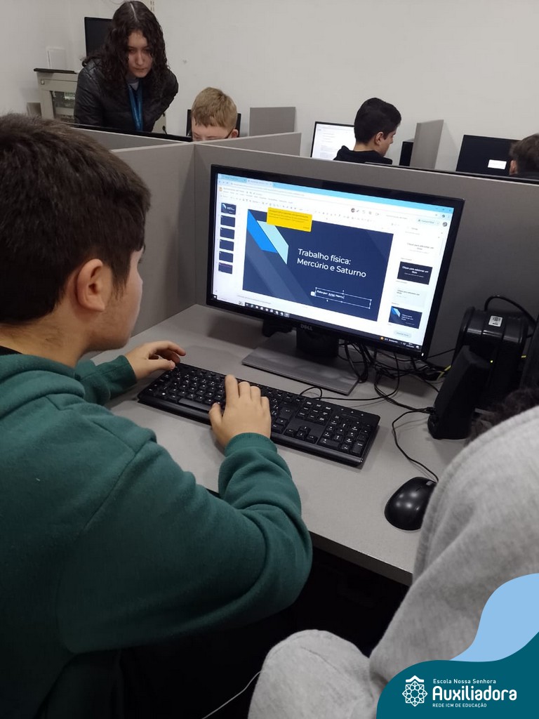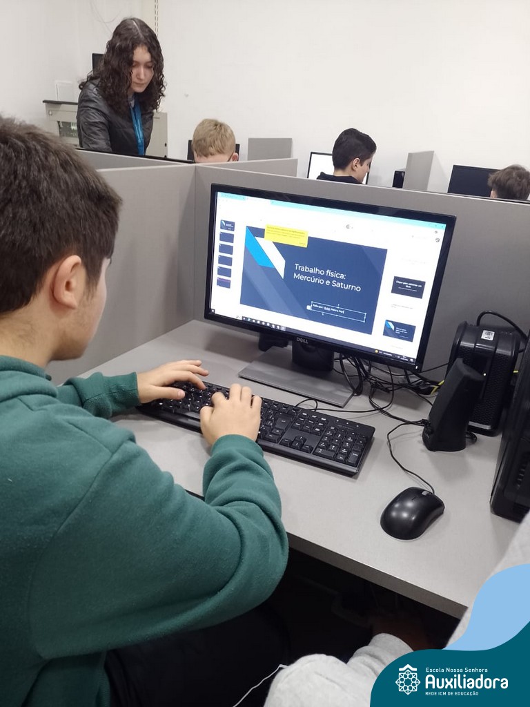 A turma do 9° ano teve a oportunidade de utilizar o laboratório de informática para realizar um trabalho de Física a respeito dos planetas, sob a orientação do professor Mateus Azevedo. Durante a atividade, os alunos puderam explorar recursos tecnológicos para aprofundar seus conhecimentos na disciplina, unindo teoria e prática em um ambiente de aprendizagem dinâmico e interativo.