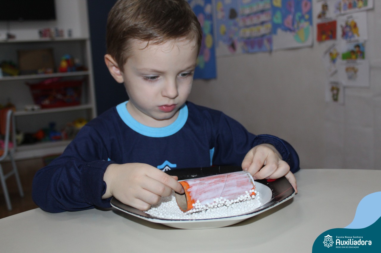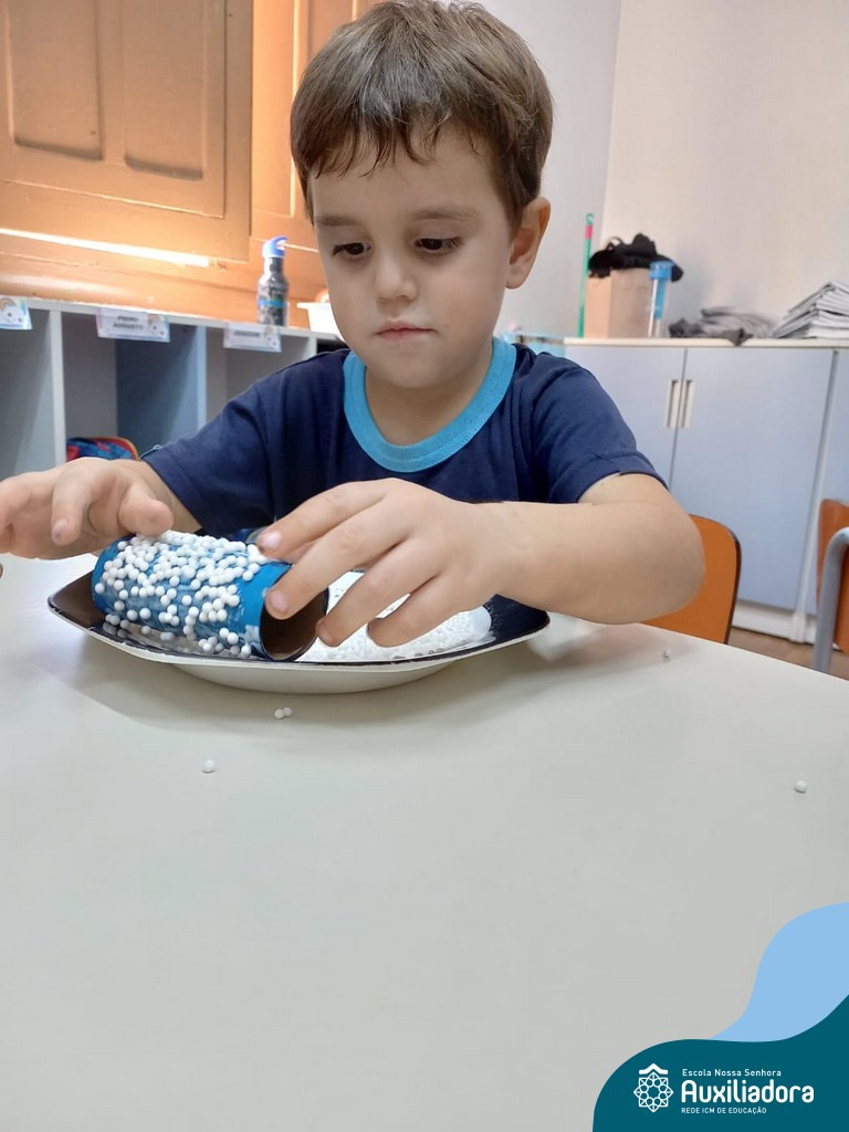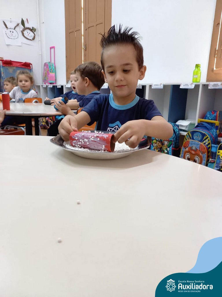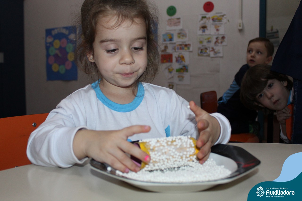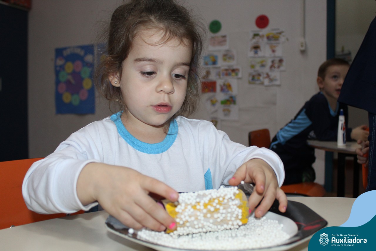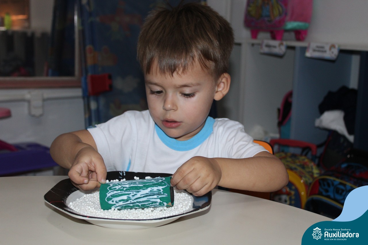 O Maternal 2 C, em registro a história “Maria vai com as outras”, construiu suas “Marias”. Essa atividade foi desenvolvida com o intuito de trabalhar a concentração, motricidade fina e o sensorial das crianças, que se divertiram muito com a colagem das bolinhas de sagu.