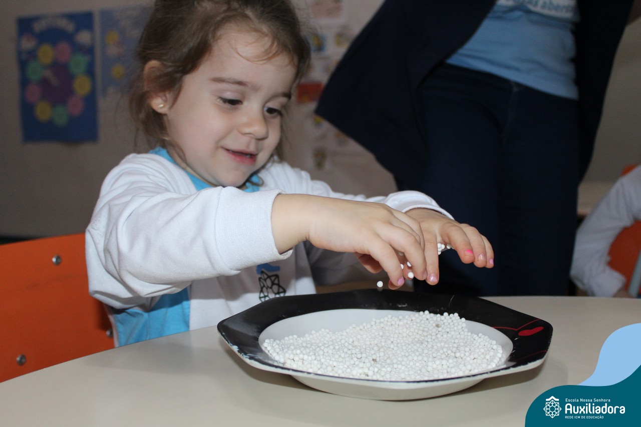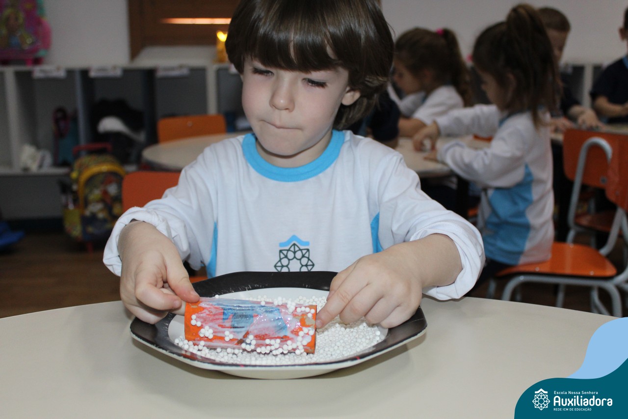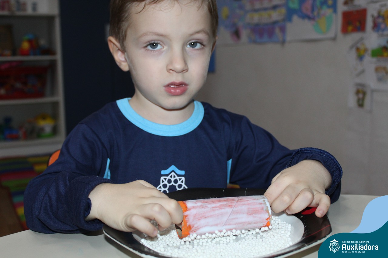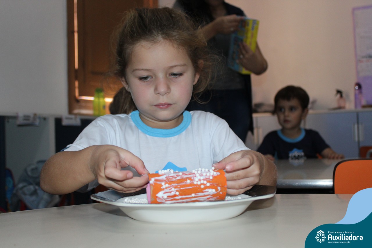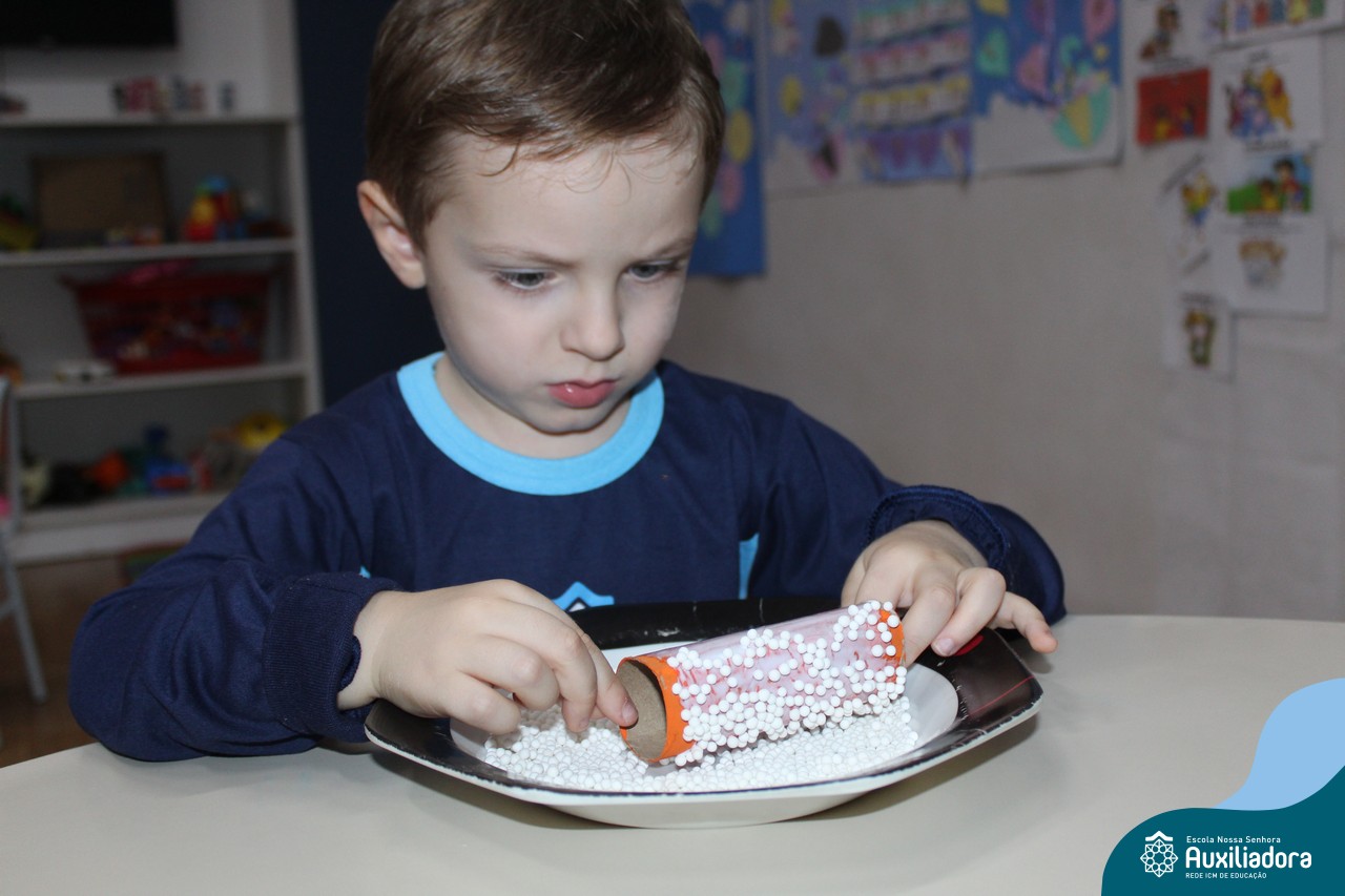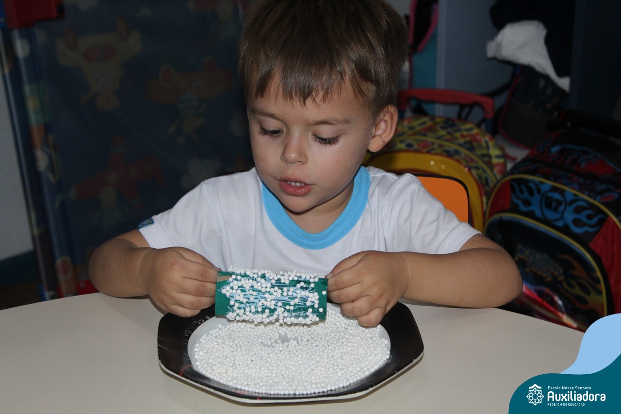 O Maternal 2 C, em registro a história “Maria vai com as outras”, construiu suas “Marias”. Essa atividade foi desenvolvida com o intuito de trabalhar a concentração, motricidade fina e o sensorial das crianças, que se divertiram muito com a colagem das bolinhas de sagu.