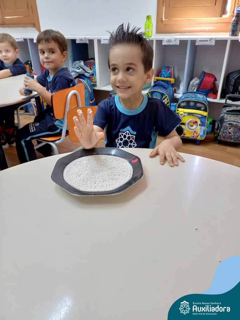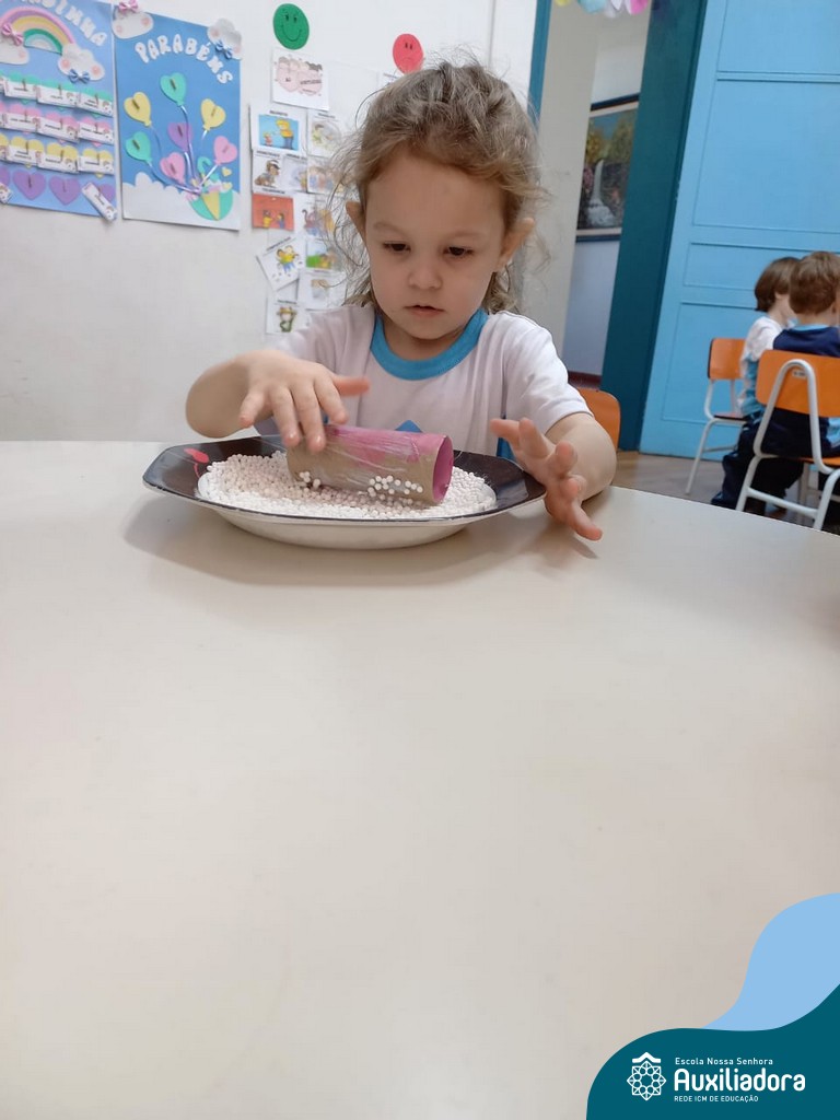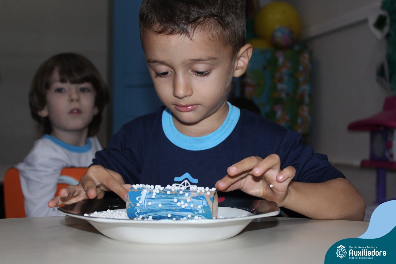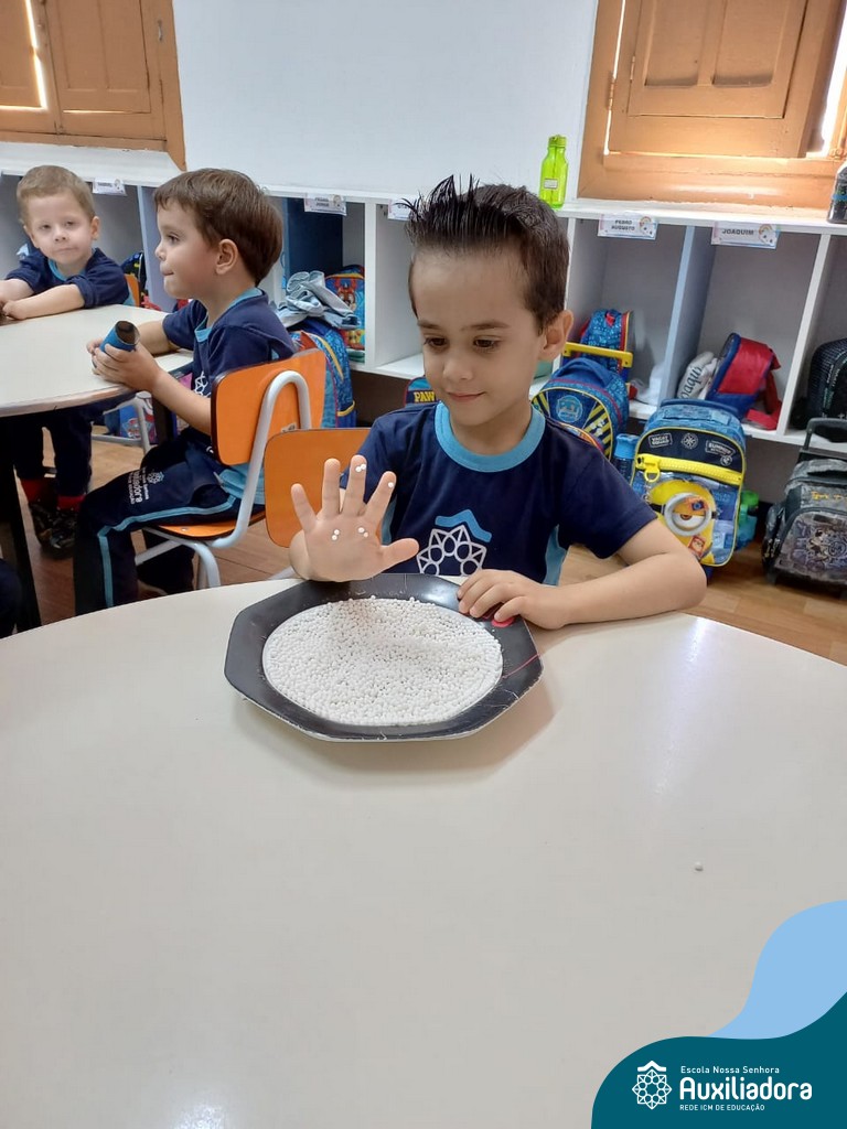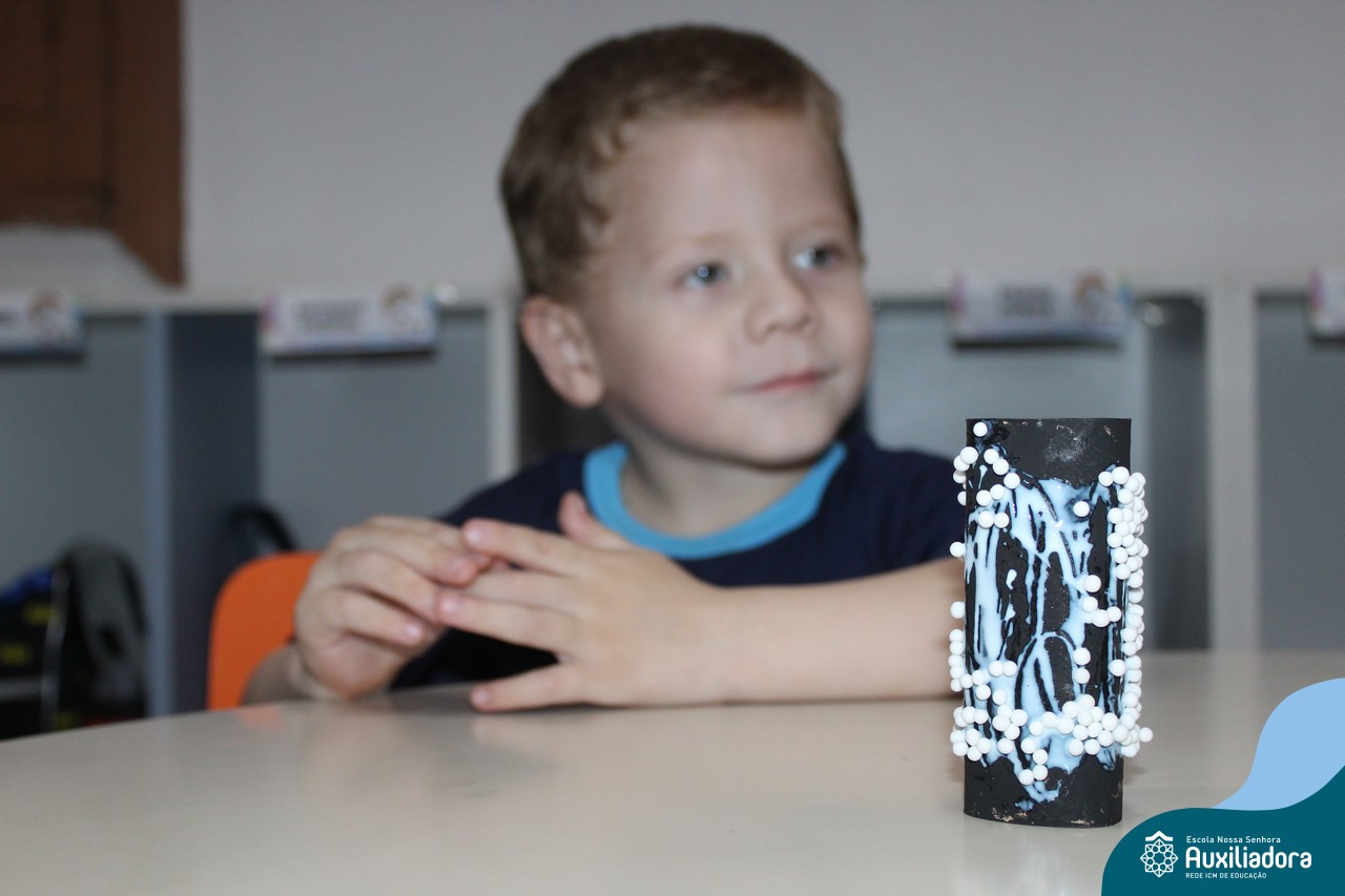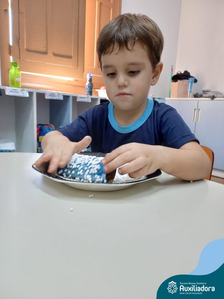 O Maternal 2 C, em registro a história “Maria vai com as outras”, construiu suas “Marias”. Essa atividade foi desenvolvida com o intuito de trabalhar a concentração, motricidade fina e o sensorial das crianças, que se divertiram muito com a colagem das bolinhas de sagu.