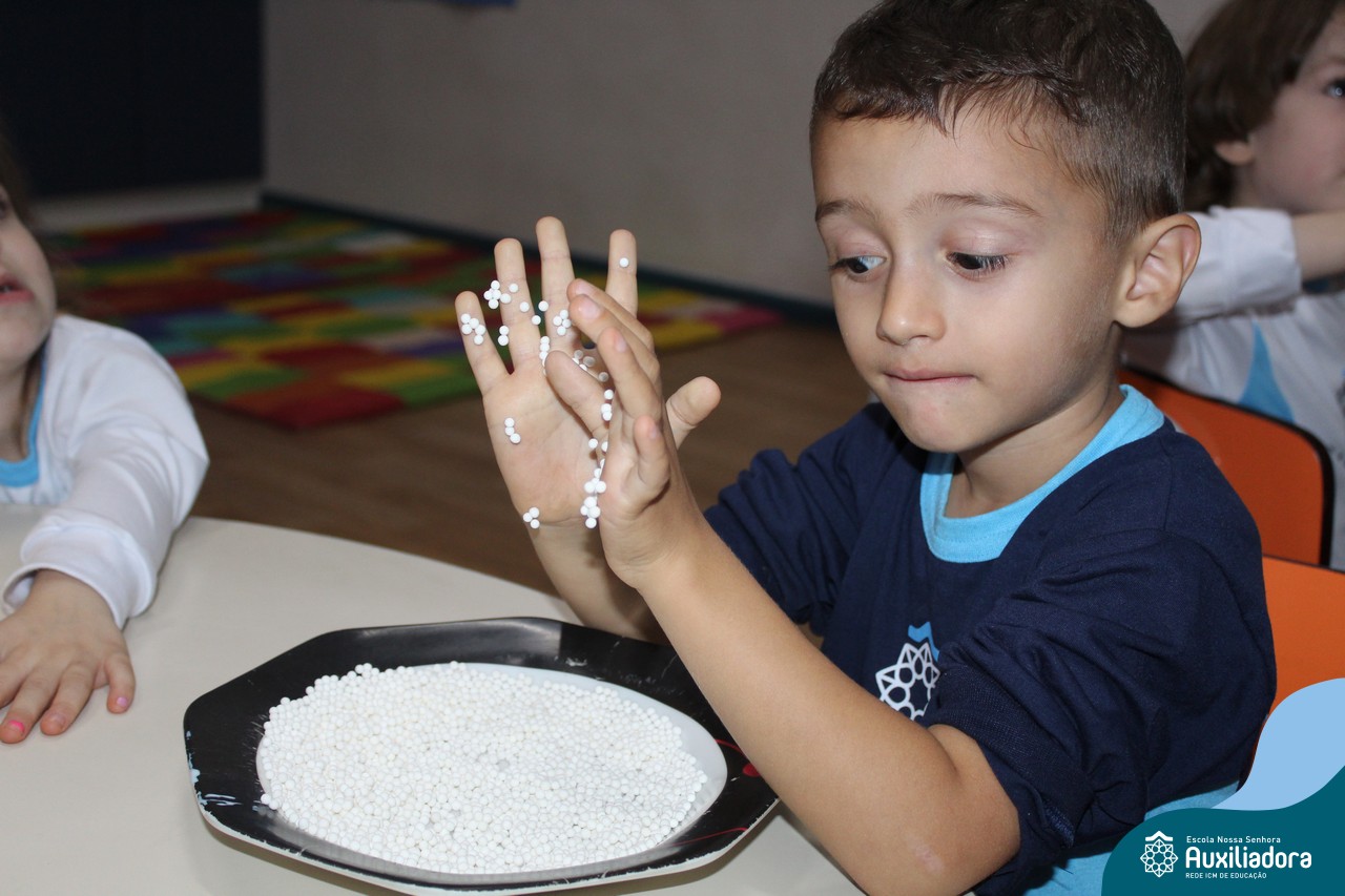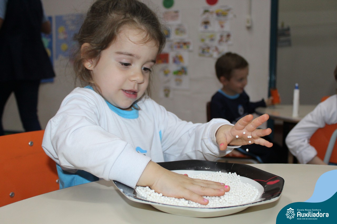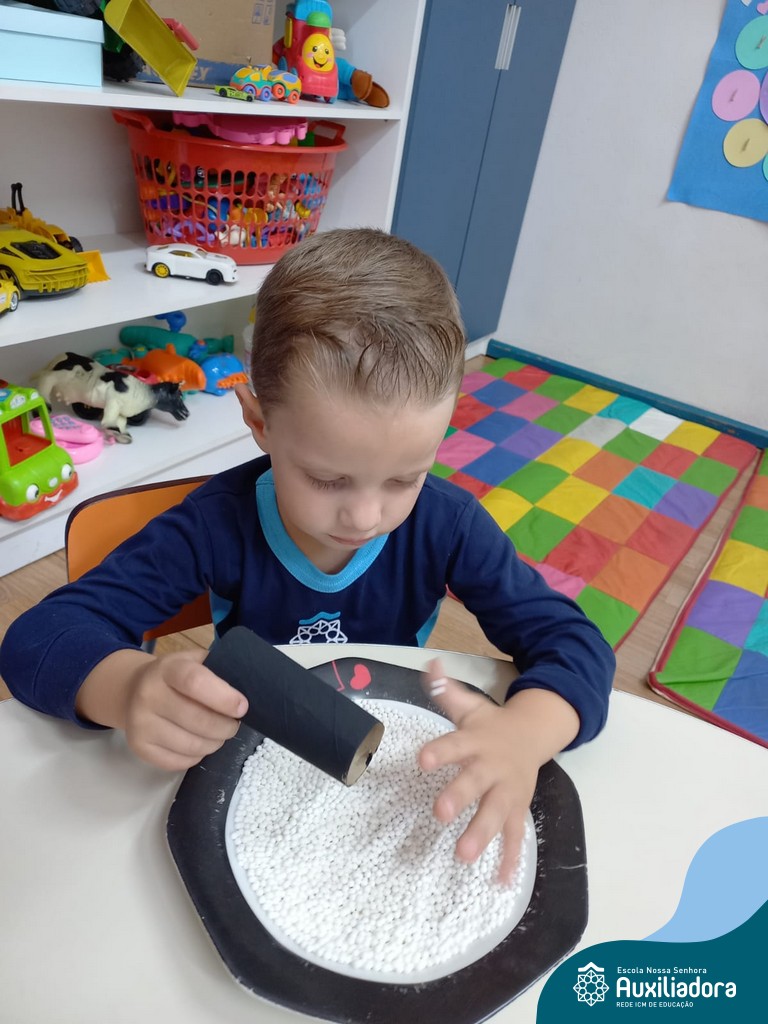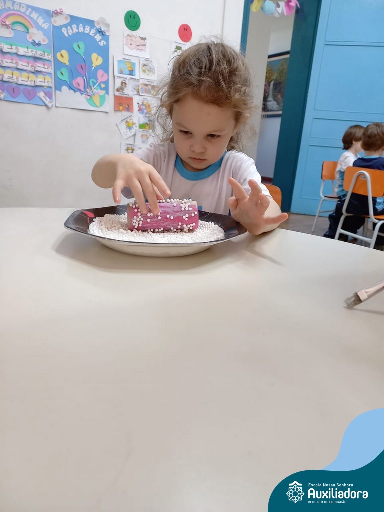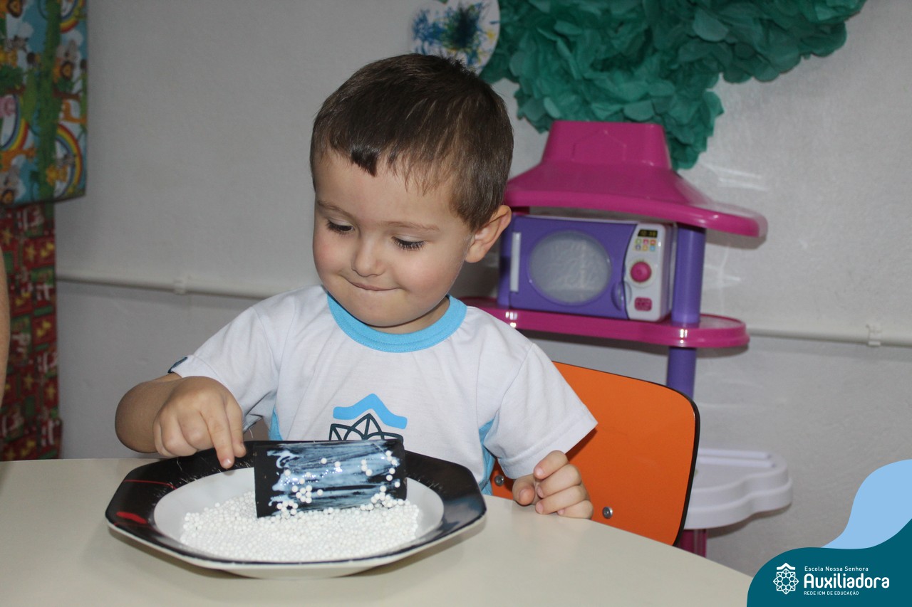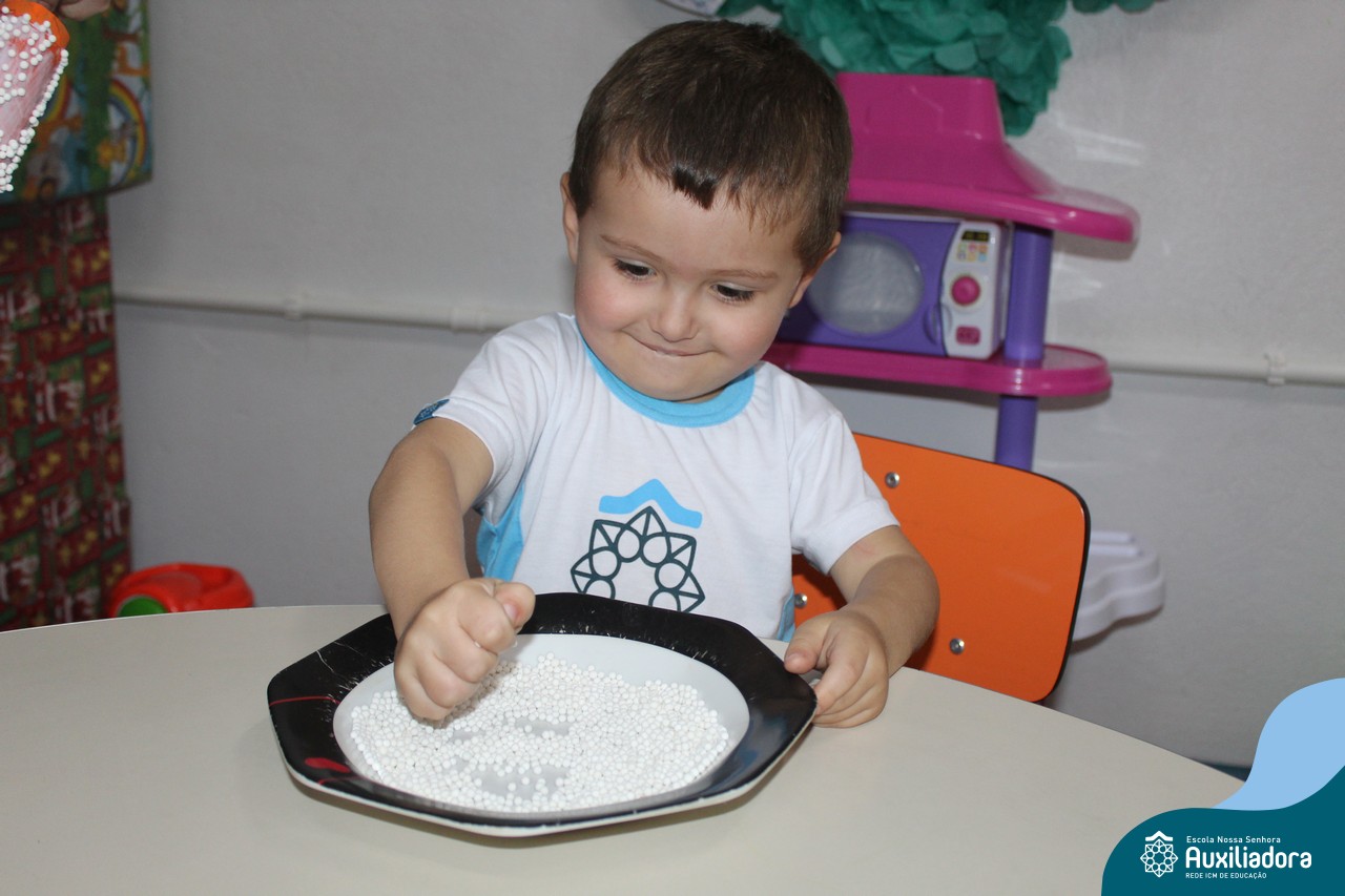 O Maternal 2 C, em registro a história “Maria vai com as outras”, construiu suas “Marias”. Essa atividade foi desenvolvida com o intuito de trabalhar a concentração, motricidade fina e o sensorial das crianças, que se divertiram muito com a colagem das bolinhas de sagu.