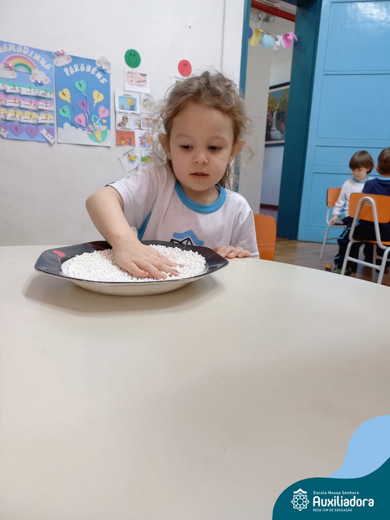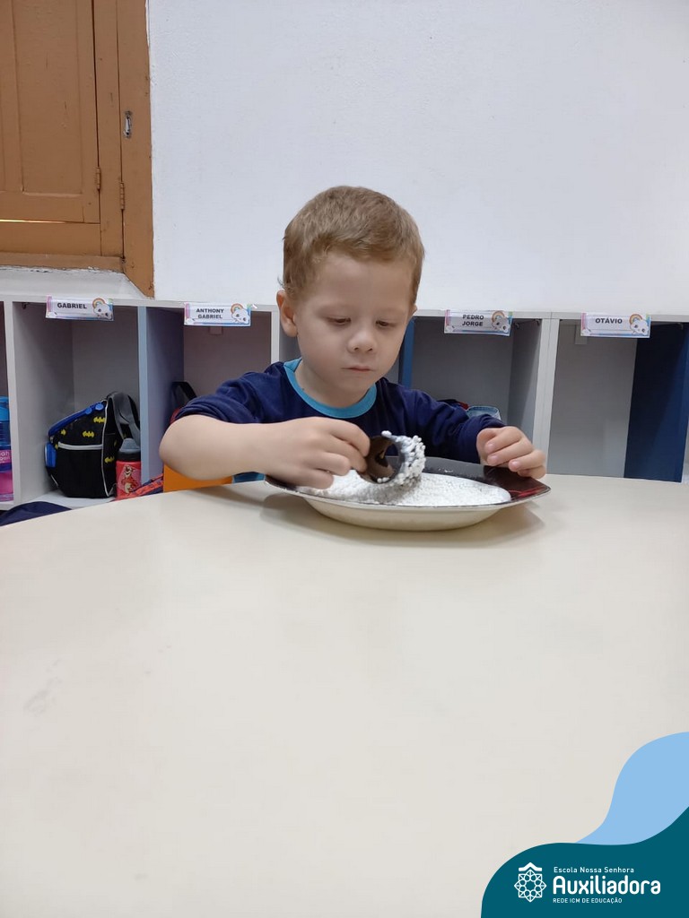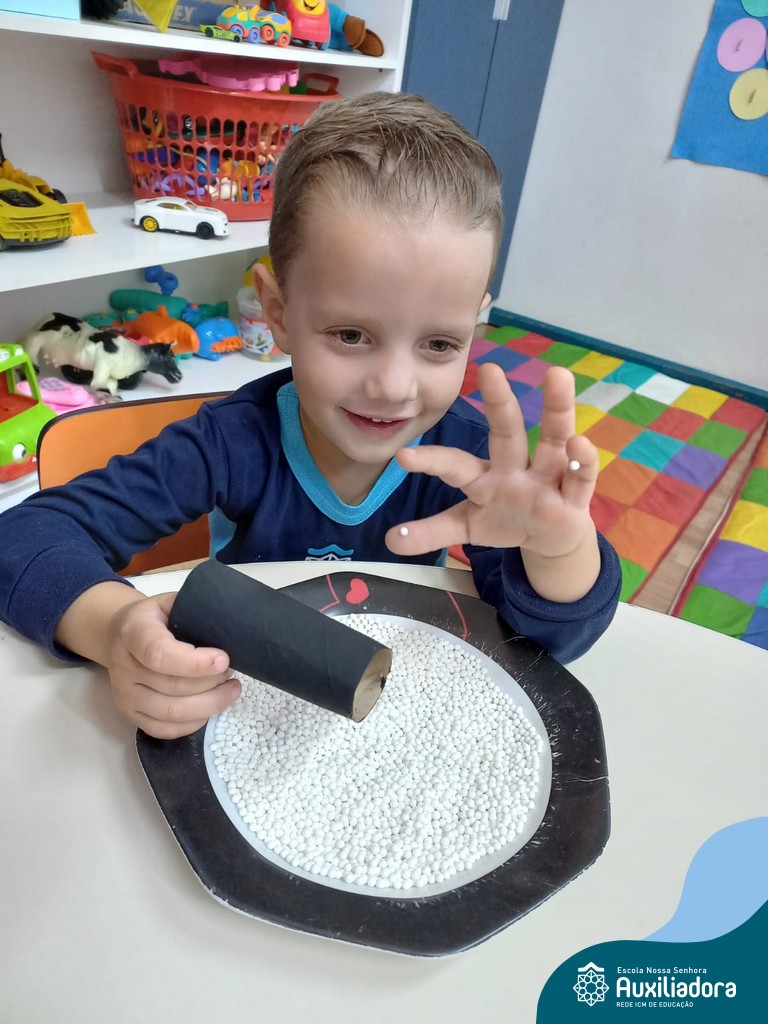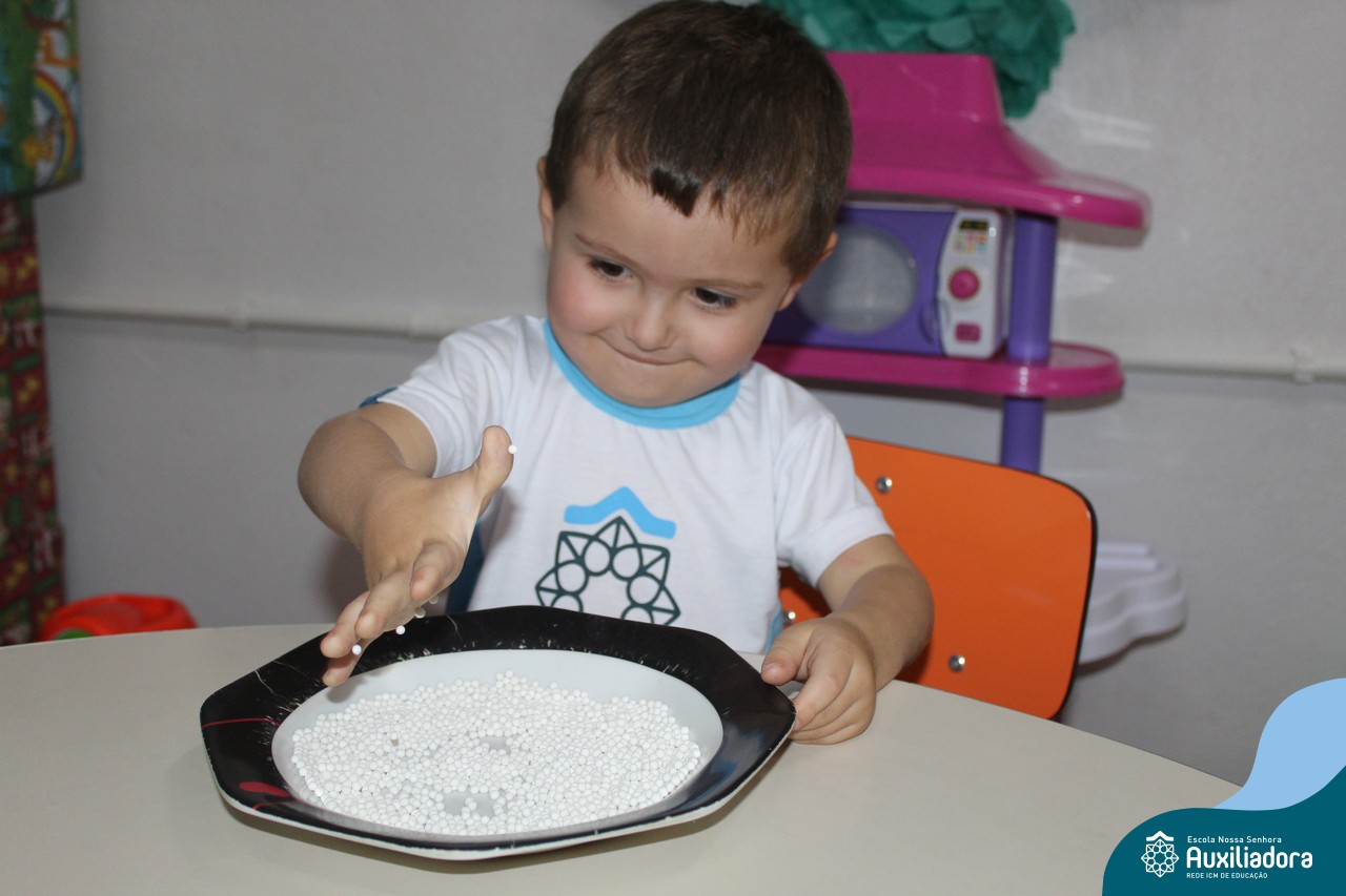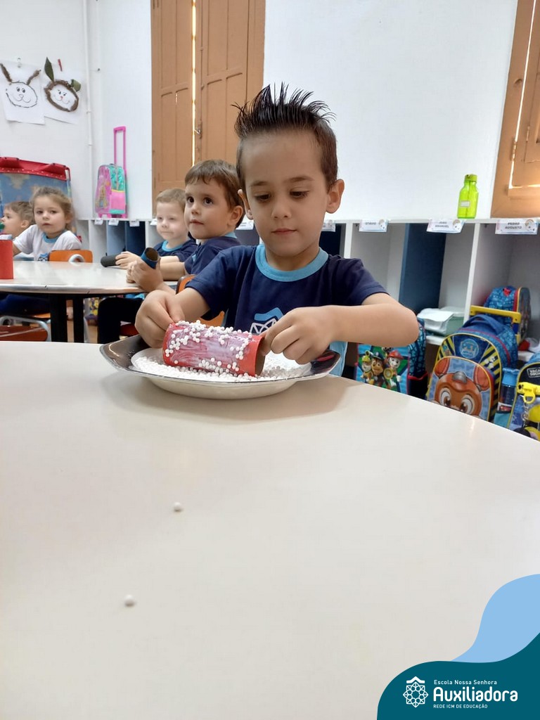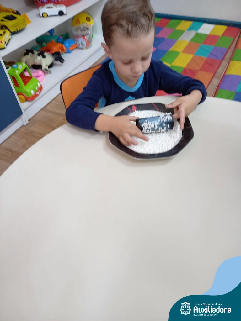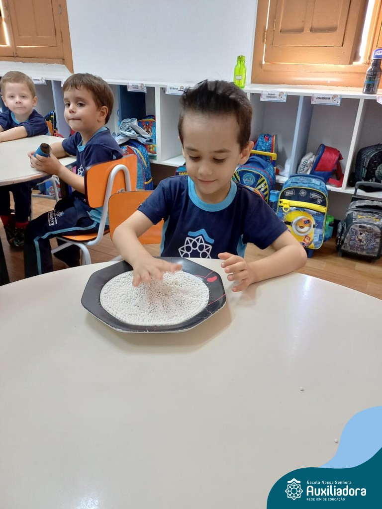 O Maternal 2 C, em registro a história “Maria vai com as outras”, construiu suas “Marias”. Essa atividade foi desenvolvida com o intuito de trabalhar a concentração, motricidade fina e o sensorial das crianças, que se divertiram muito com a colagem das bolinhas de sagu.