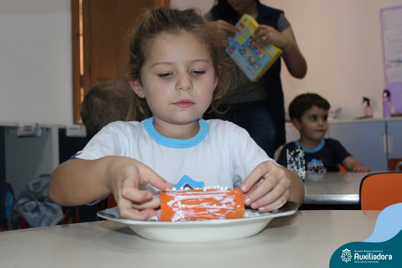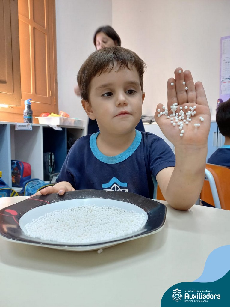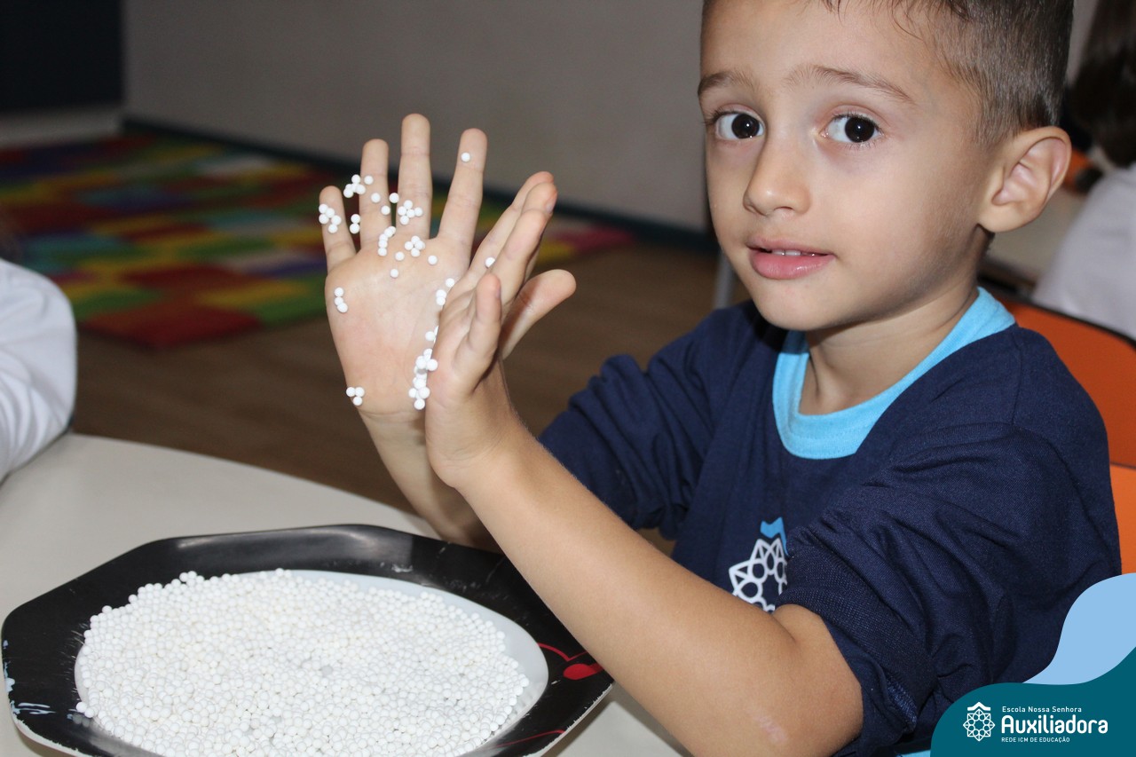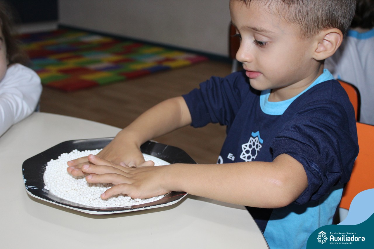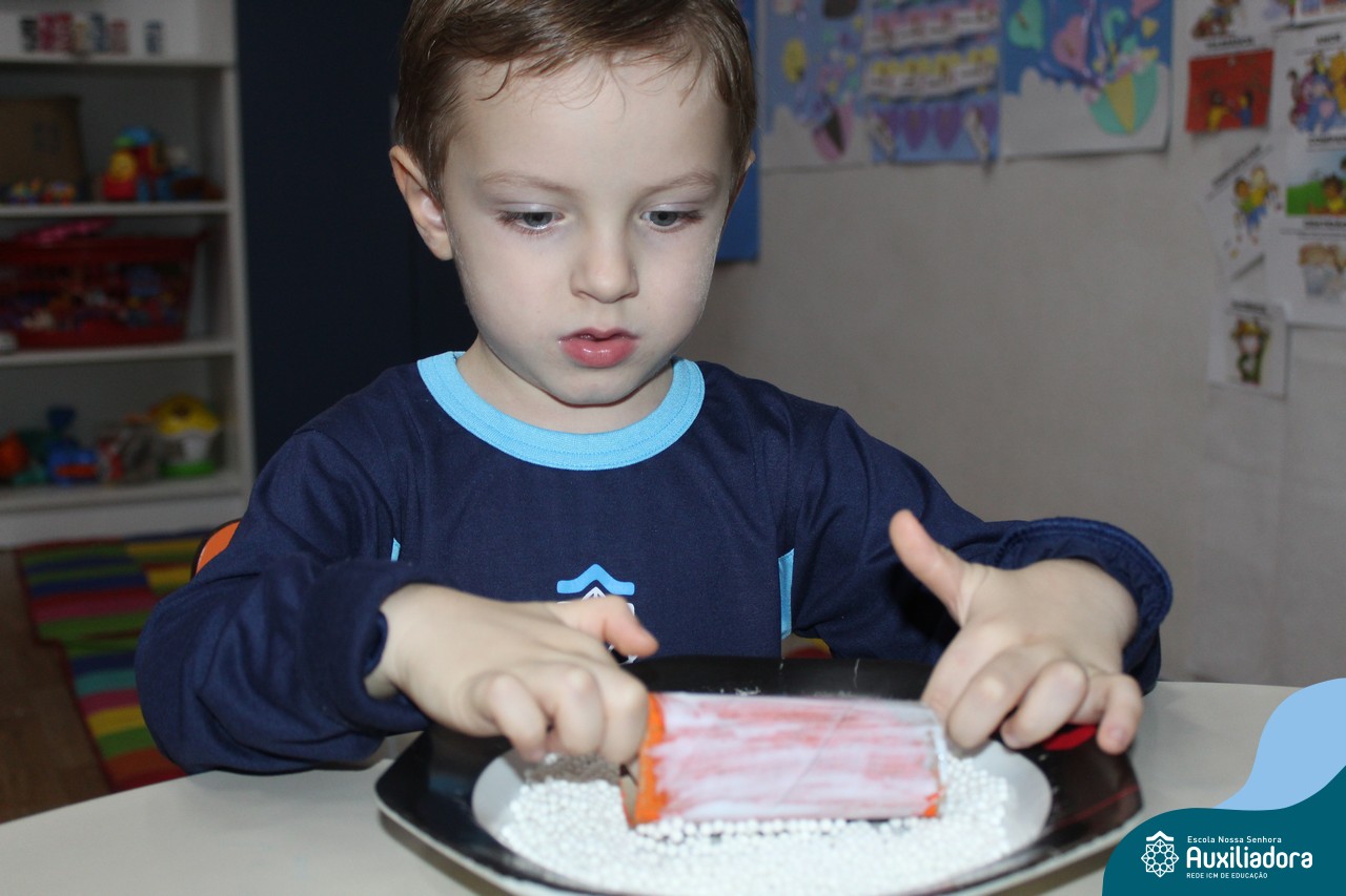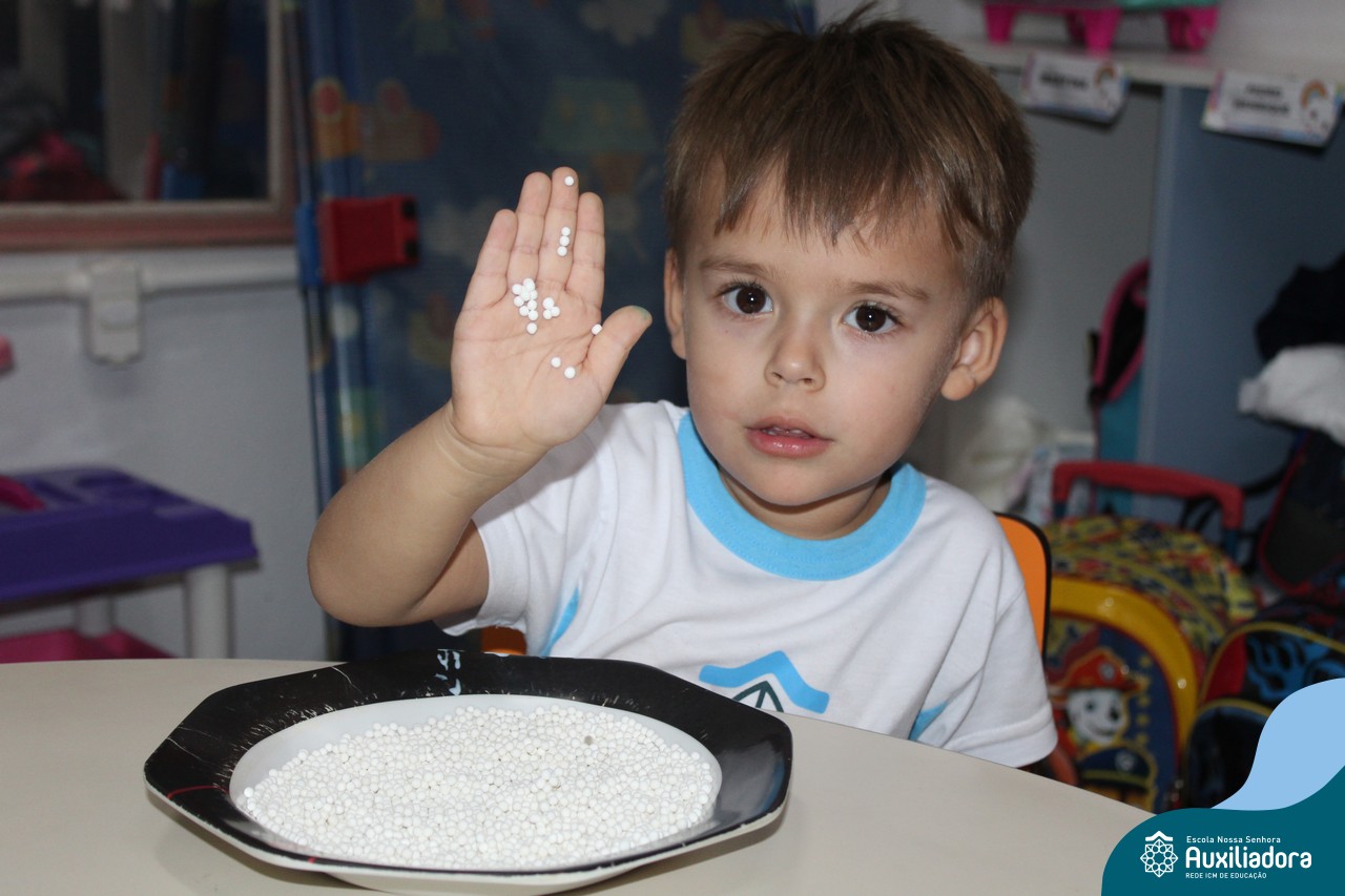 O Maternal 2 C, em registro a história “Maria vai com as outras”, construiu suas “Marias”. Essa atividade foi desenvolvida com o intuito de trabalhar a concentração, motricidade fina e o sensorial das crianças, que se divertiram muito com a colagem das bolinhas de sagu.