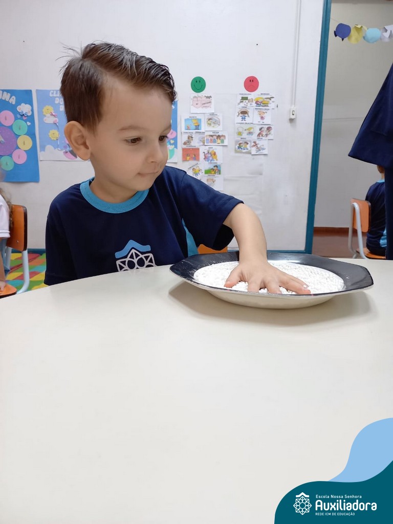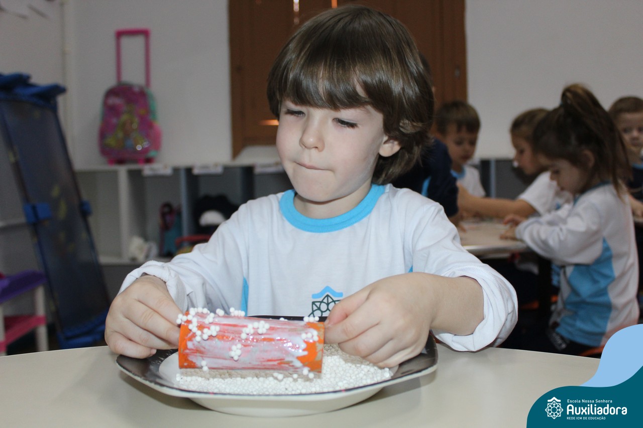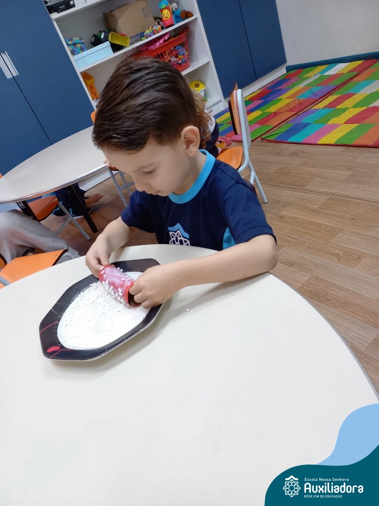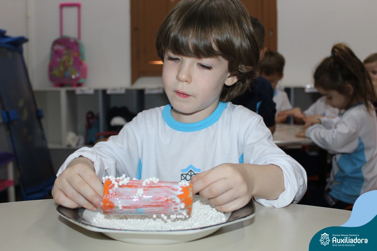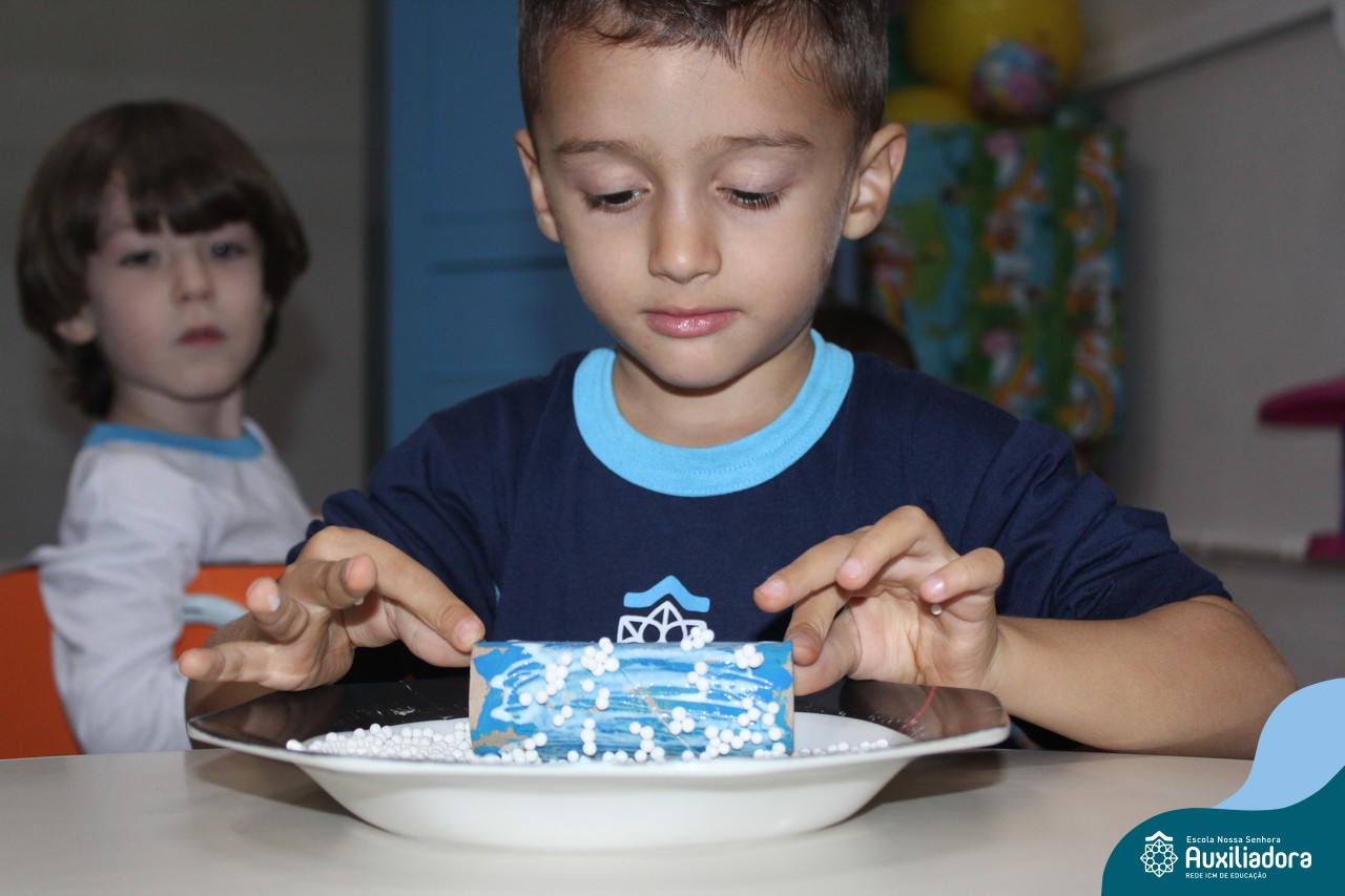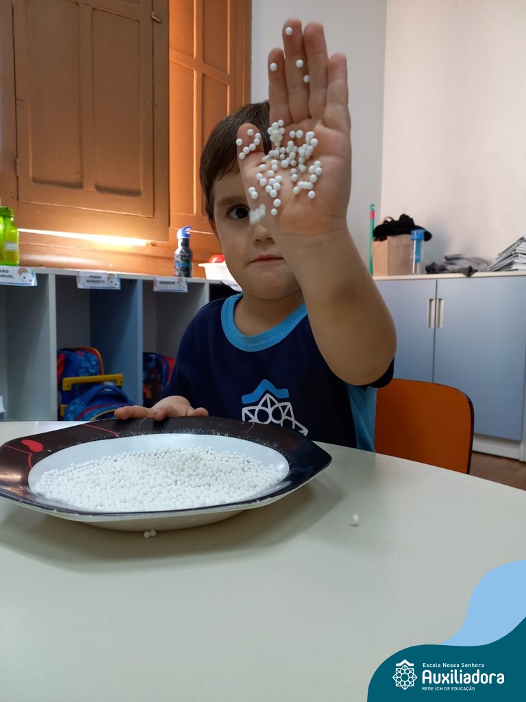 O Maternal 2 C, em registro a história “Maria vai com as outras”, construiu suas “Marias”. Essa atividade foi desenvolvida com o intuito de trabalhar a concentração, motricidade fina e o sensorial das crianças, que se divertiram muito com a colagem das bolinhas de sagu.