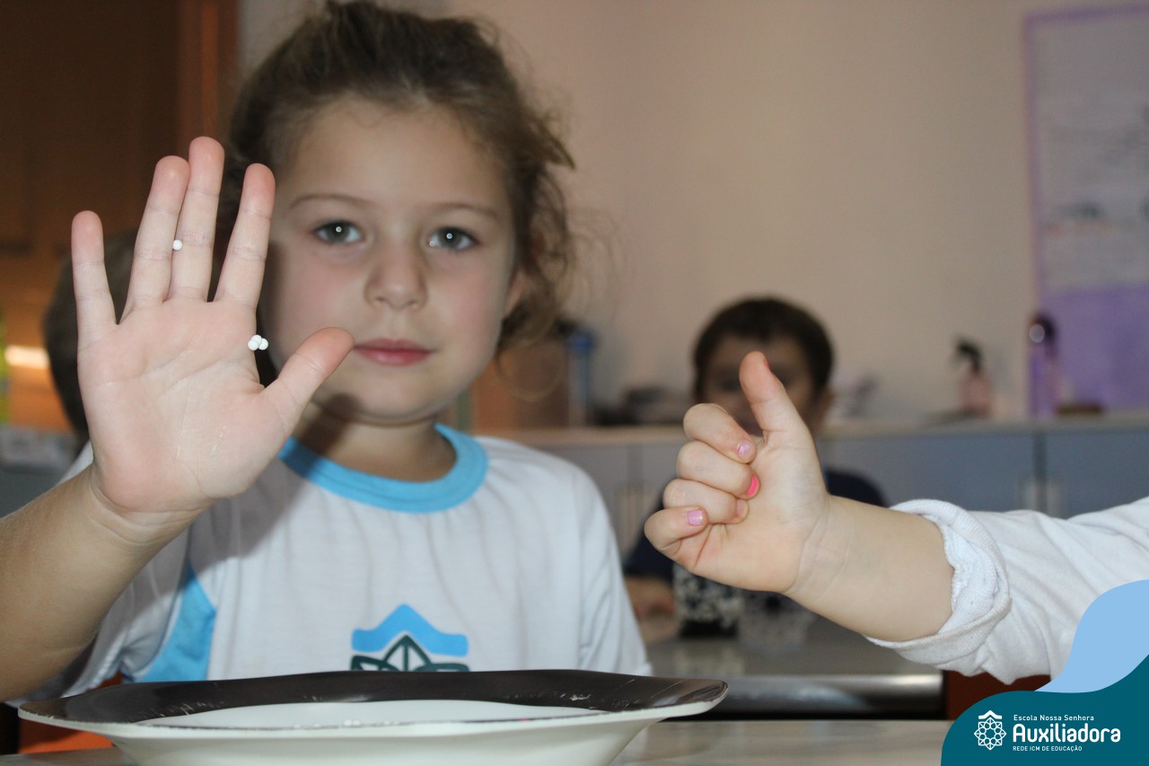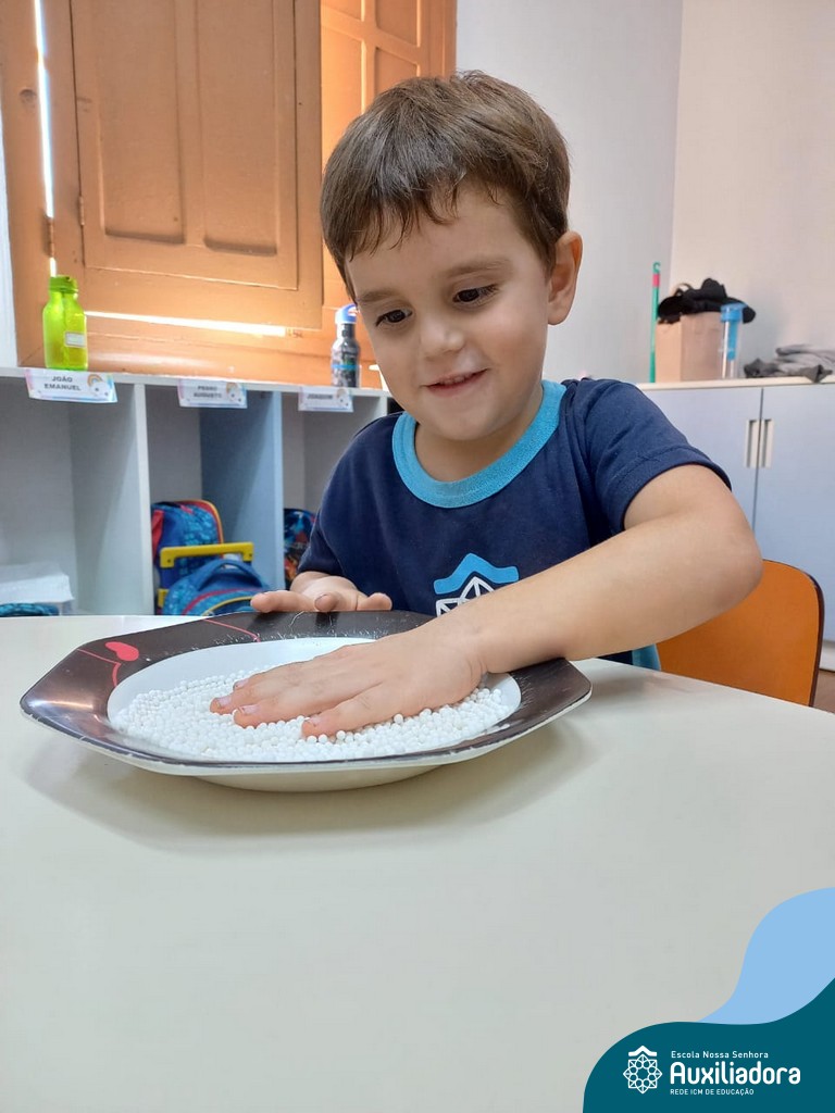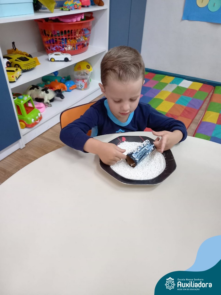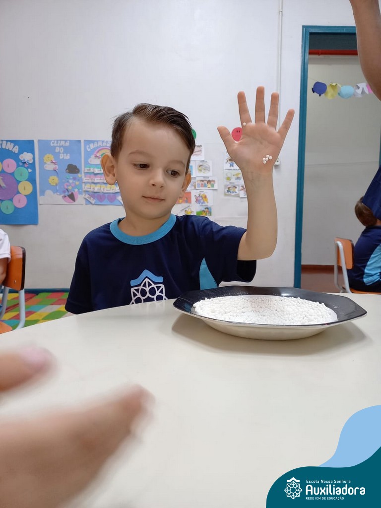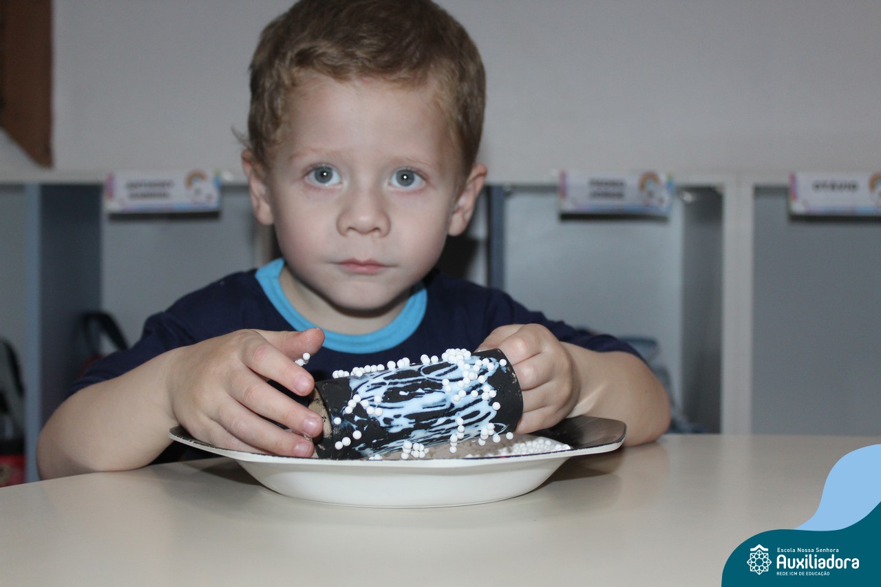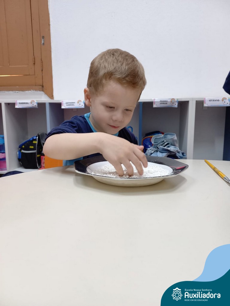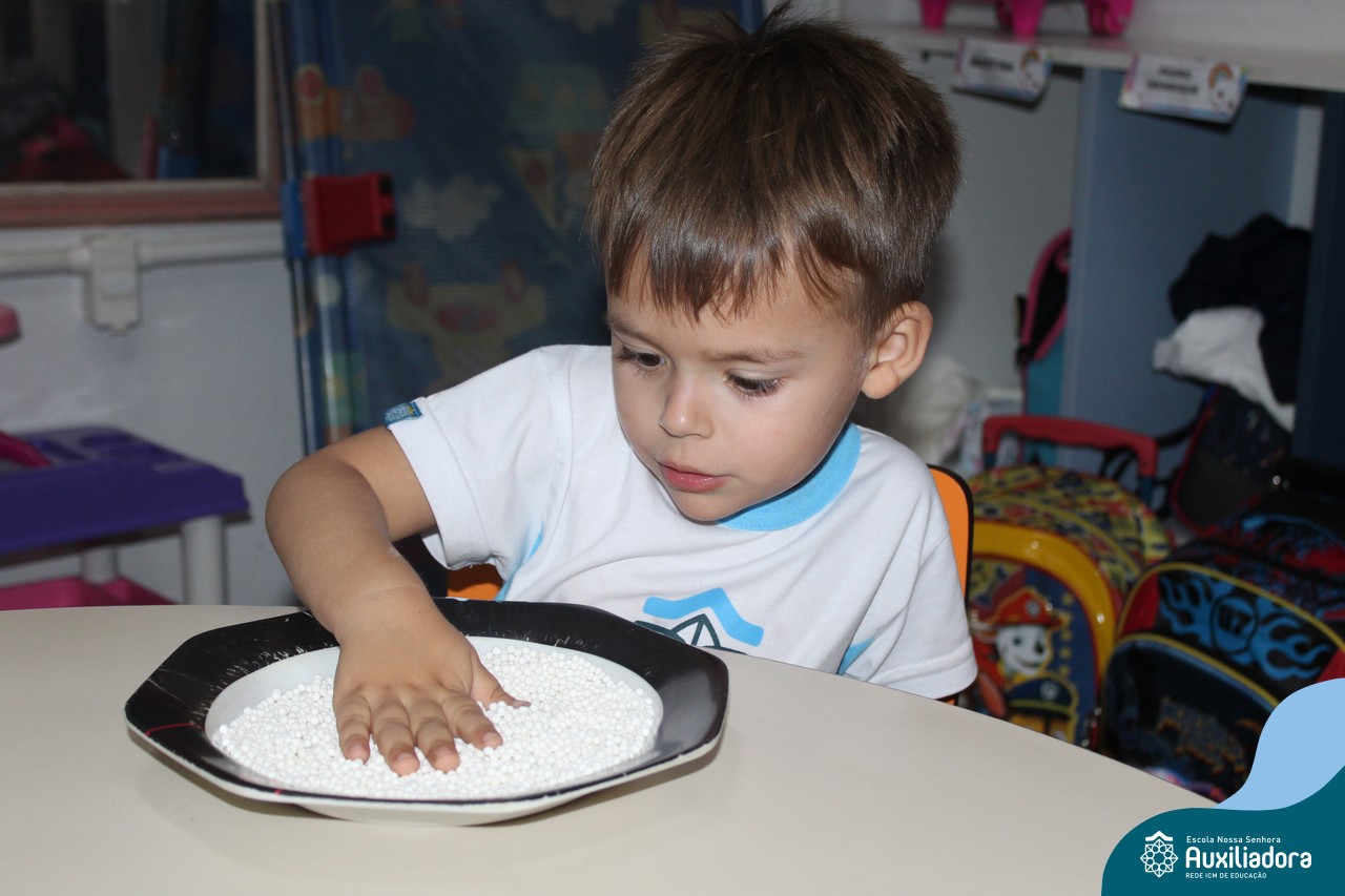 O Maternal 2 C, em registro a história “Maria vai com as outras”, construiu suas “Marias”. Essa atividade foi desenvolvida com o intuito de trabalhar a concentração, motricidade fina e o sensorial das crianças, que se divertiram muito com a colagem das bolinhas de sagu.