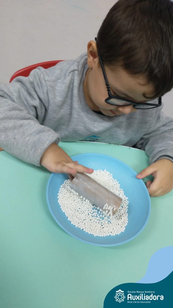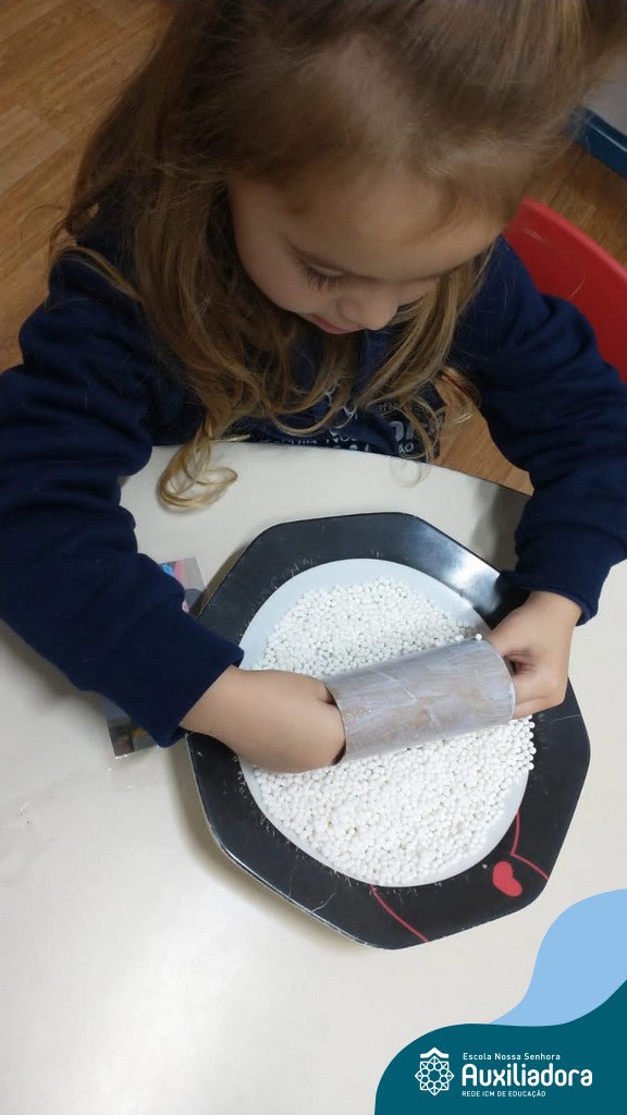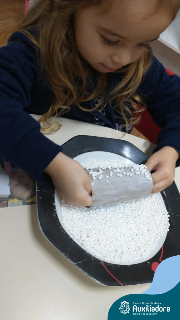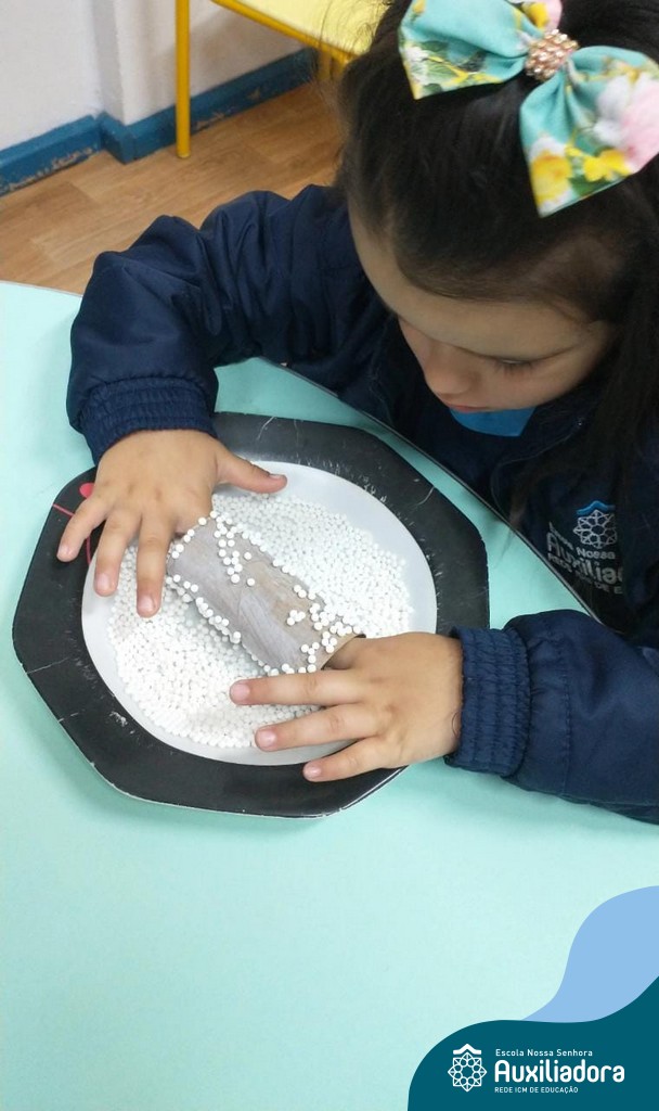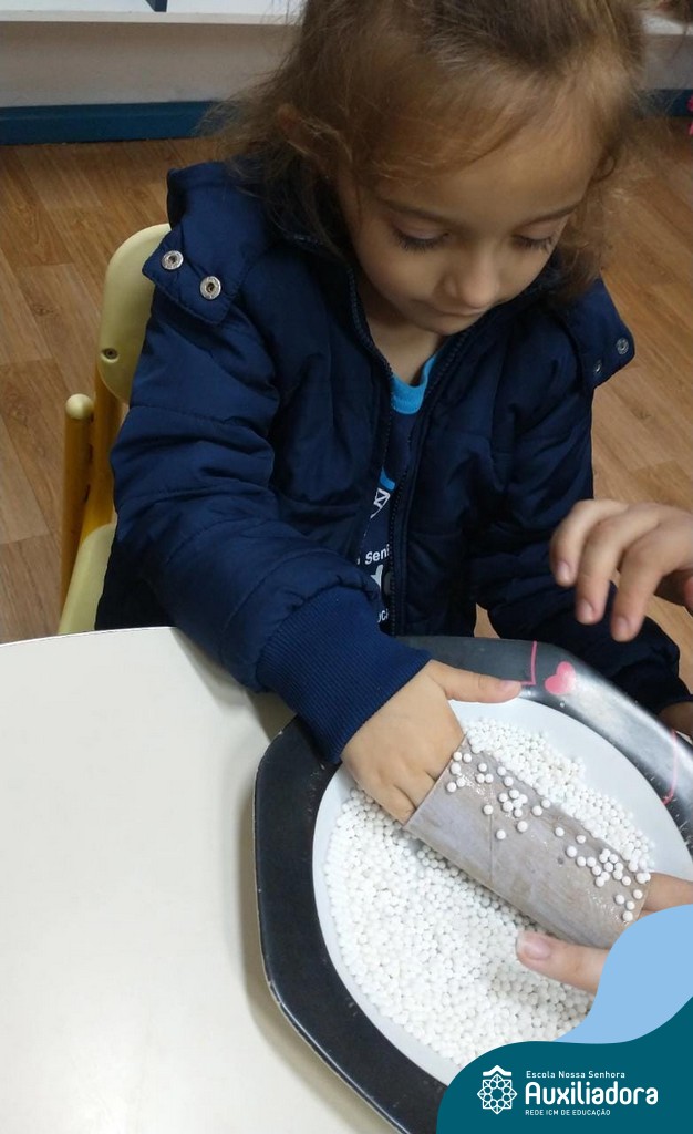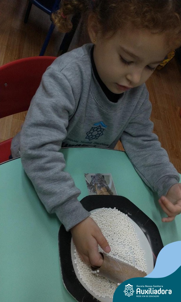 O Maternal 2 C, em registro a história “Maria vai com as outras”, construiu suas “Marias”. Essa atividade foi desenvolvida com o intuito de trabalhar a concentração, motricidade fina e o sensorial das crianças, que se divertiram muito com a colagem das bolinhas de sagu.